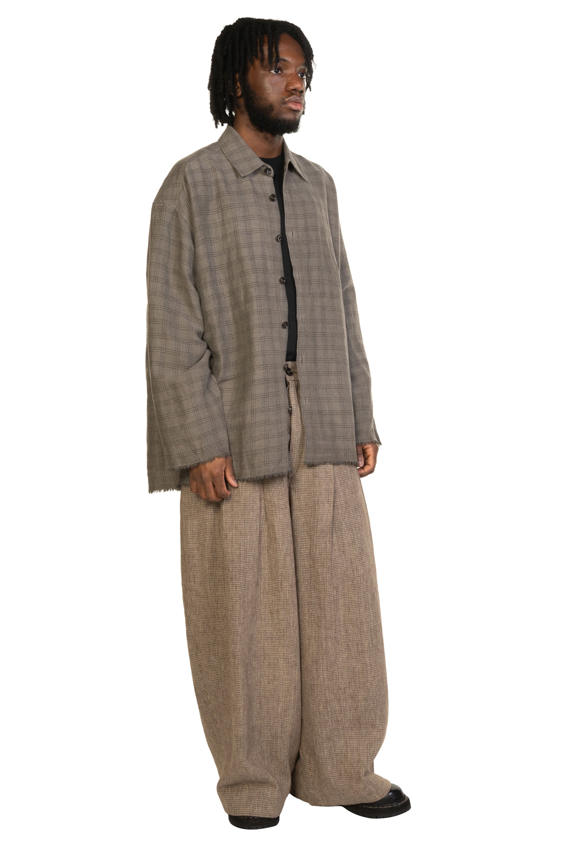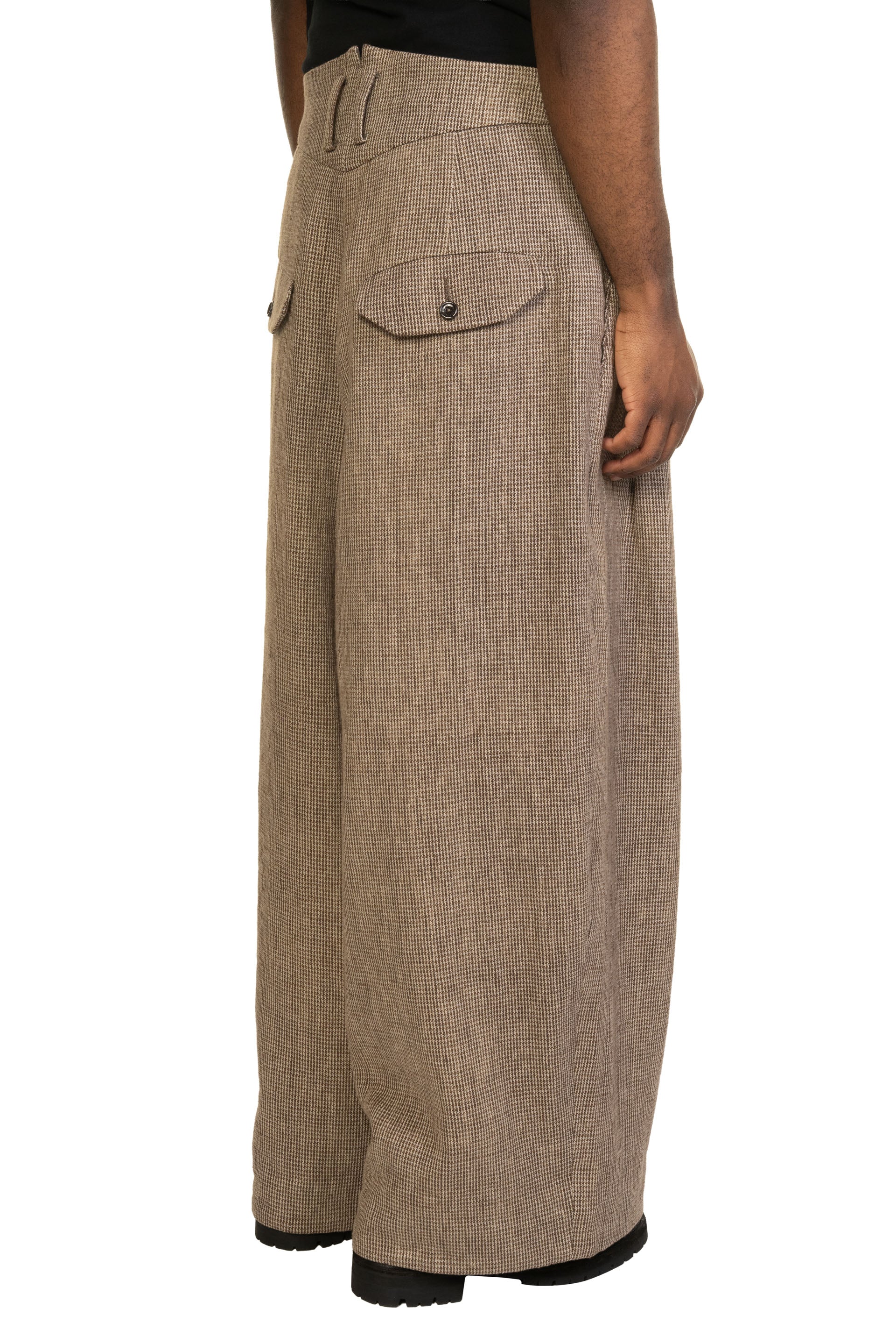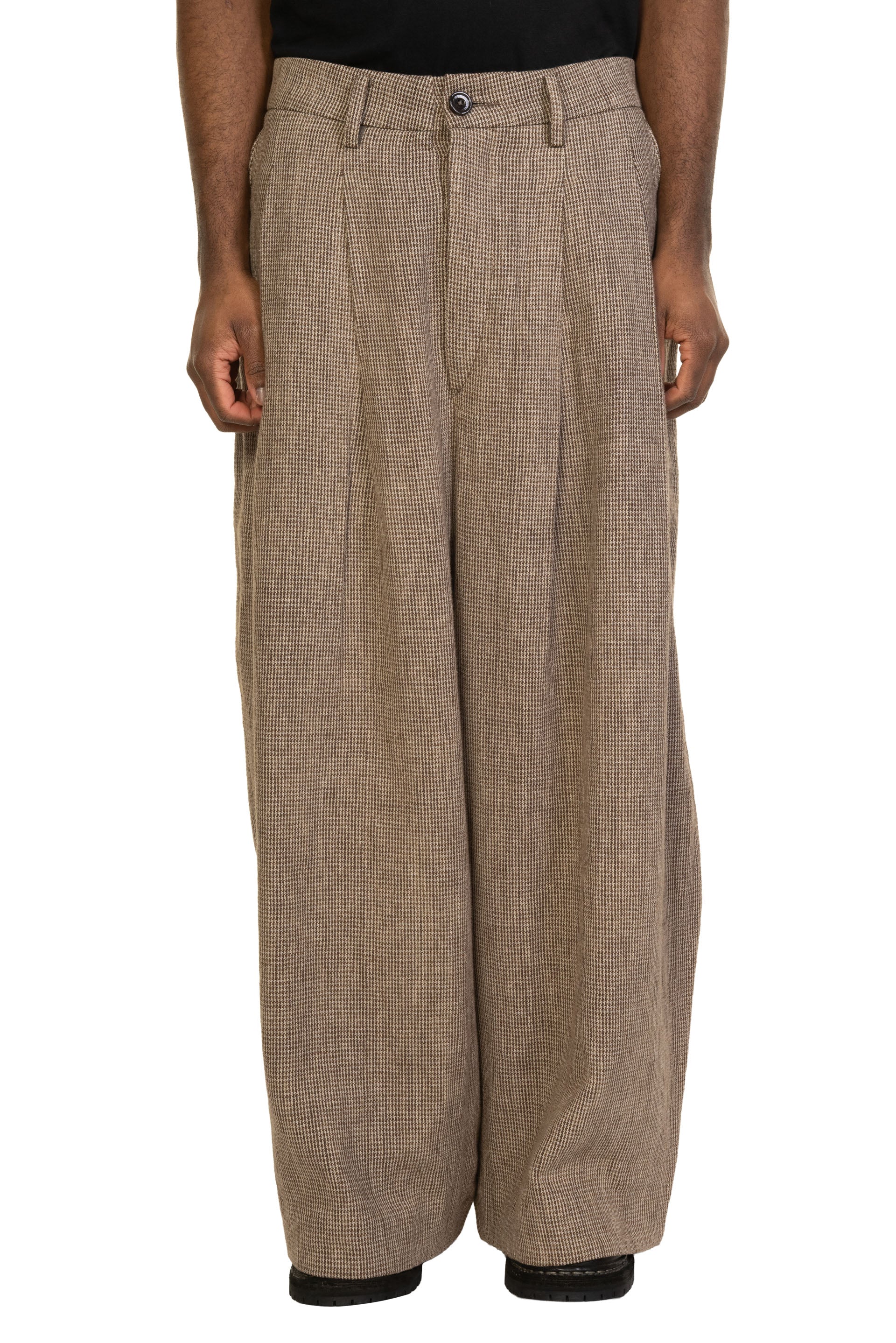Capturing the textures, patterns, and sculptural forms of everyday life, ATE SIMO reassembles these elements into garments that feel both grounded and quietly powerful, celebrating the essence of natural material and human touch as seen with the Double Pleated Wide Leg Pants Houndstooth.