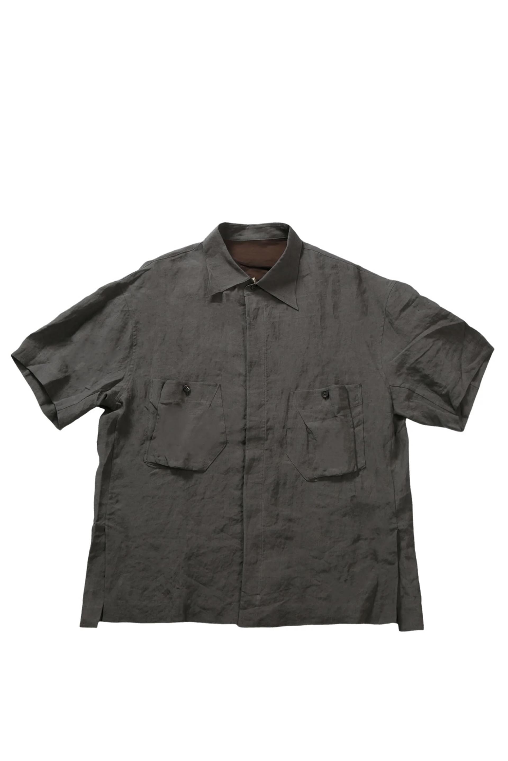 Ziggy Chen linen short sleeve shirt. Short sleeves. Button closure at front. Oversize fit. Slit at side. New seasonal collar details. Pleated at back. Two double pocket at chest. Rich grey colour in a soft textural linen fabric.