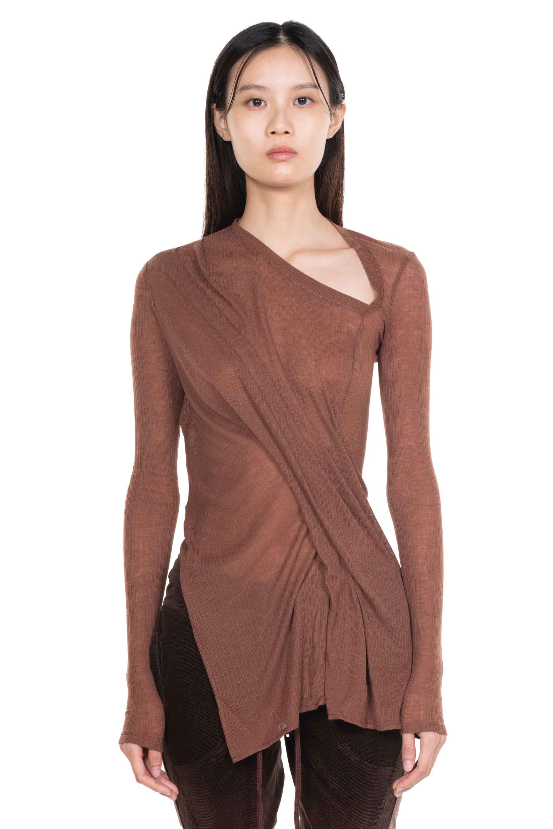 This draped asymmetric top is made from ribbed wool-Tencel blend, offering a soft and comfortable handle with rich colour. The asymmetrical neckline cleverly frames the décolletage and visually elongates the neck. The draping technique creates a natural cascading effect at the front, exuding relaxed elegance while defining your waist.