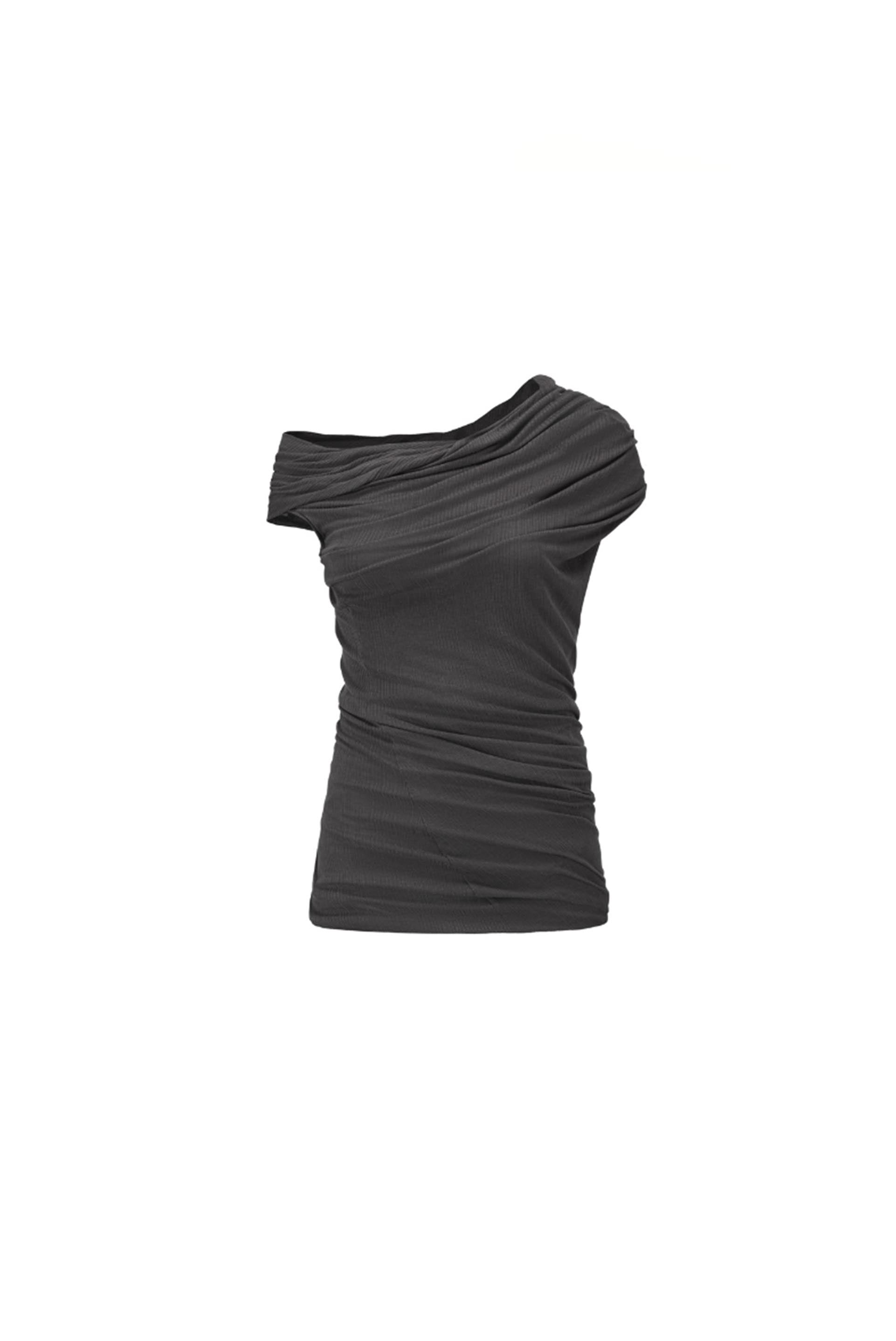 Draped One Shoulder Stretch Ribbed Top Dark Grey