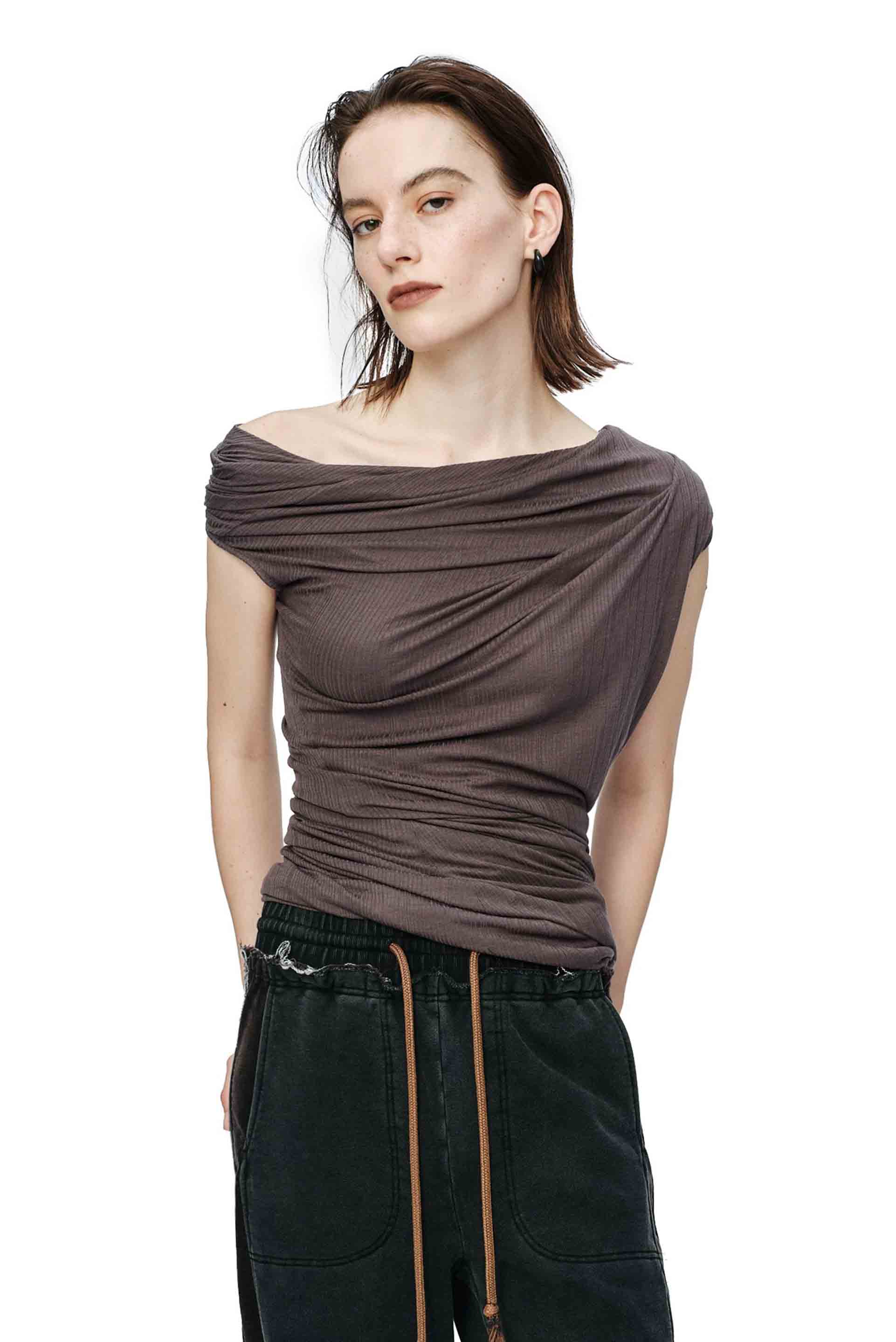 Knitted from a lightweight, soft, and stretchy Tencel–wool blend, this ribbed top wraps around the shoulder in a sculptural, deconstructed silhouette. The designer’s twisting and deconstructive technique creates organic draping that feels relaxed yet refined. The asymmetric shoulder line beautifully frames the neck and shoulders, highlighting an elegant and elevated feminine allure.