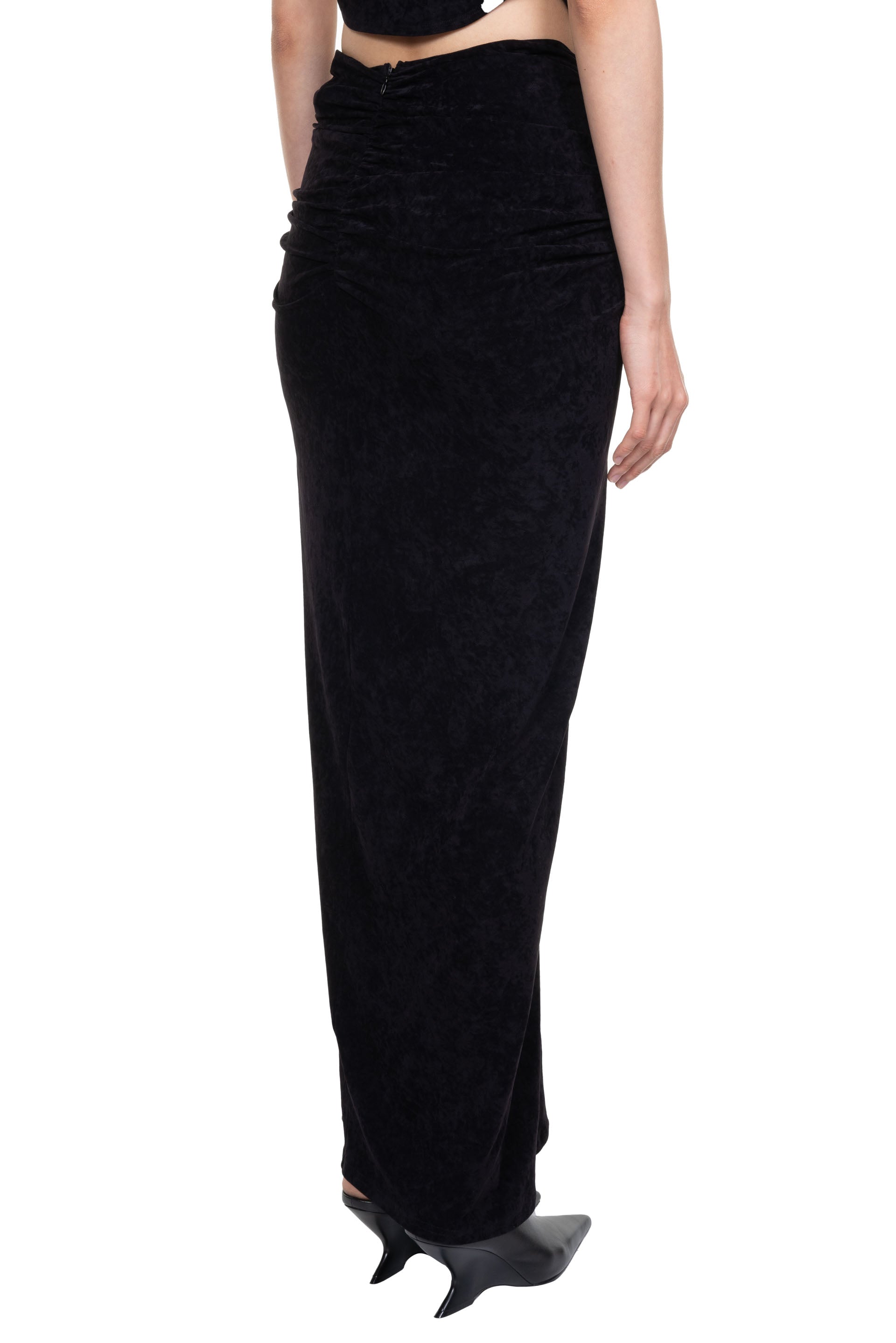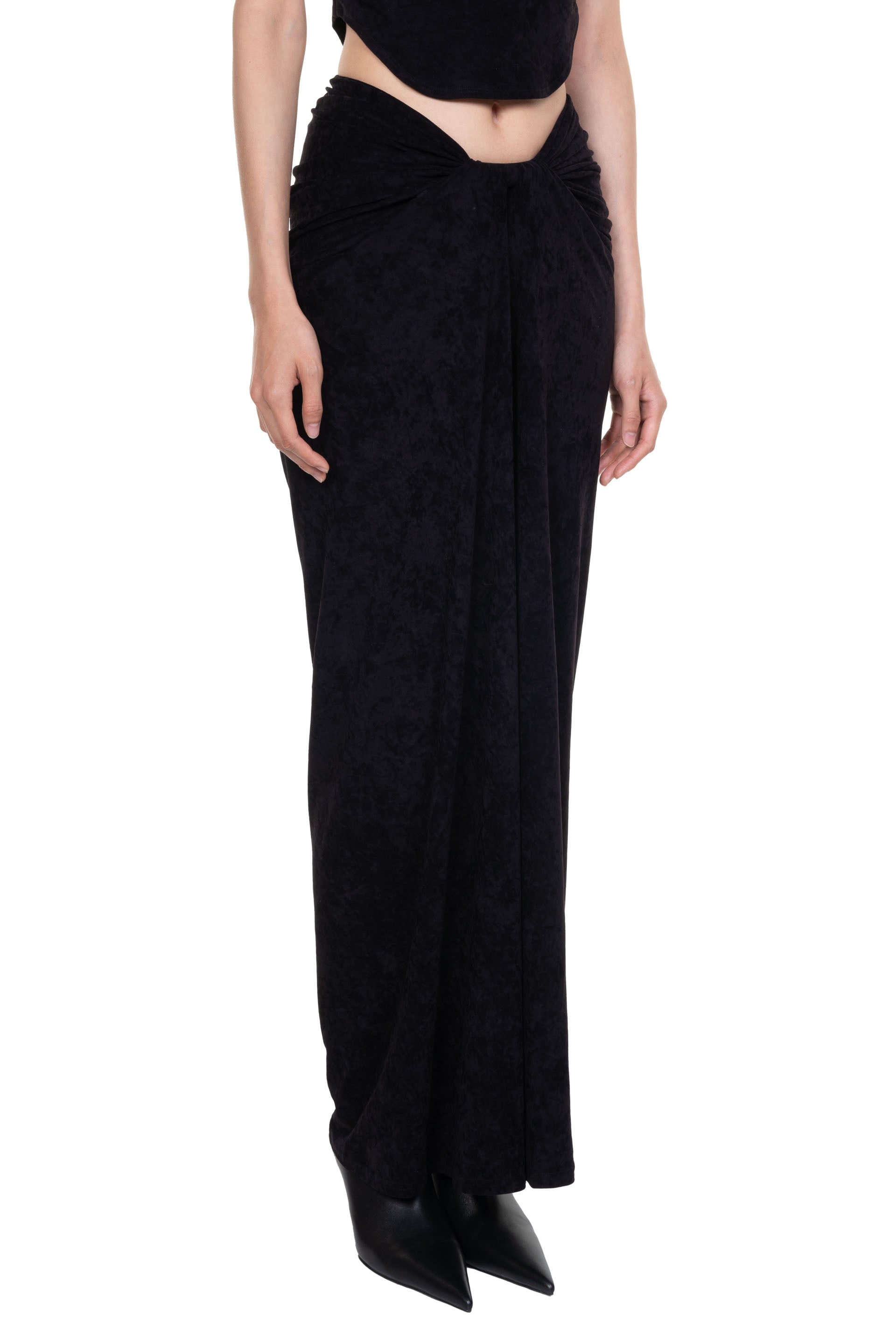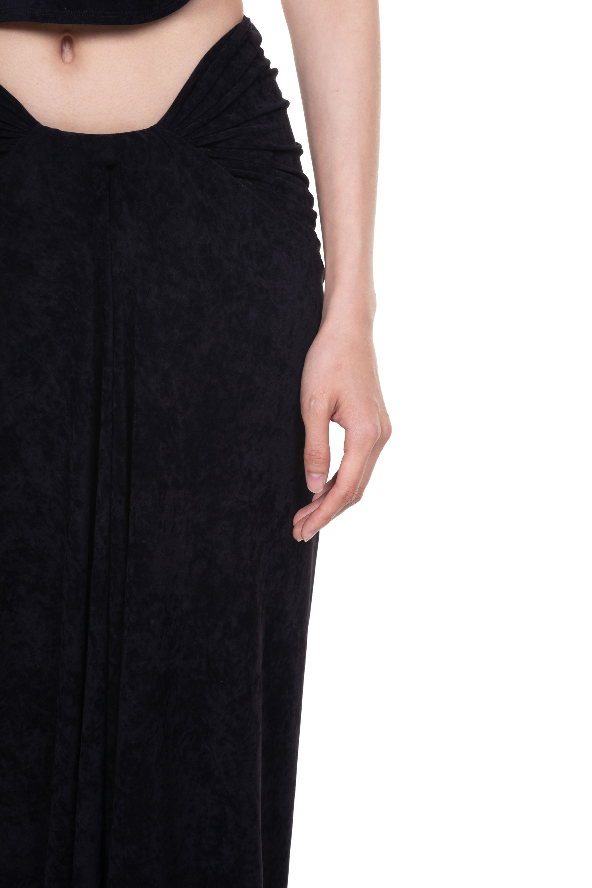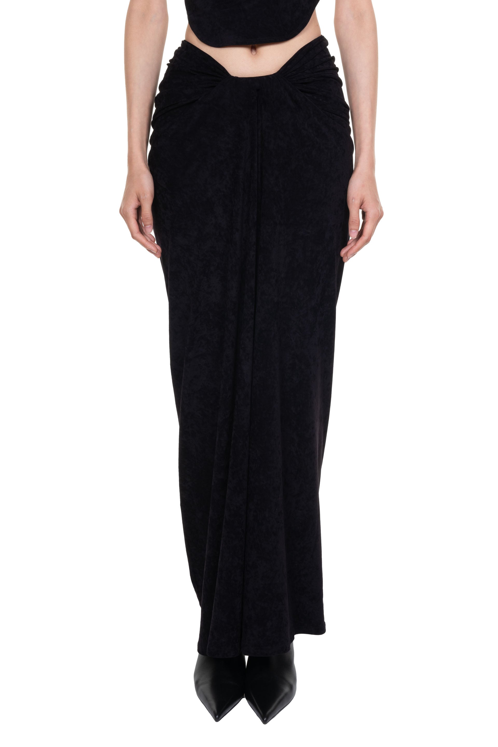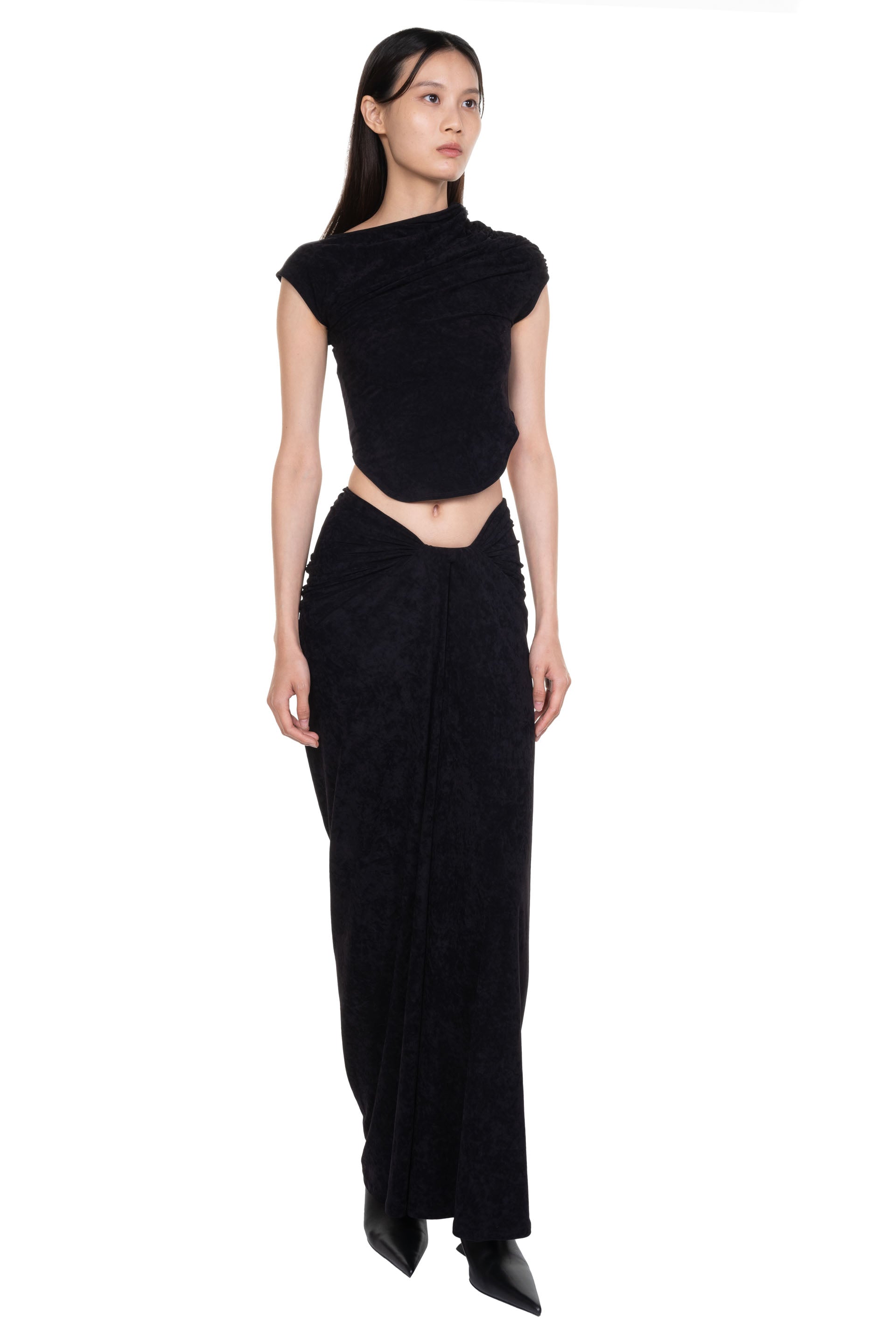 OUDE WAAG strikes a balance between Asian aesthetics and Western cutting. It is at the heart of designer’s philosophy: celebrating the power of women, yet simultaneously critiquing the ongoing objectification and idealisation of the body as you can see in the Oude Waag "Burn" collection with the Draped Velvet Jersey Skirt Black.