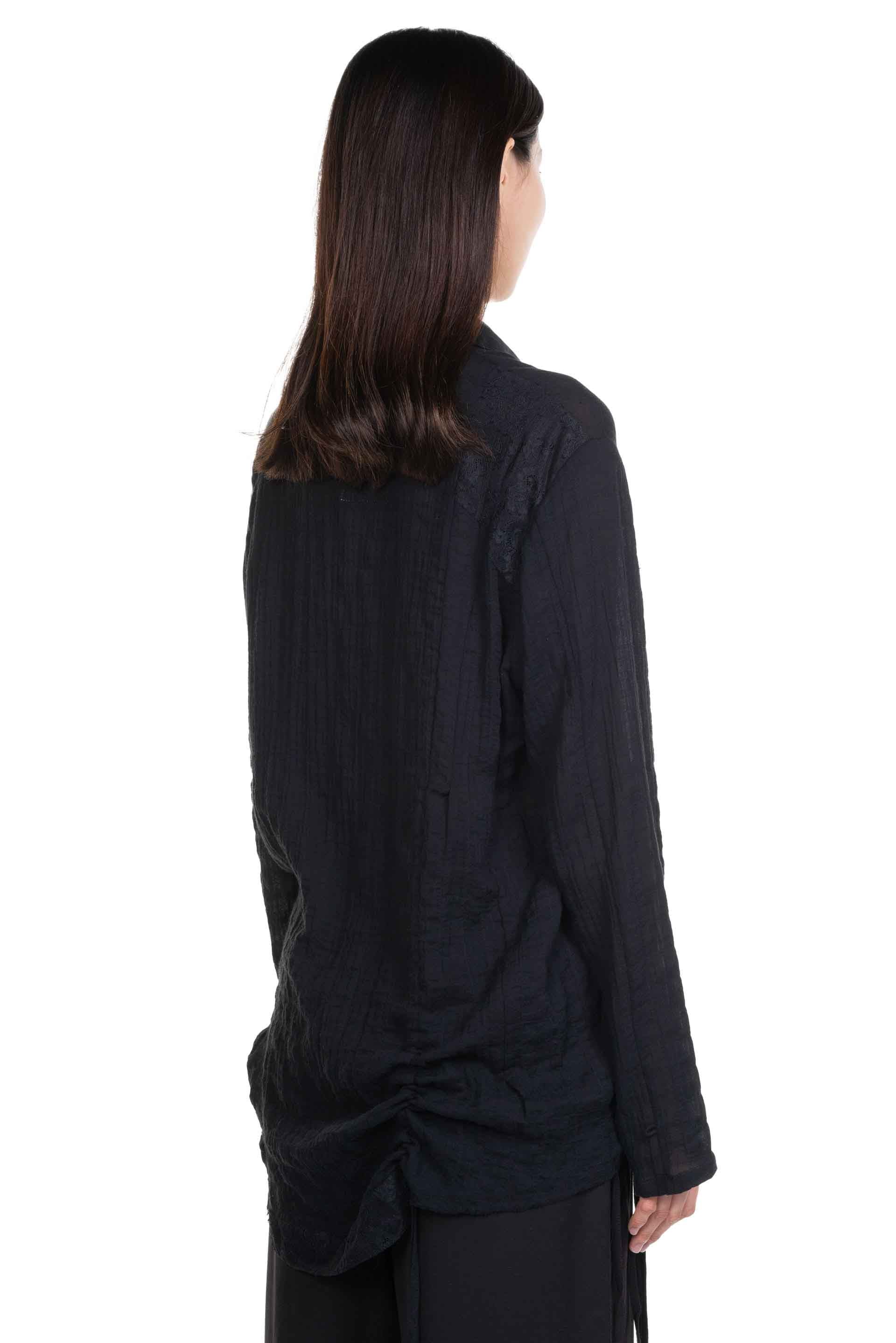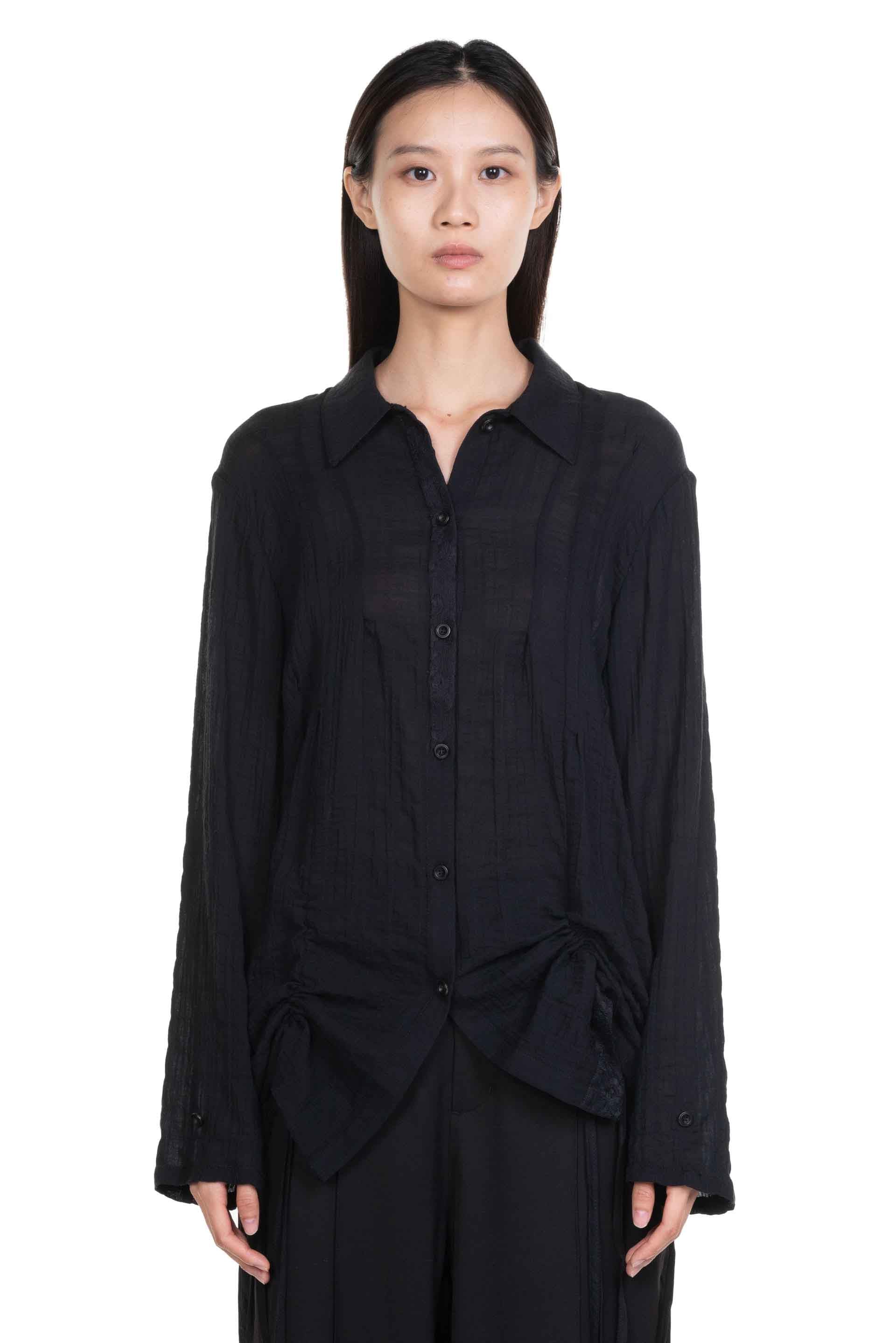 Black Drawstring Shirt from Professor e. Long sleeves. Button closure at front. Pleated at front and back. Button at cuffs. Panelled construction. Drawstring details at back at front.