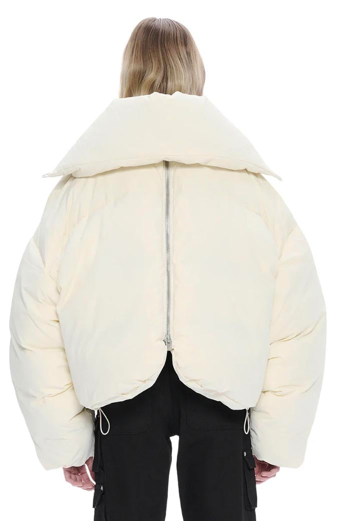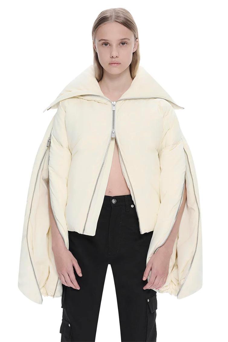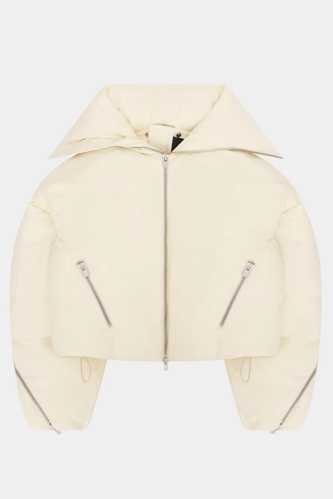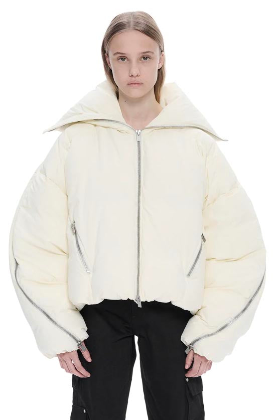Cropped nylon down jacket. Curved zipper detail on sleeves and body that allows multiple styling variations. Curved zip detail in sleeves. Cropped fit with longer sleeves. Drawstring adjusters at sides. Double zip closure.