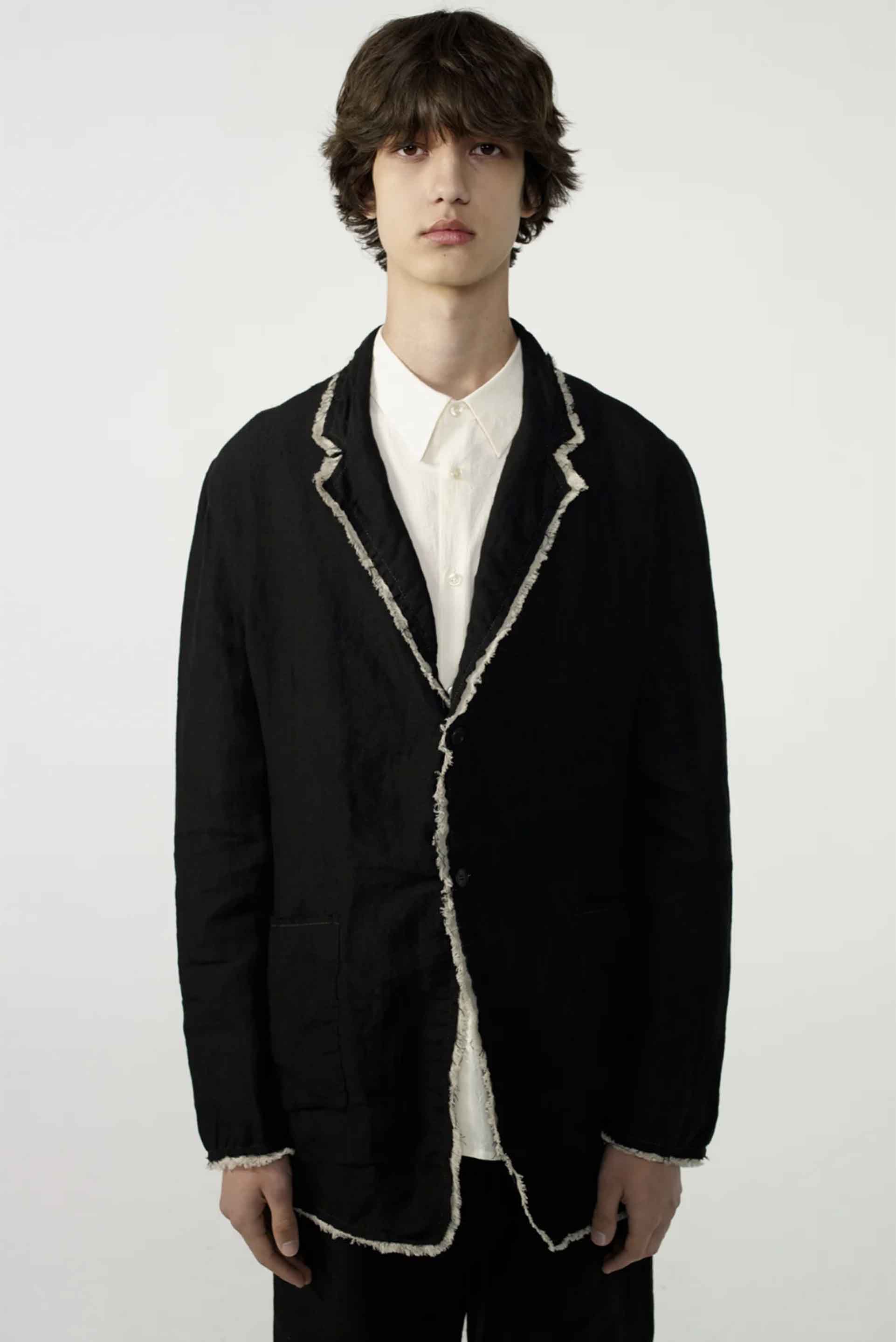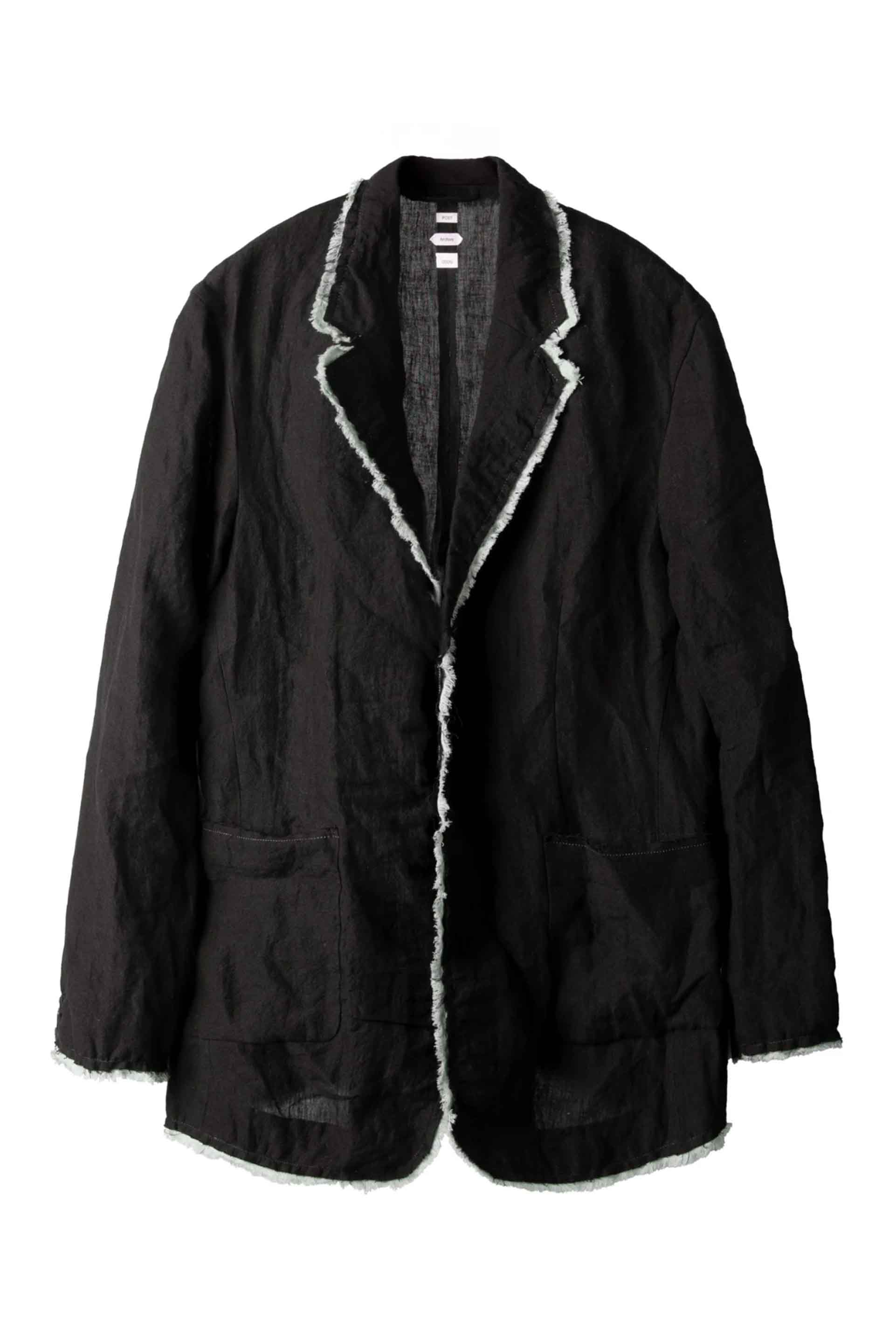 Notch lapel jacket. Unstructured tailoring. Raw edge linen fabric. Buttoned cuffs. Dual front patch pockets. Suit set with Drifter Single Trousers (2026). Relaxed fit. Fabric from South Korea.