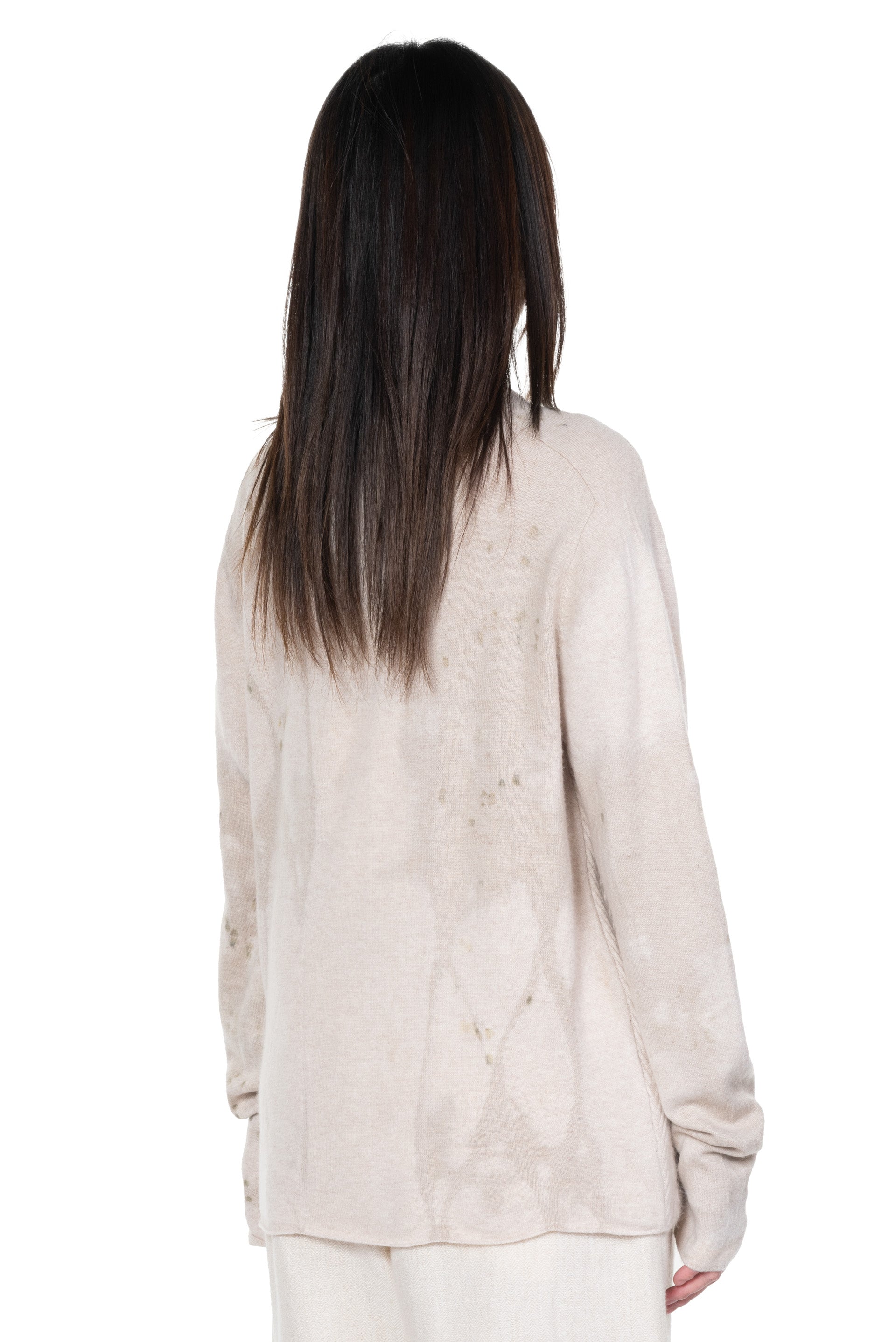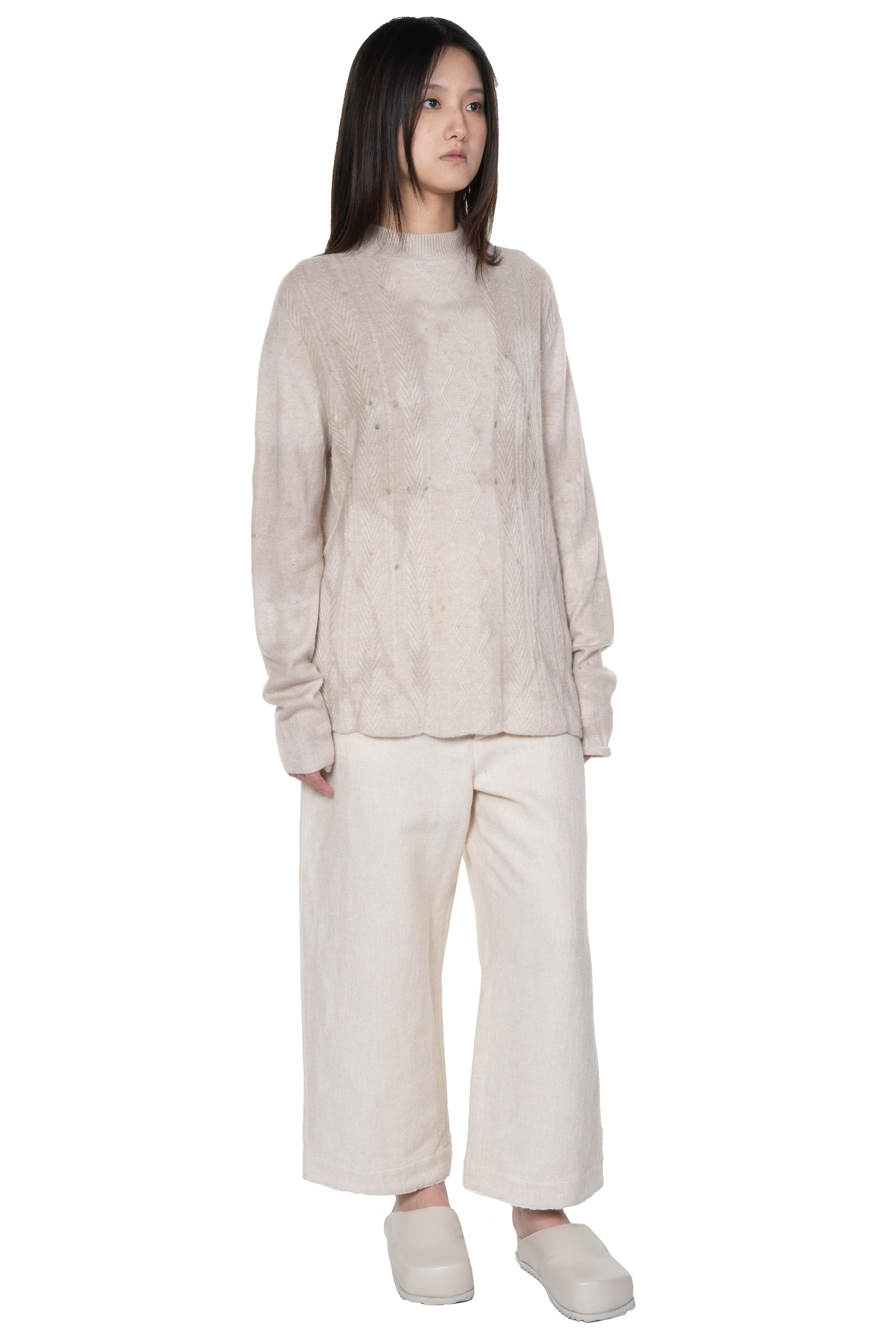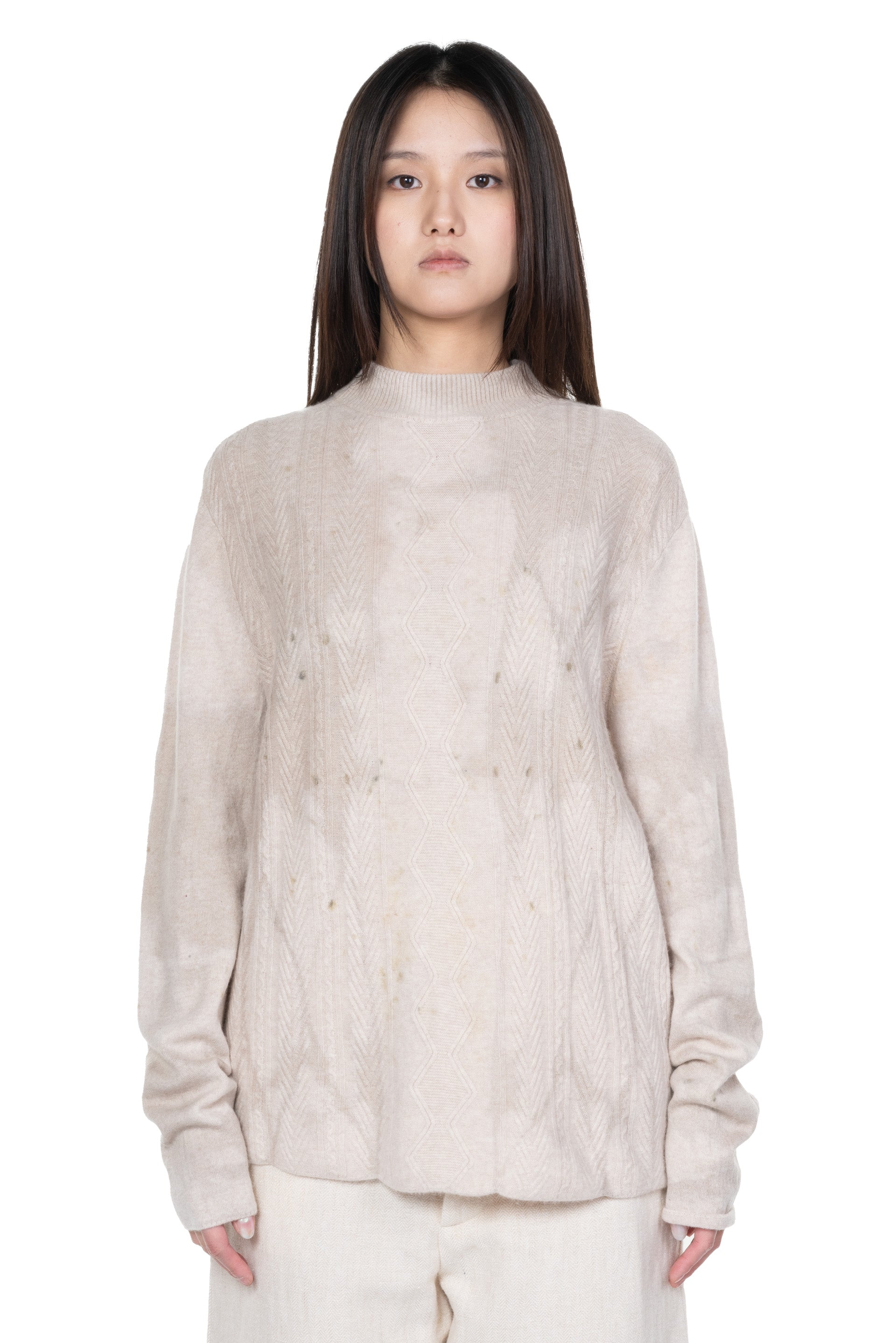 Yu Qun believes that everyone's character is multi-faceted and expressing spiritual independence. Fine hand-stitched threads, old mottled colours and patterns, and unconventional cuts are what Mute Dance has been exploring. The leaves and stems of fresh plants and berries, dried medicinal materials, old metals and so on are combined with the ancient and traditional dyeing technology to dye fabrics and paper as seen with the Dyed Cable Knit Sweater.