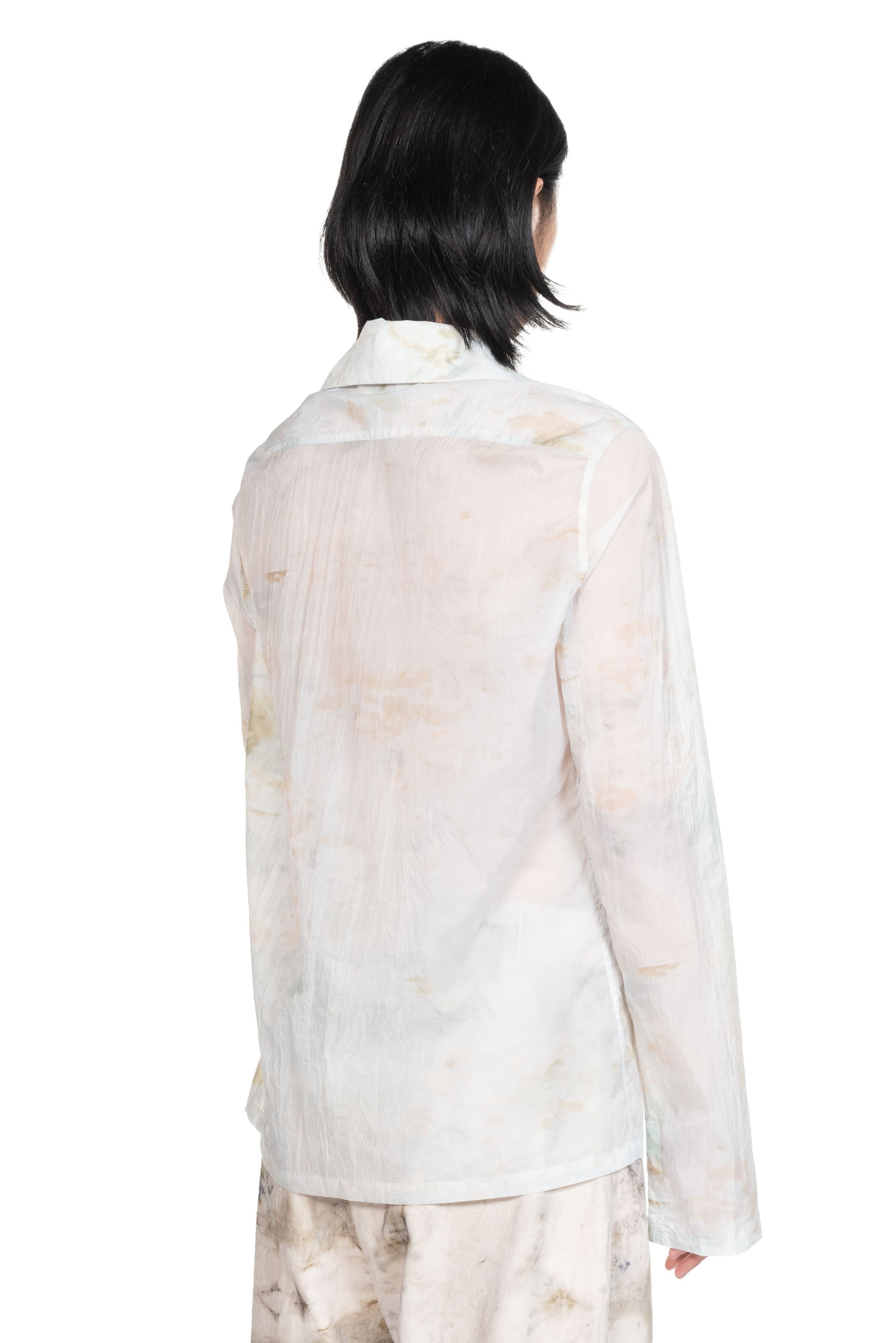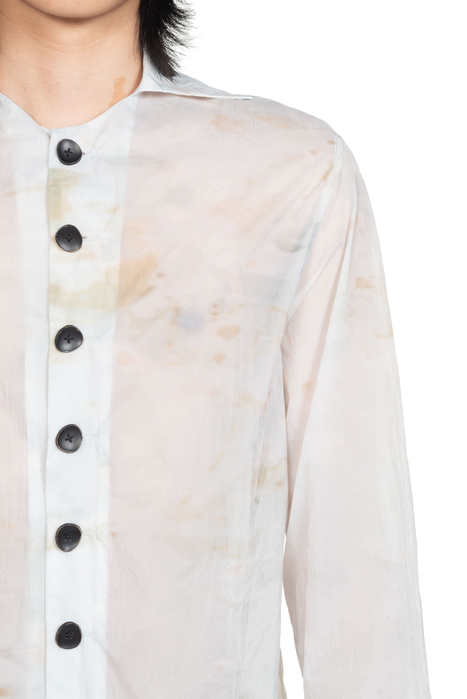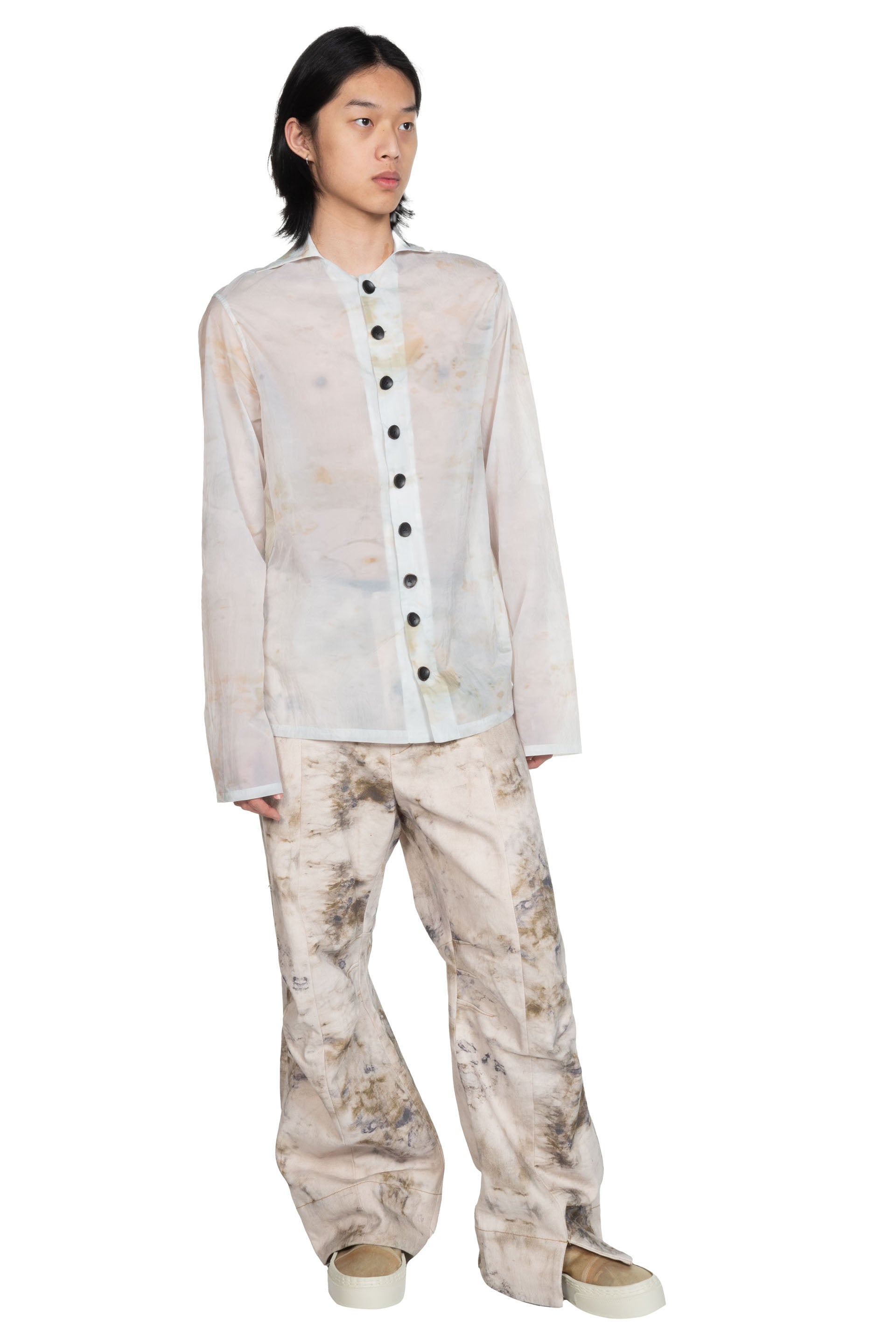Peng Tai creates modern silhouette with traditional chinese philosophy. Inspired by how Chinese herbal medicine regulates the body from the inside out, Peng Tai aims to research and develop a way to boil Chinese herbal medicine with fabrics, to create clothes that feel like a second skin as seen with the Dyed Cotton Button Shirt.