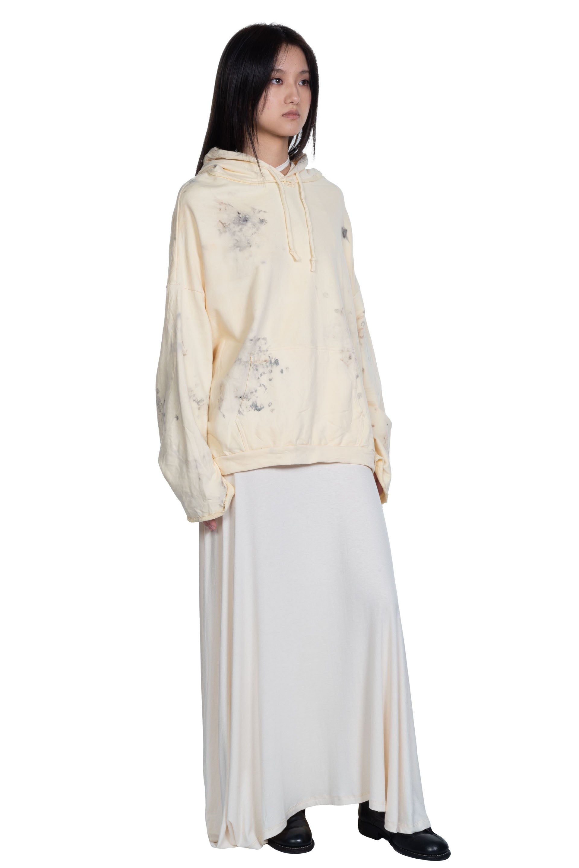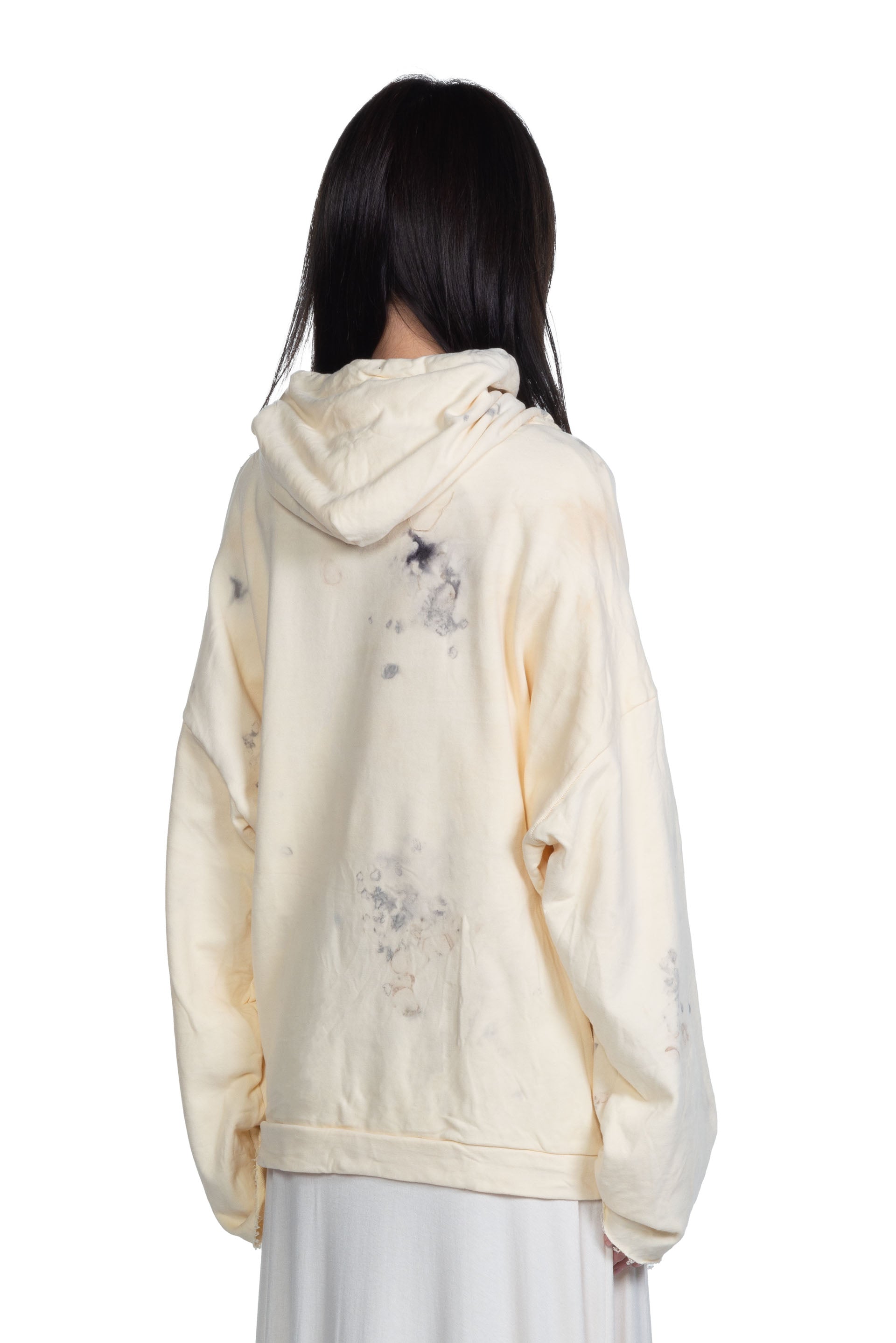 Peng Tai creates modern silhouette with traditional chinese philosophy. Inspired by how Chinese herbal medicine regulates the body from the inside out, Peng Tai aims to research and develop a way to boil Chinese herbal medicine with fabrics, to create clothes that feel like a second skin as seen with the Dyed Cotton Jersey Hoodie.