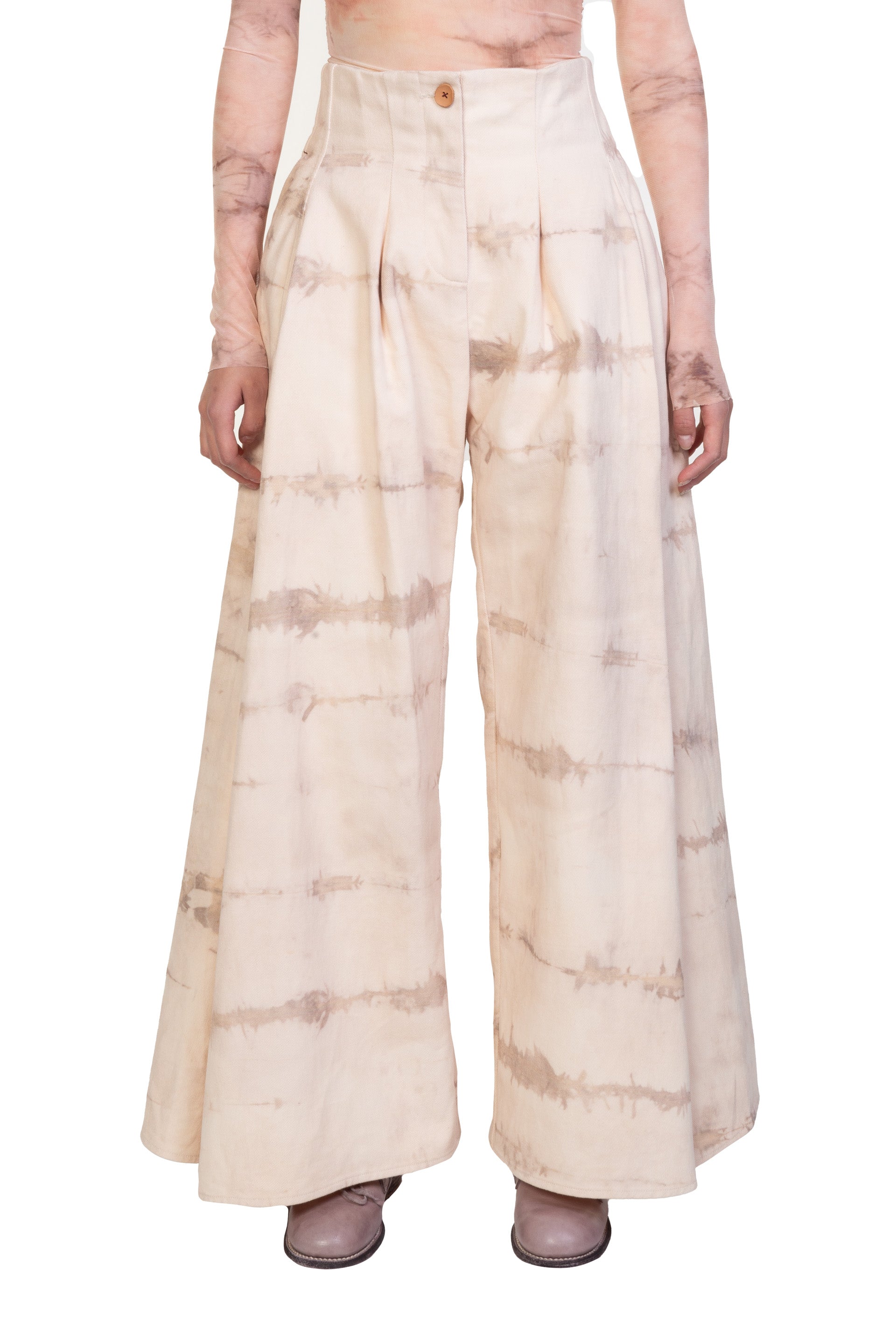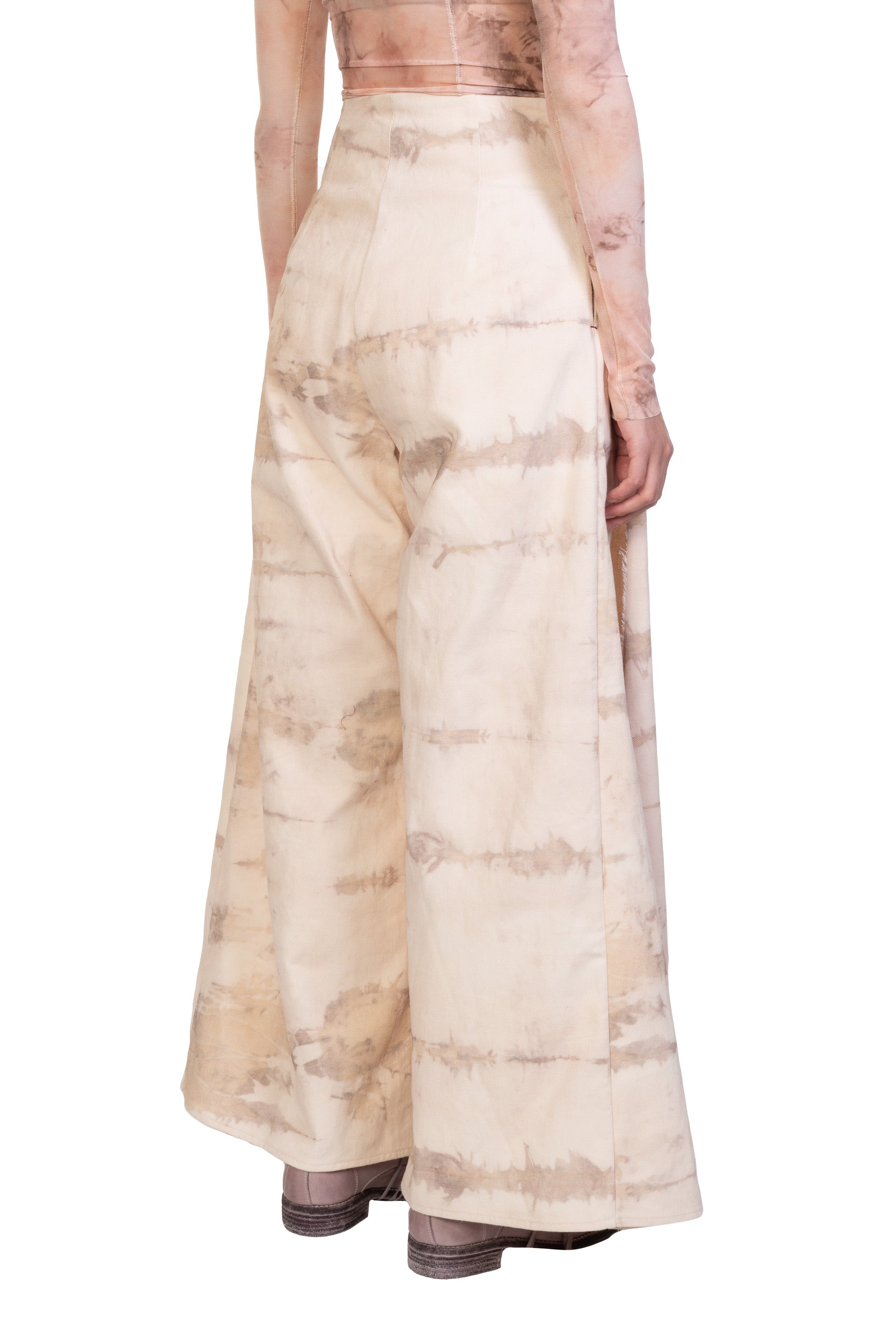 Button closure at waist. Two side pockets. Two back pockets. Leather button closure. Open side at legs. Random colour dye throughout. Random colour dye.