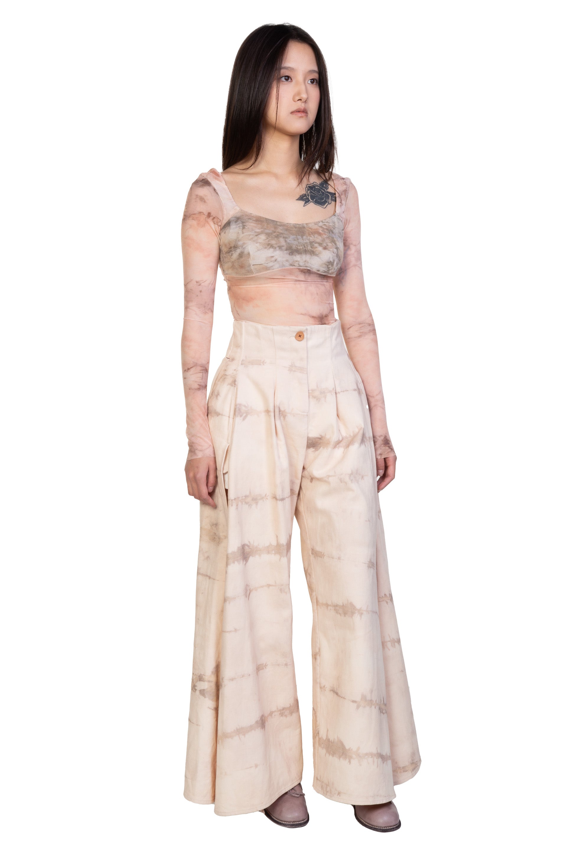 Peng Tai creates modern silhouette with traditional chinese philosophy. Inspired by how Chinese herbal medicine regulates the body from the inside out, Peng Tai aims to research and develop a way to boil Chinese herbal medicine with fabrics, to create clothes that feel like a second skin as seen with the Dyed Denim AC Pants.