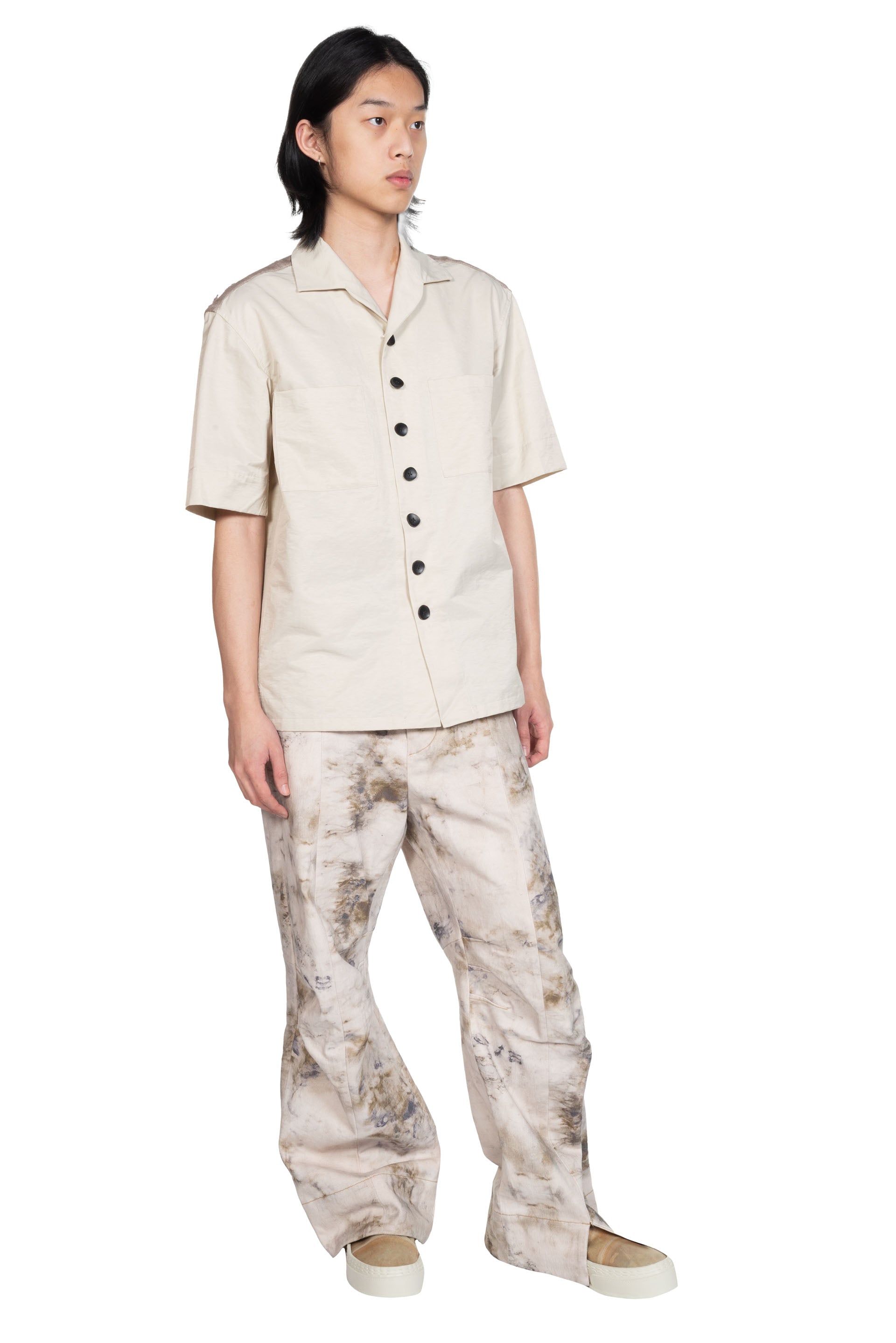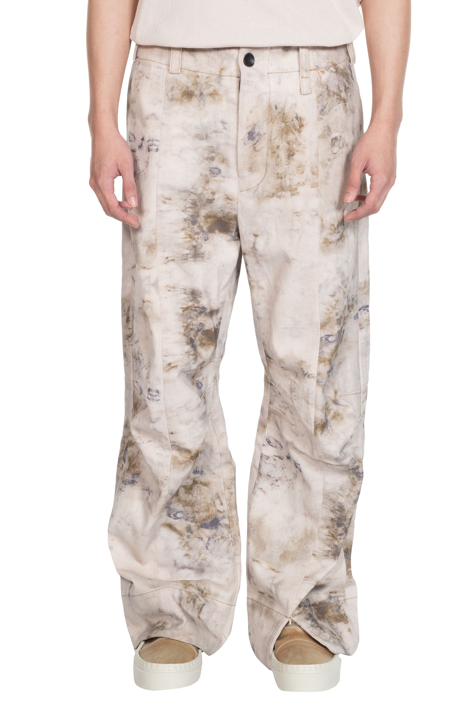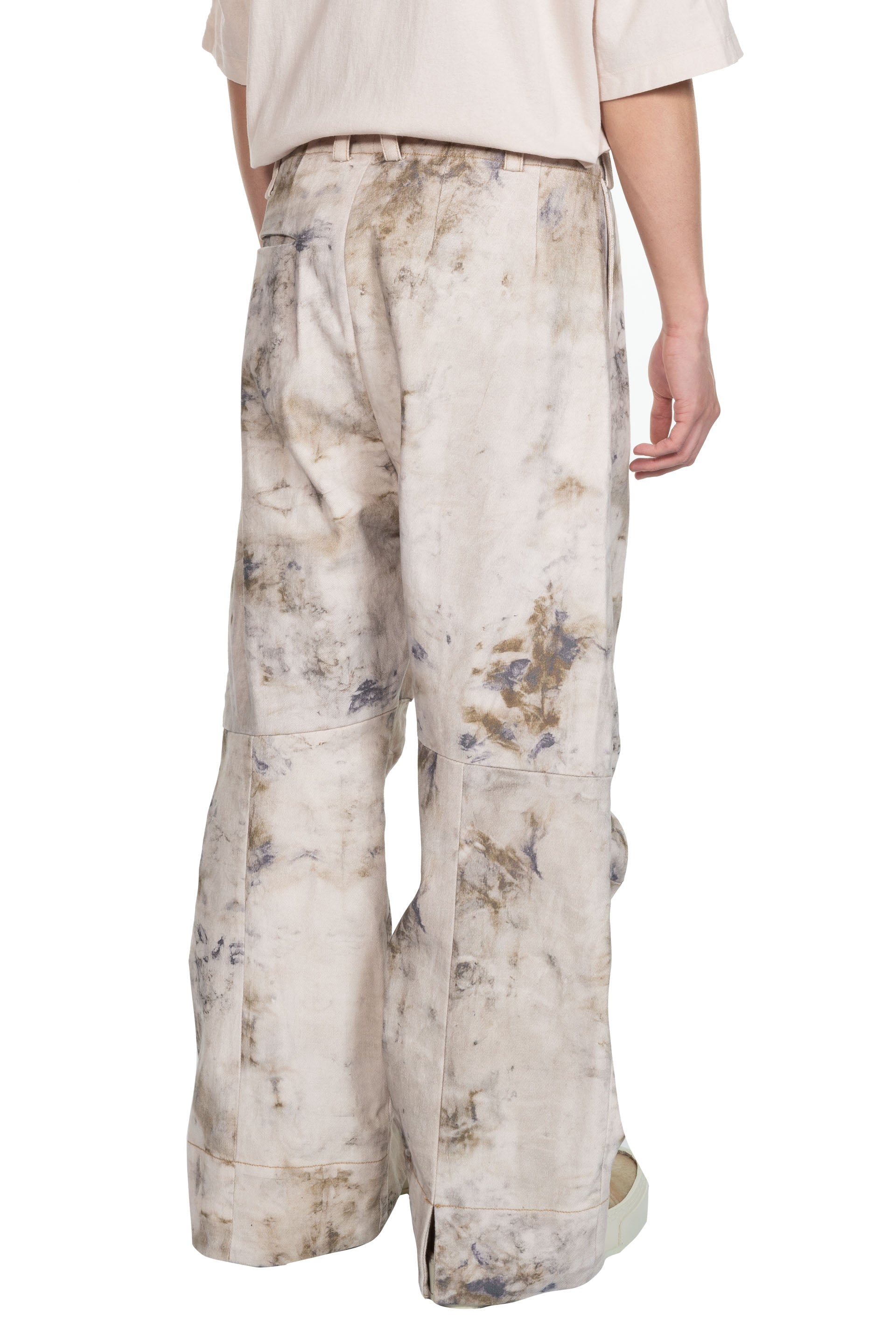 Peng Tai creates modern silhouette with traditional chinese philosophy. Inspired by how Chinese herbal medicine regulates the body from the inside out, Peng Tai aims to research and develop a way to boil Chinese herbal medicine with fabrics, to create clothes that feel like a second skin as seen with the Dyed Denim Alien Trousers.