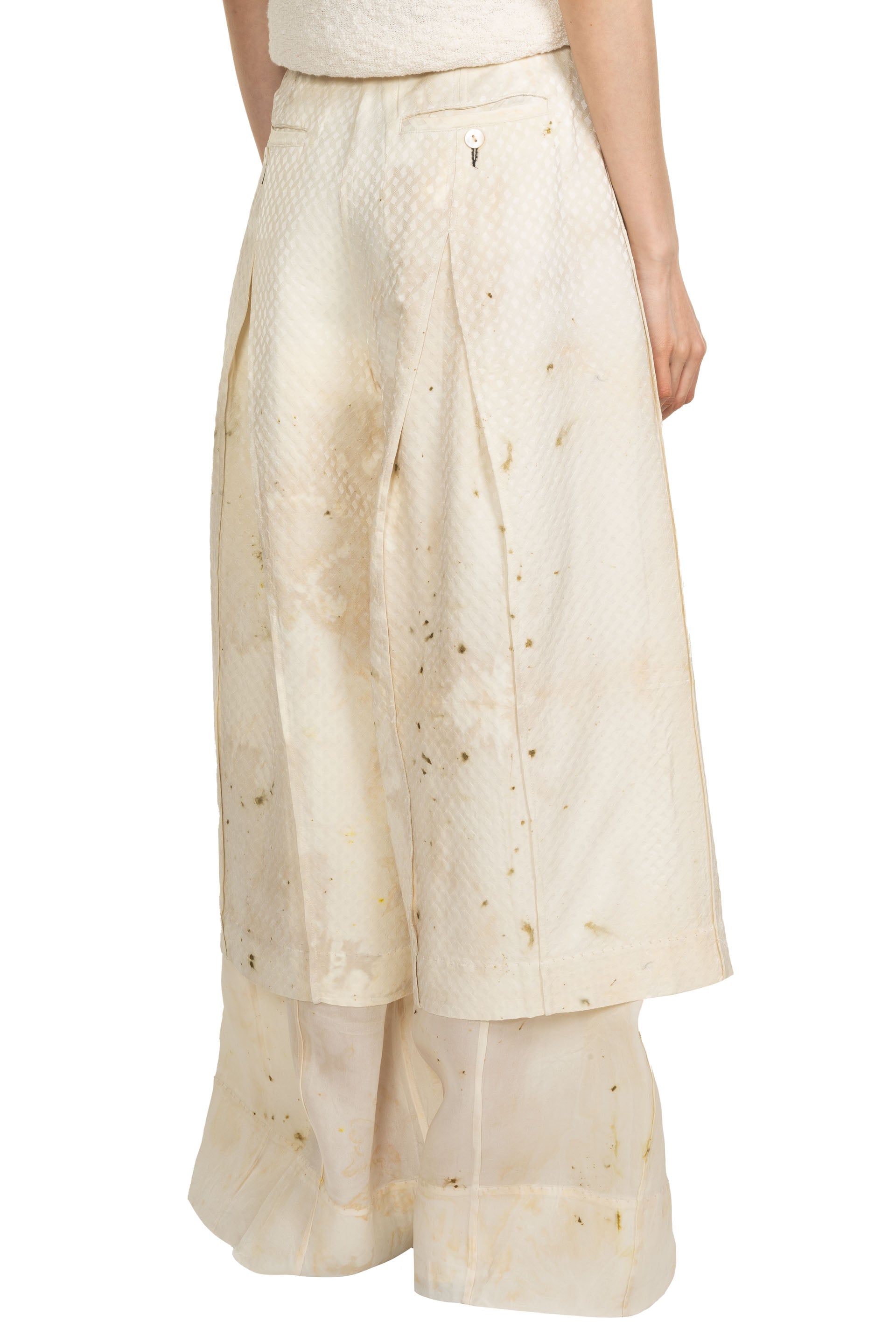 Mute Dance Dyed wool and Silk Trousers. Button closure at waist. Zip fly. Two side pockets. Soft dry feel light fabric. Signature dye throughout. Double layer details at legs.