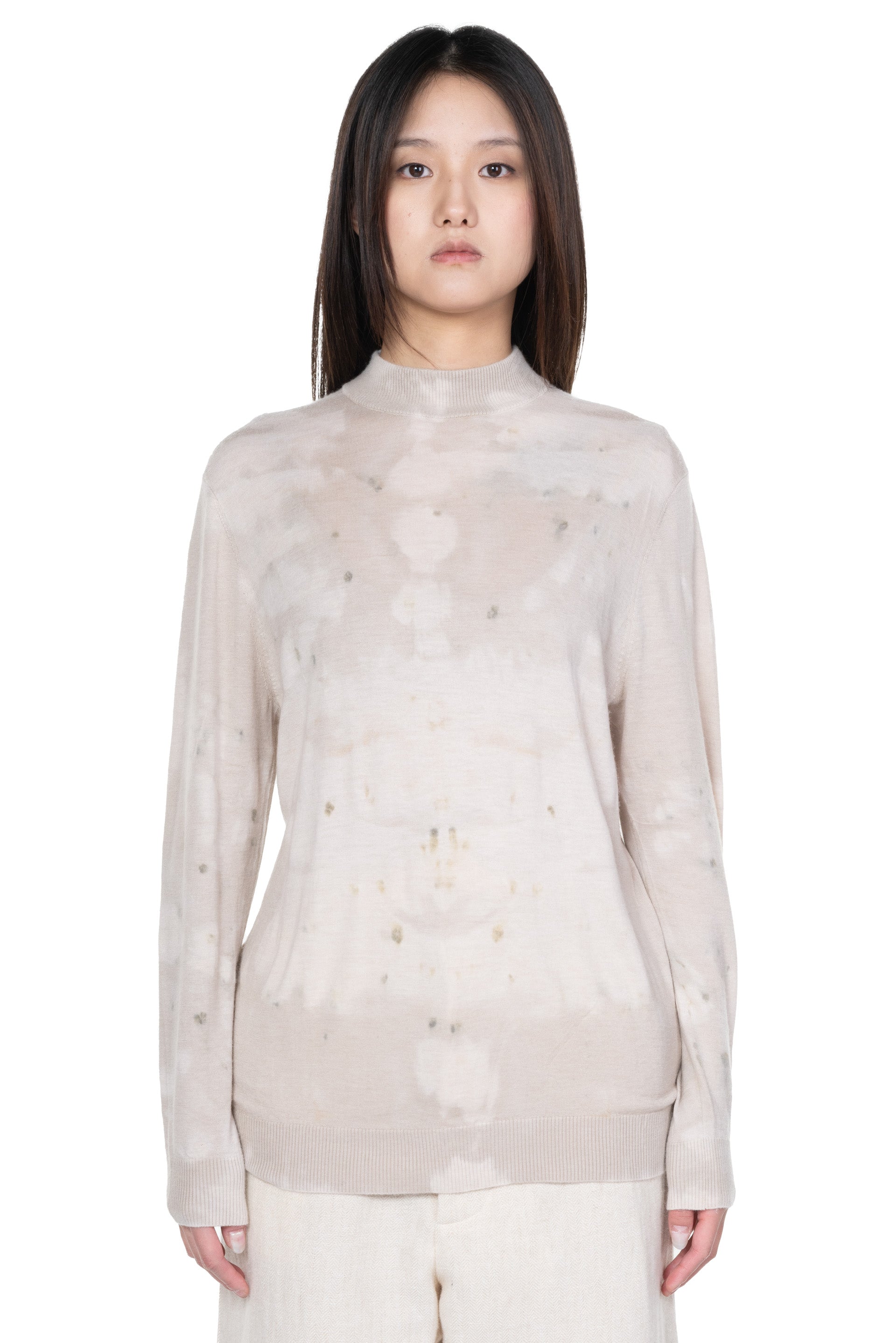 Yu Qun believes that everyone's character is multi-faceted and expressing spiritual independence. Fine hand-stitched threads, old mottled colours and patterns, and unconventional cuts are what Mute Dance has been exploring. The leaves and stems of fresh plants and berries, dried medicinal materials, old metals and so on are combined with the ancient and traditional dyeing technology to dye fabrics and paper as seen with the Dyed Sweater.