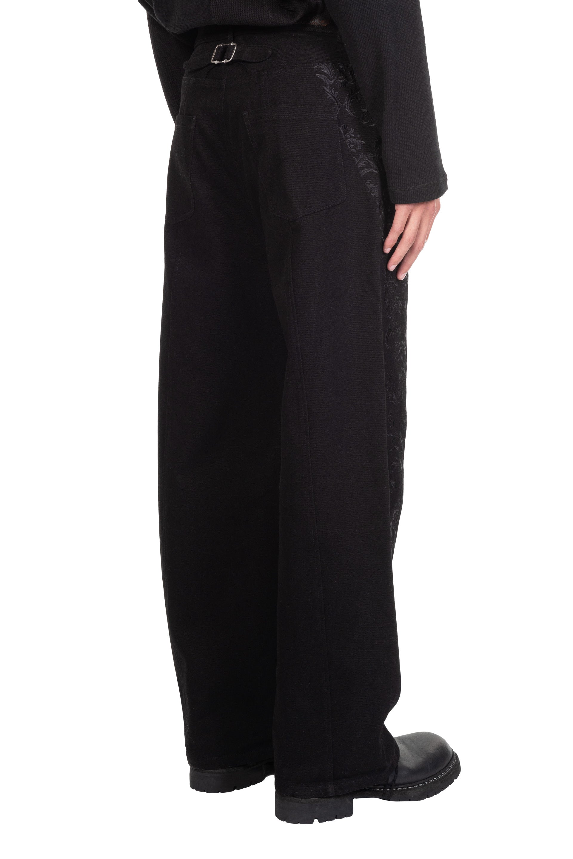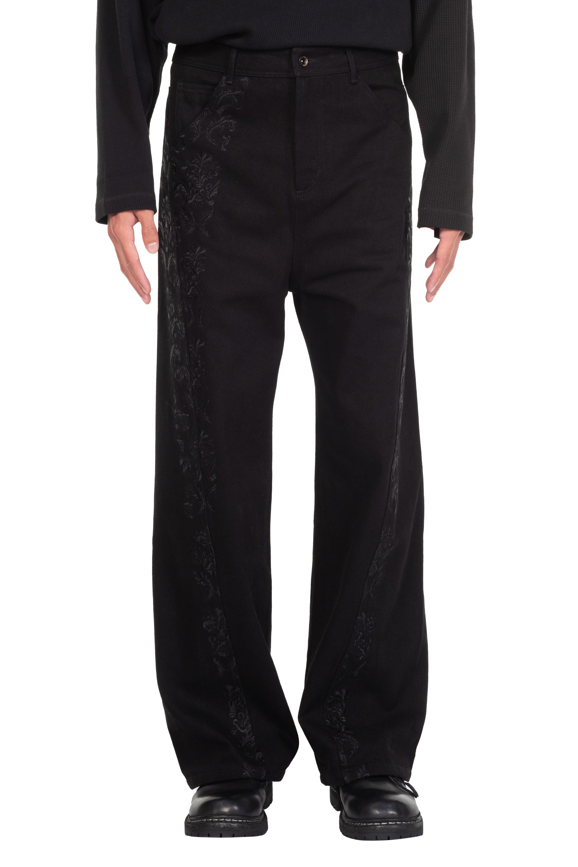 Professor. E E Skater Jeans Black. Wide long fit. Embroideries throughout. Button closure at waist. Two side pockets. Two back pockets. Signature detailing at back.