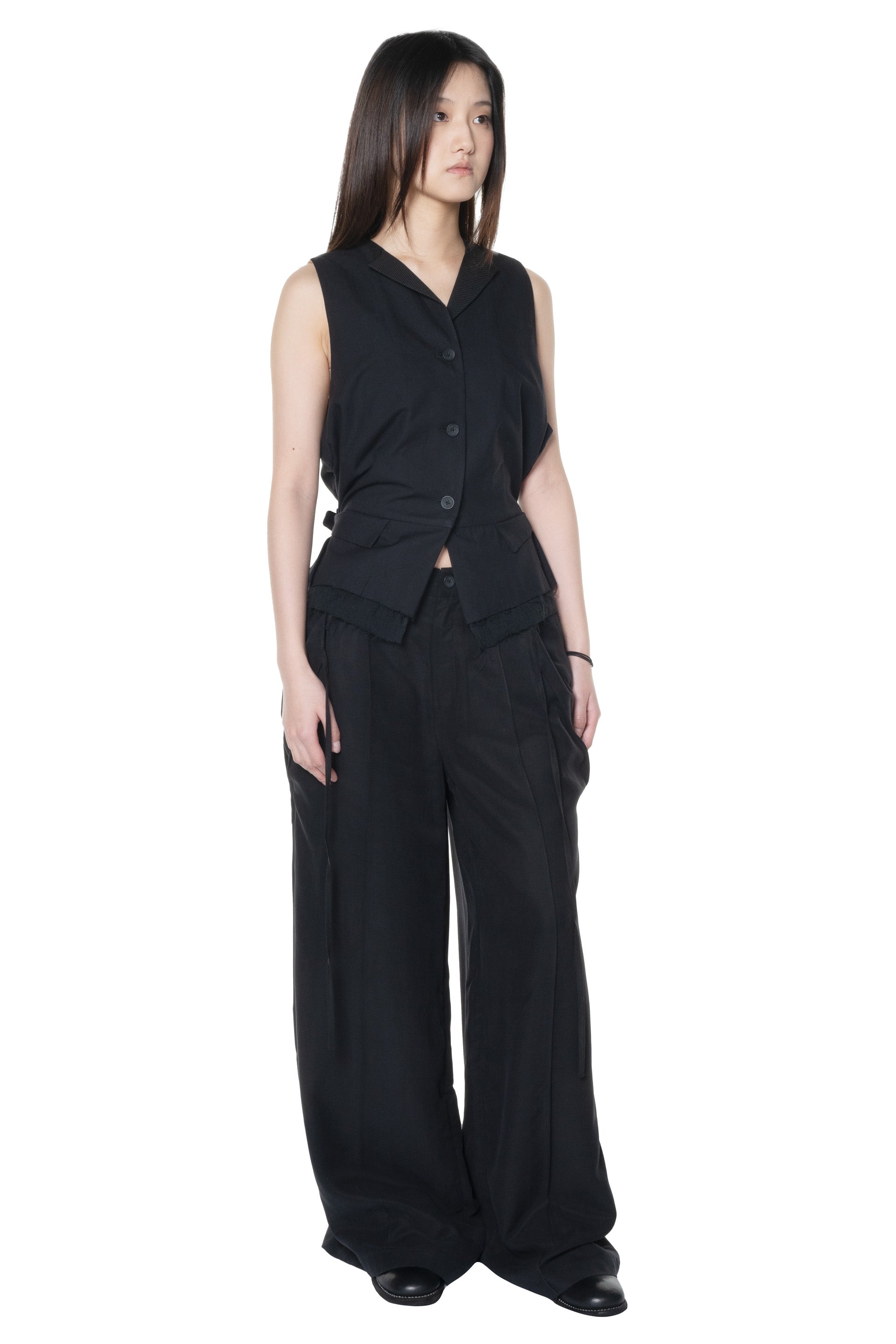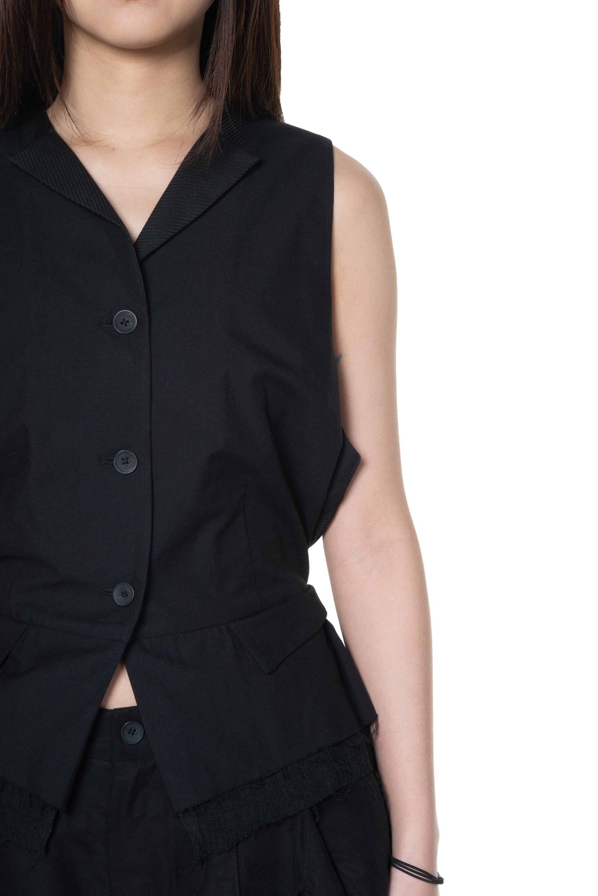 Professor. E E Waistcoat. Sleeveless. Button closure at front. Open collar. Drawstring closure at back. Signature details throughout. Lace tulle details at back.