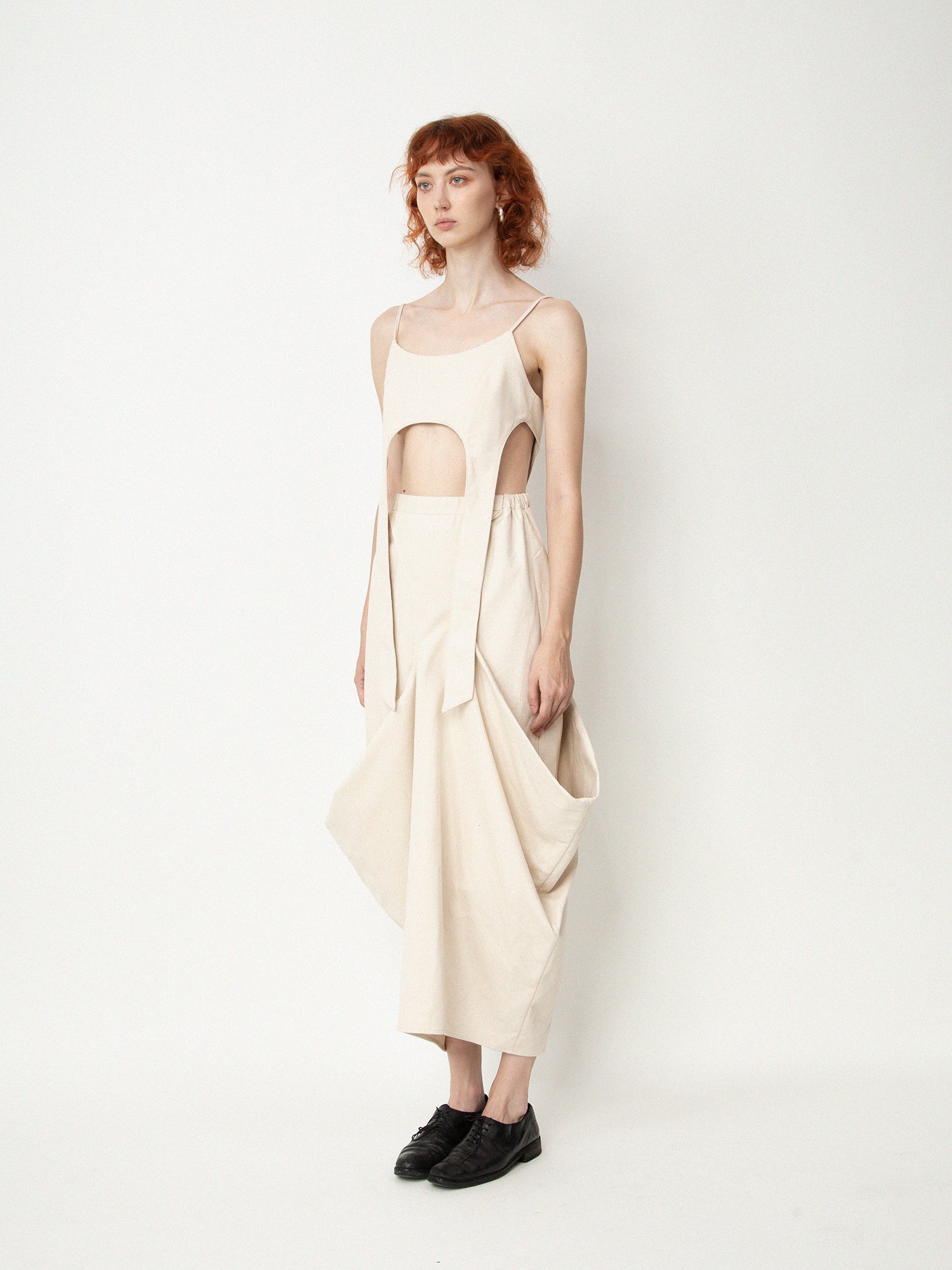 ii delivers a sense of originality, simplicity, spontaneity and a hint of childlike innocence pushing boundaries among ages to present qualitative collections with timeless touches designed for independent individuals as seen with the Ecru-Cave Silhouette Dress.
