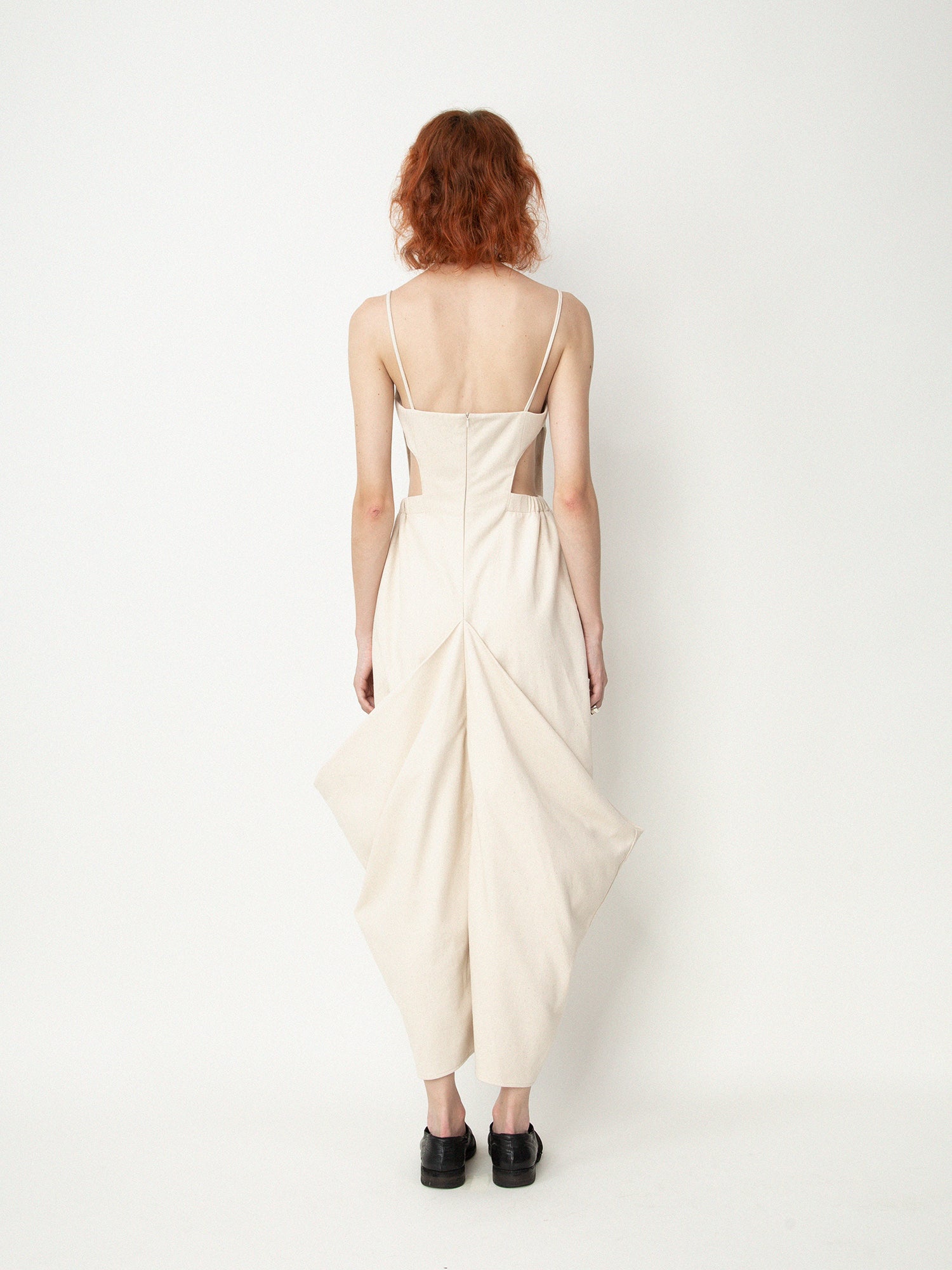 Mid-calf length dress with Cut out waistline design, tank top with long strap detailing and wide skirt.
