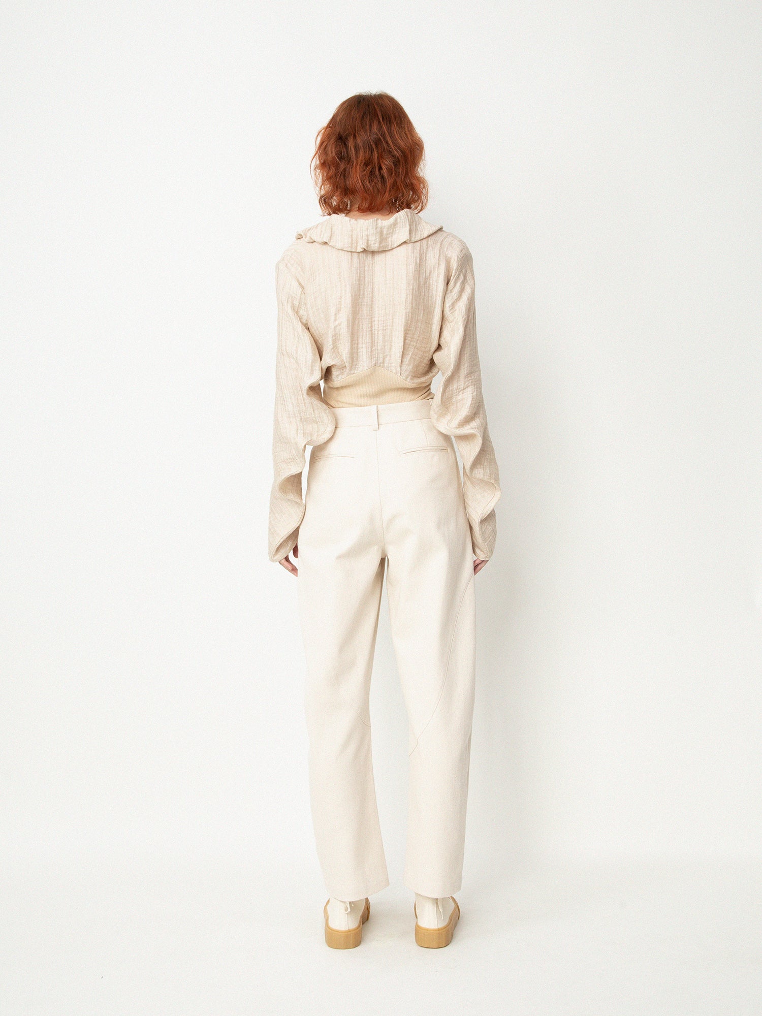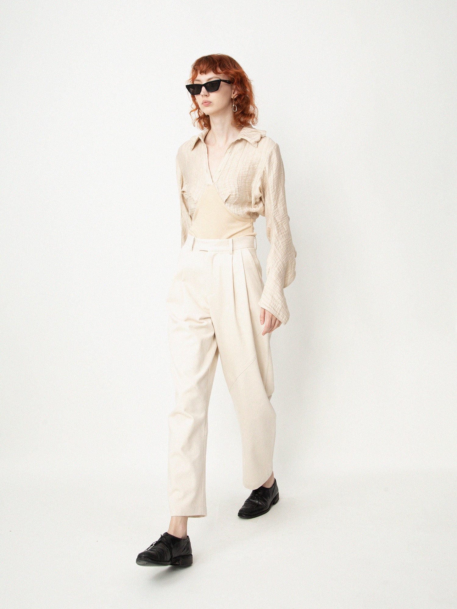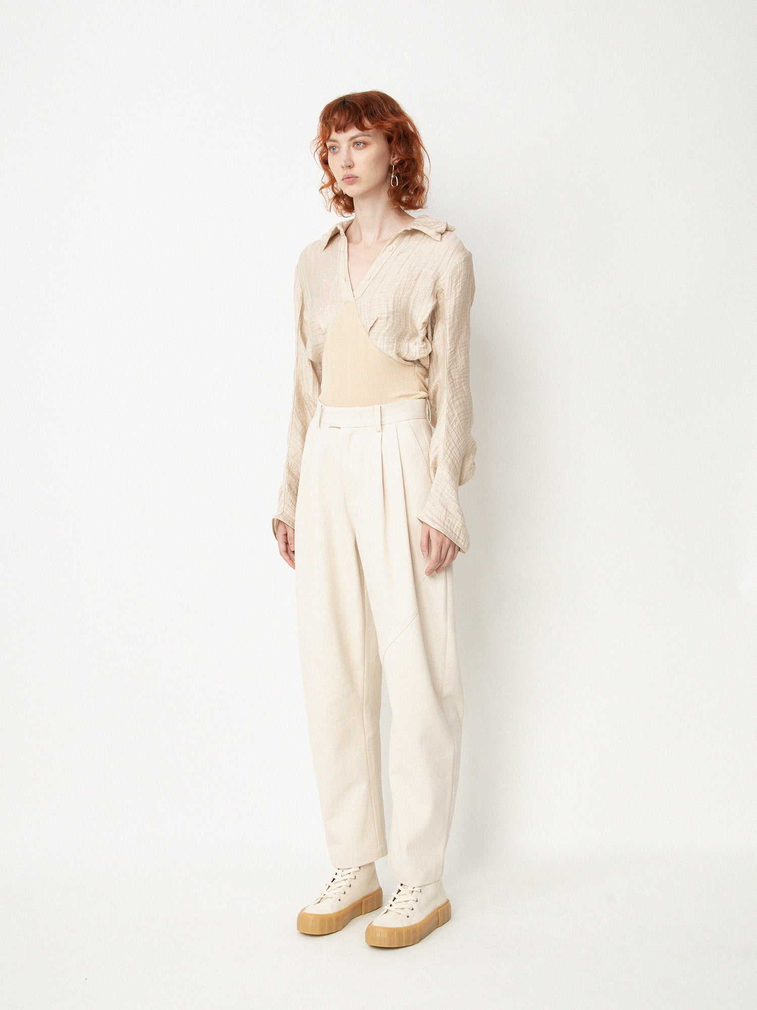ii delivers a sense of originality, simplicity, spontaneity and a hint of childlike innocence pushing boundaries among ages to present qualitative collections with timeless touches designed for independent individuals as seen with the Ecru-Wide Sleeve Bodysuit from ii sense.