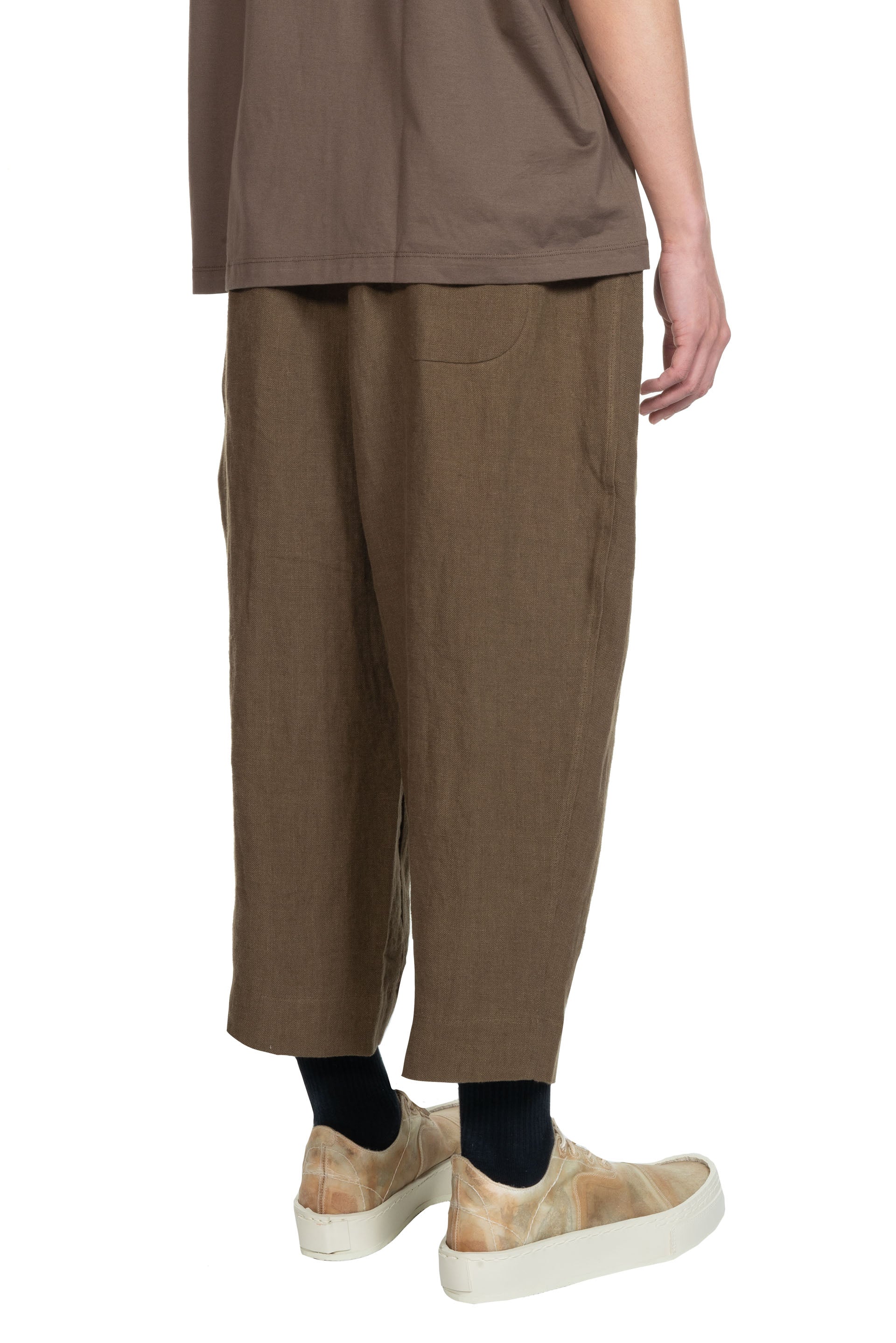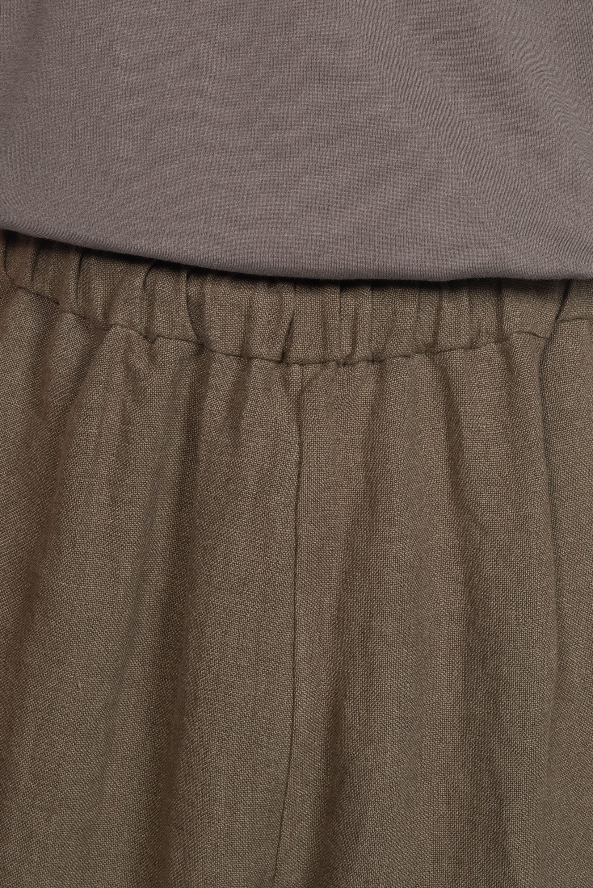 Wide cropped trousers. Elastic waist. Two pockets at front and One back pocket. Zip at front. Heavy linen fabric.