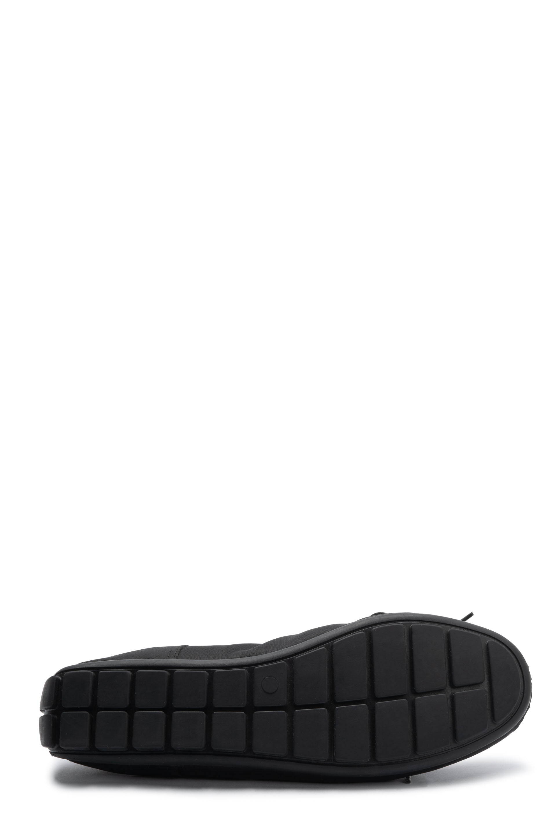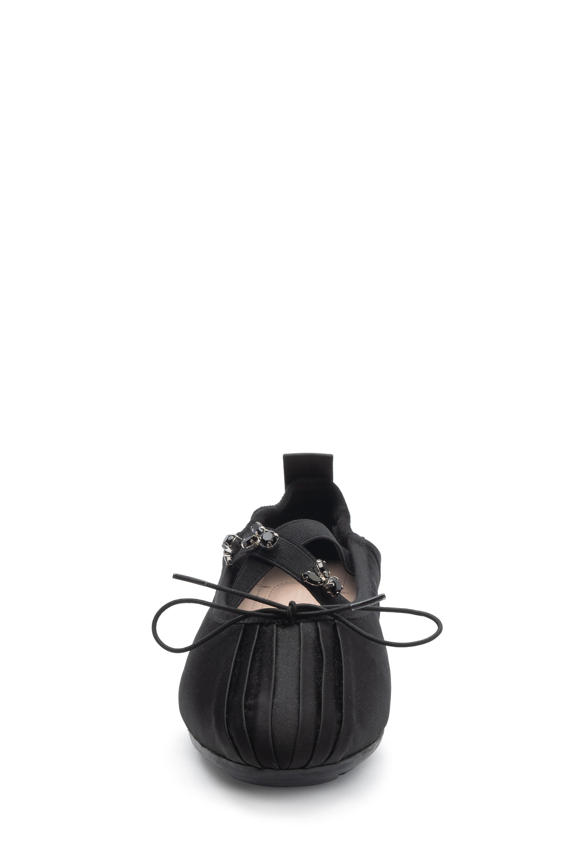 Sporty satin ballerina pump. Seasonal crystal embellishment. Elastic criss-cross strap. Bow ribbon detail. Rubber trek sole