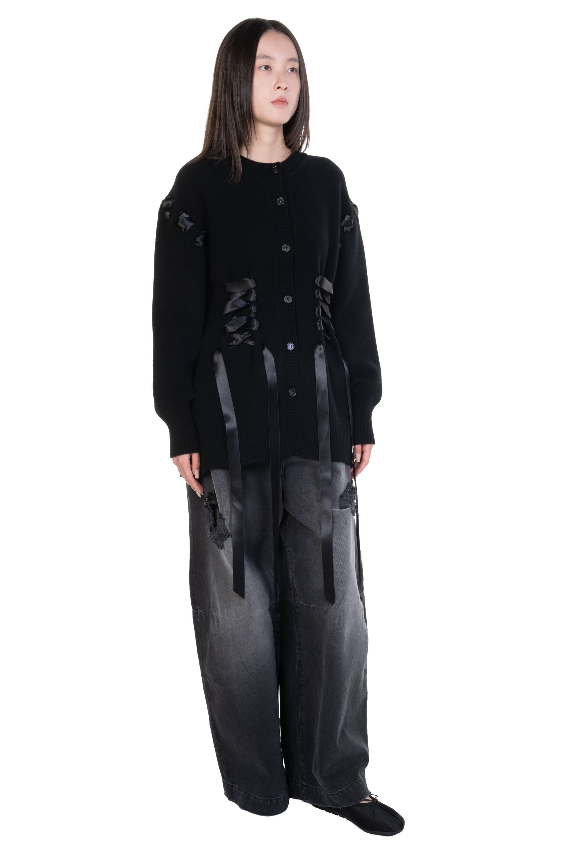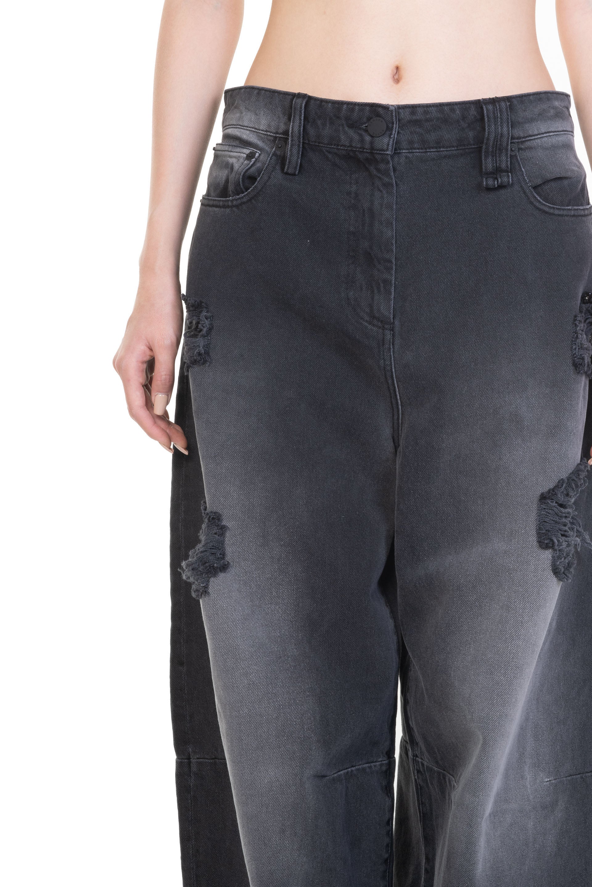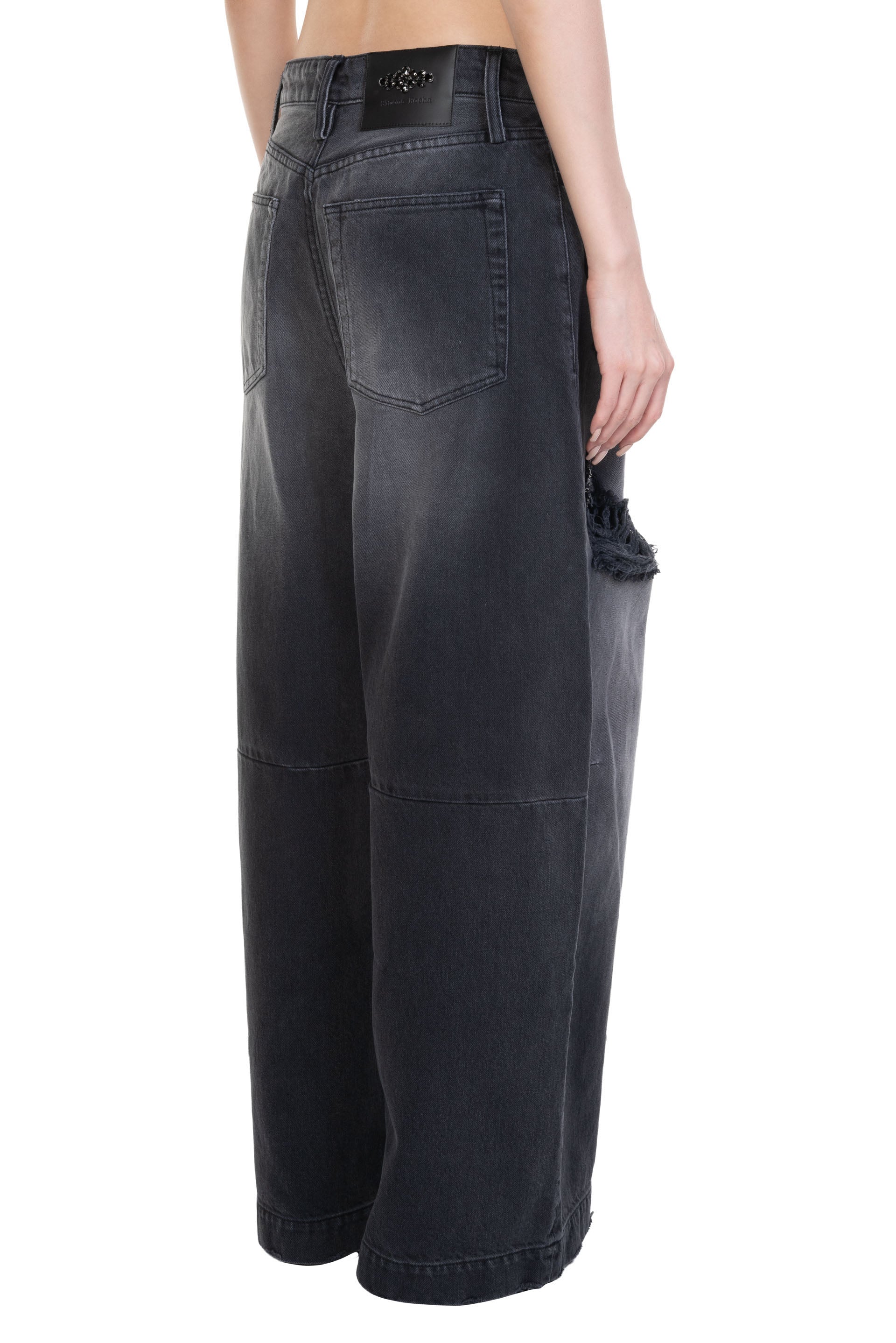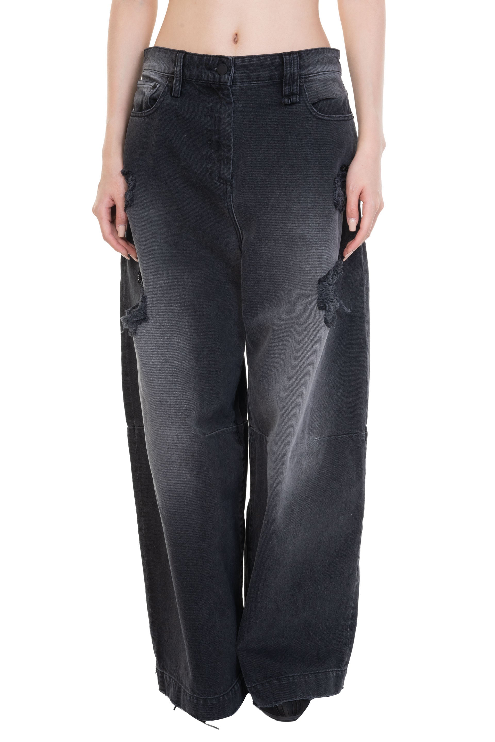 Simone Rocha wide leg jeans receive an update with a wash for a more worn feel, embellishments are featured by the distressed rips at the front legs. Distressed cotton denim wide leg jeans. Signature embellishment. Beaded label at back. Four pocket styling. High-waist fit.