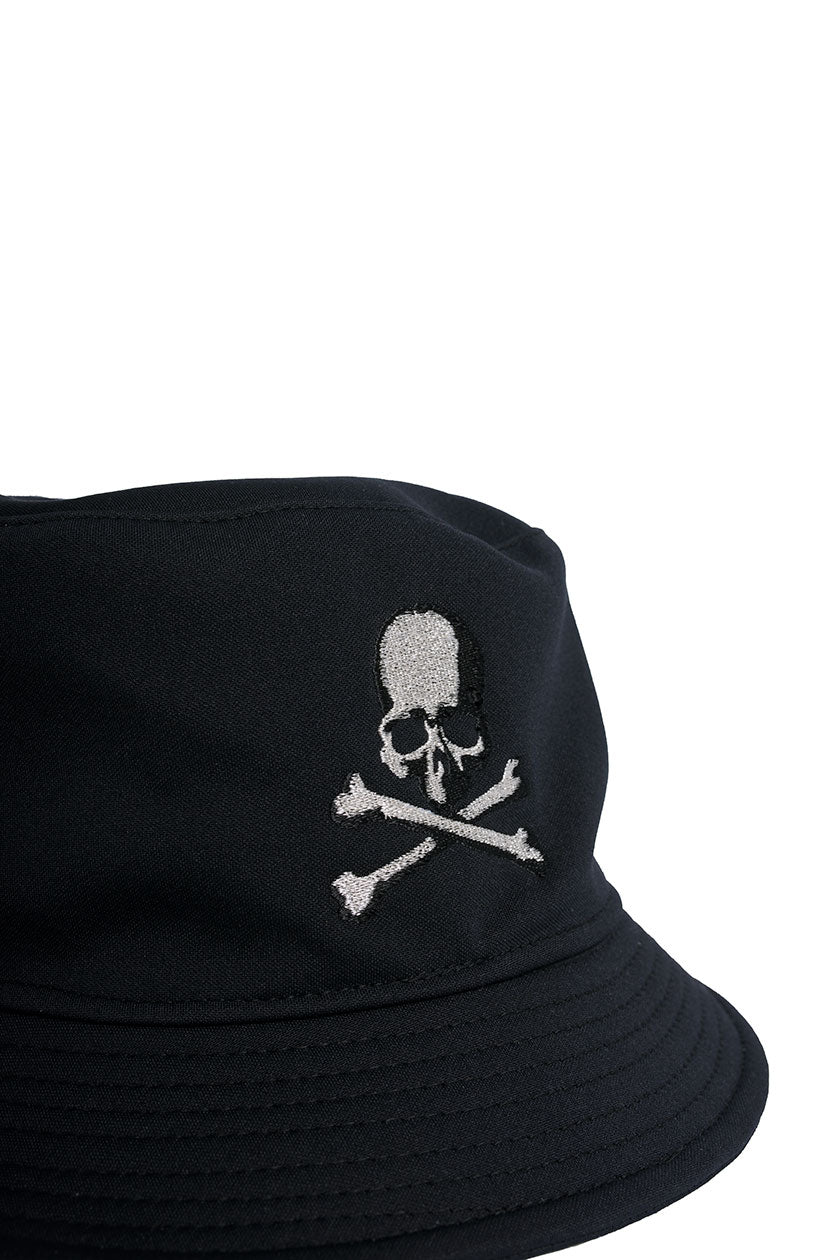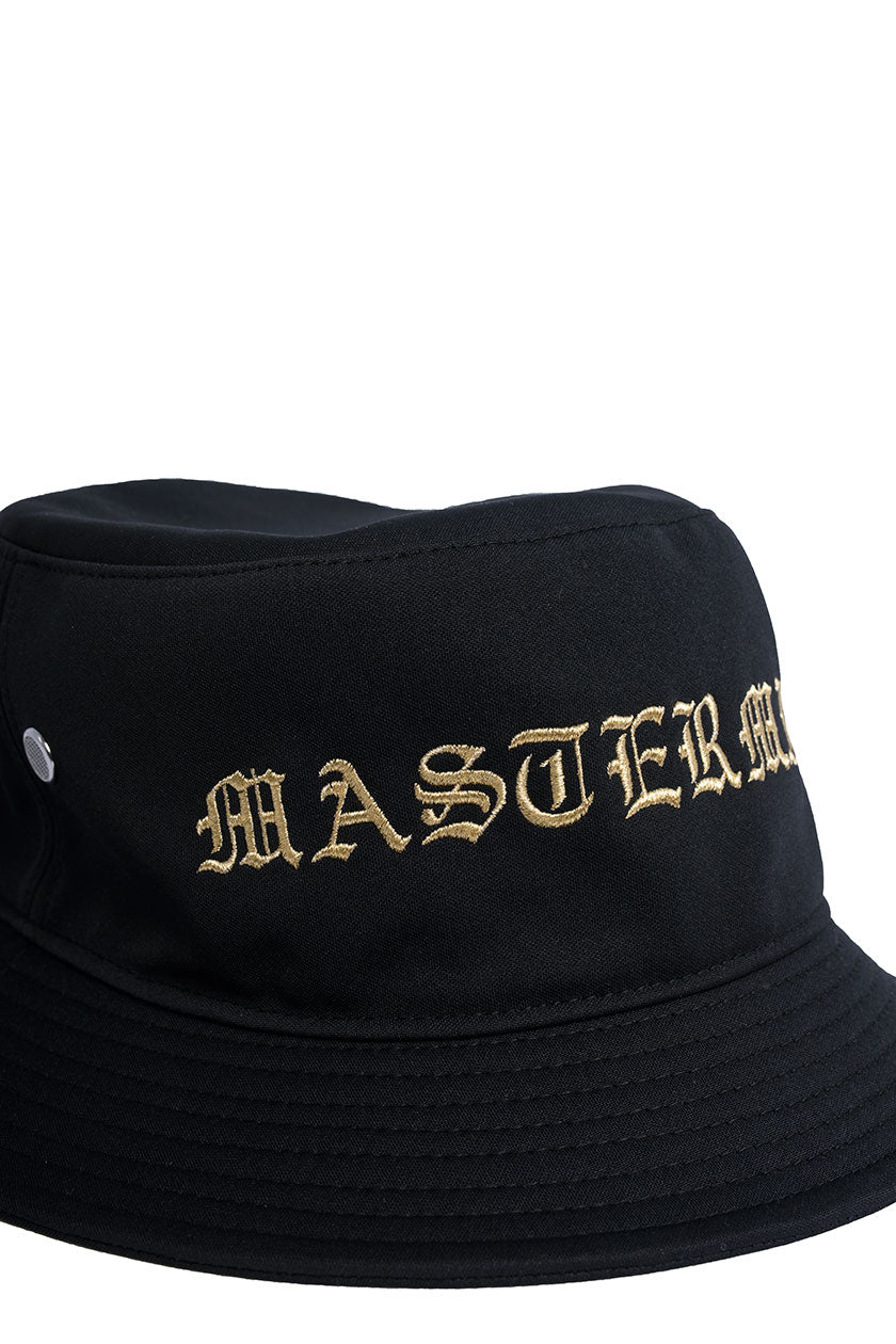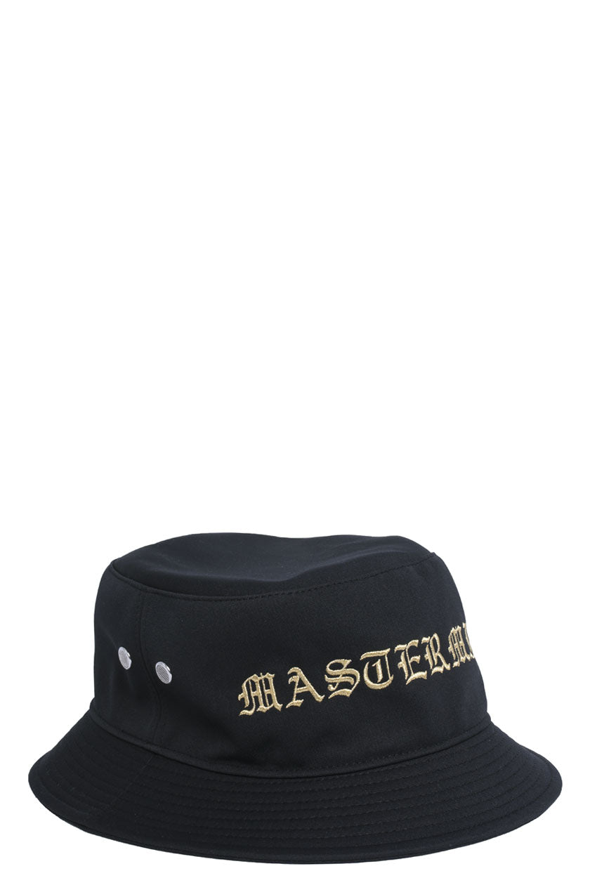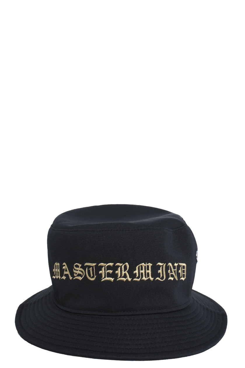 mastermind JAPAN embroidered logo bucket hat. Stitched wide brim. Gold graphic lettering. Skull and crossbones motifs. Pull-on style. Silver tone side studs.