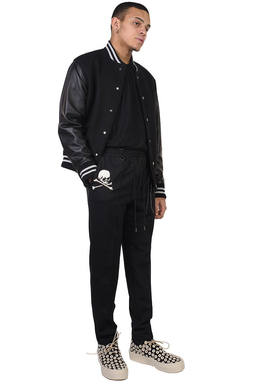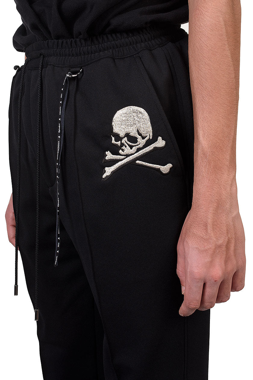 mastermind JAPAN embroidered skull pants. Elasticated Drawstring Waist. Two back Pockets. Two Front pockets. Embroidered Skull and crossbones motifs on sides. Silver detailing at back.
