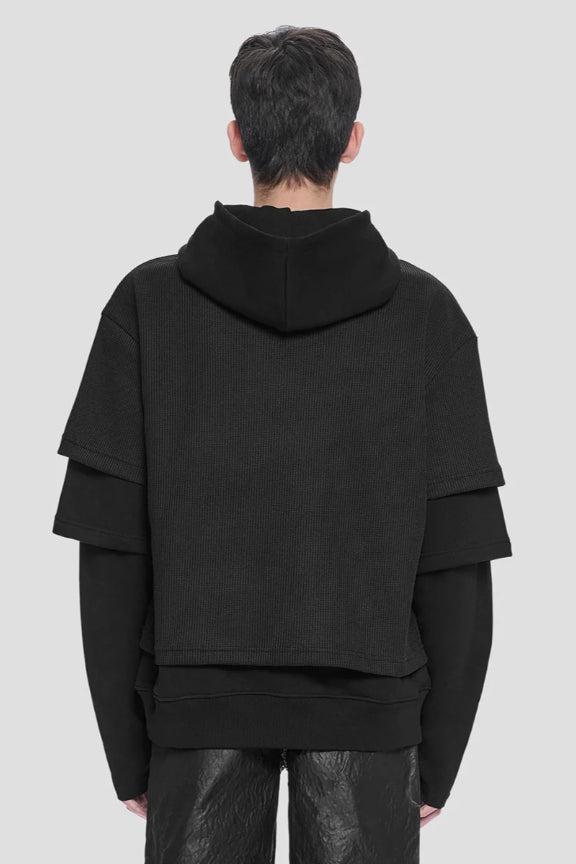 Regular fit. Overlayed hoodie layer, t-shirt and sleeves. Thumbhole detail. Regular fit overlayed style jersey hoodie. This garment consists of a hoodie layer, t-shirt layer and sleeves.