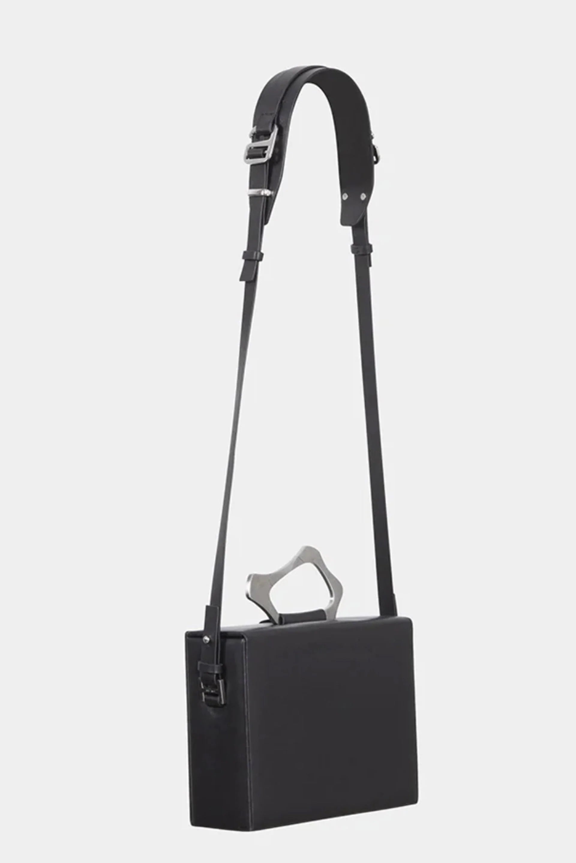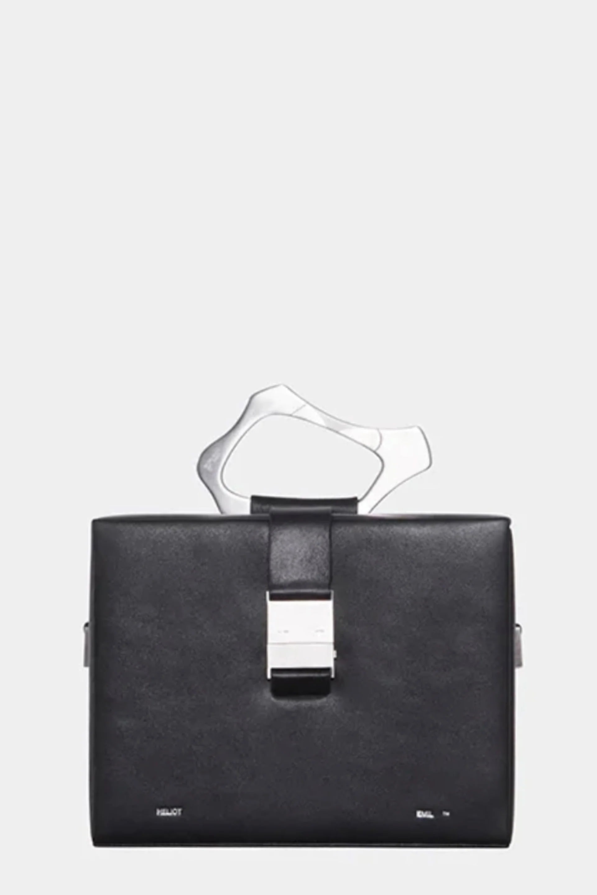 Custom hardware trimmings. Silver HELIOT EMIL TM logo on the front. Metal carabiner top handle and metal snap buckle closure. Rigid box structure with a single compartments.