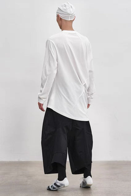 Attempt t-shirt in White. Long sleeves. Round neck. Pleated throughout. Soft cotton fabric.