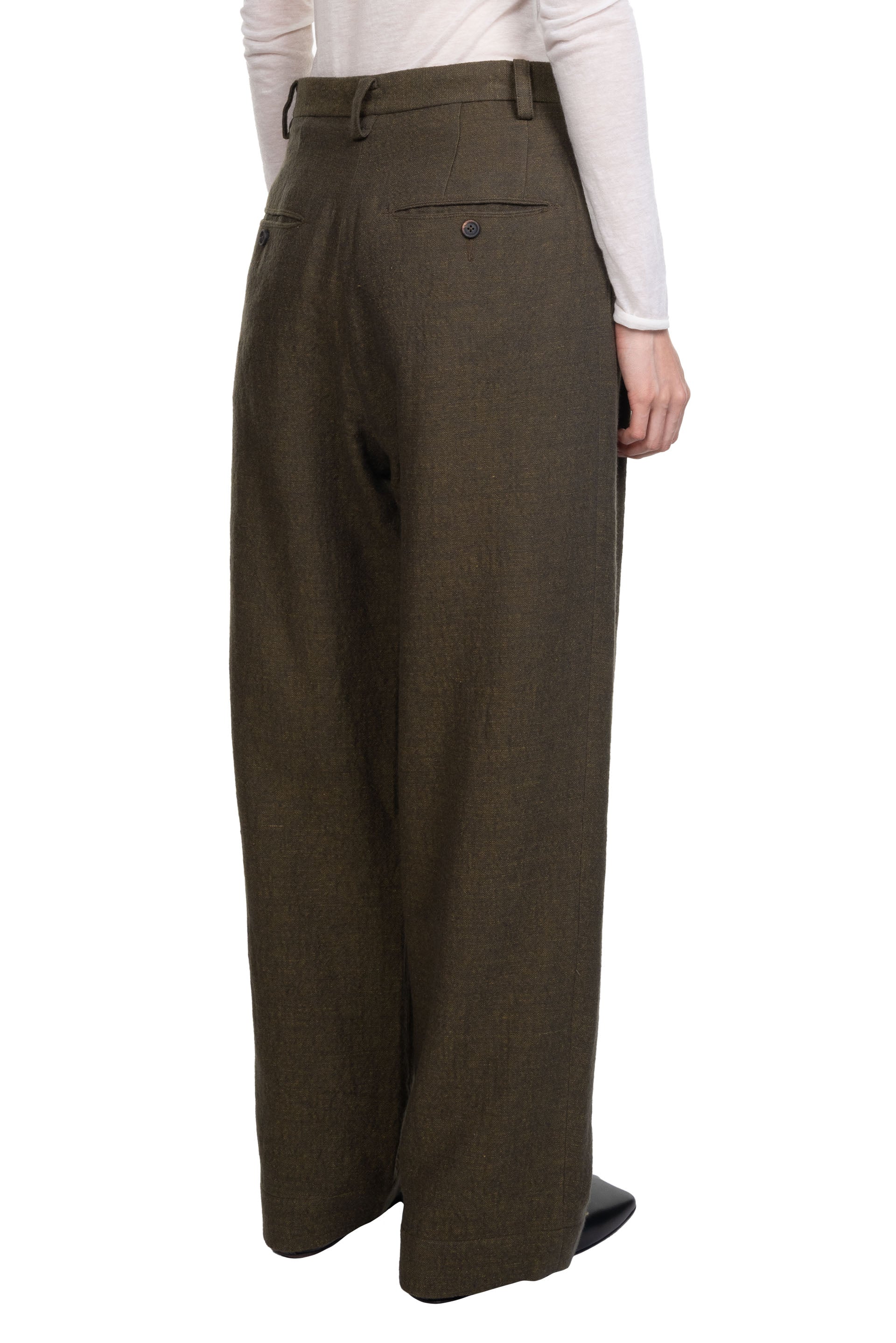 Extra Long Straight Trousers Black in Green. Button closure at waist. Two side pockets. Two back pockets with button closure. Soft and lightweight cotton linen Jacquard fabric. Fully lined. Extra long straight fit.