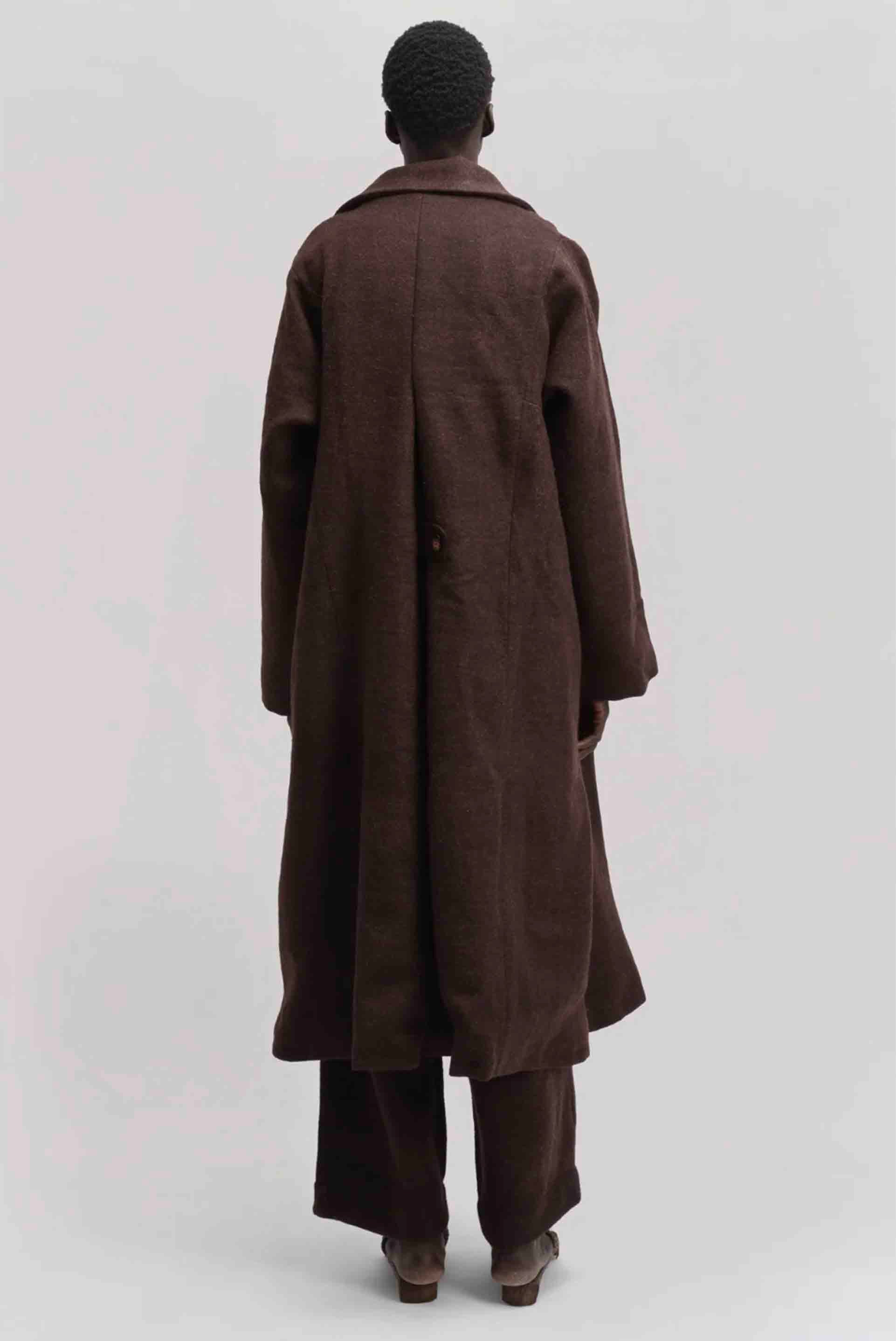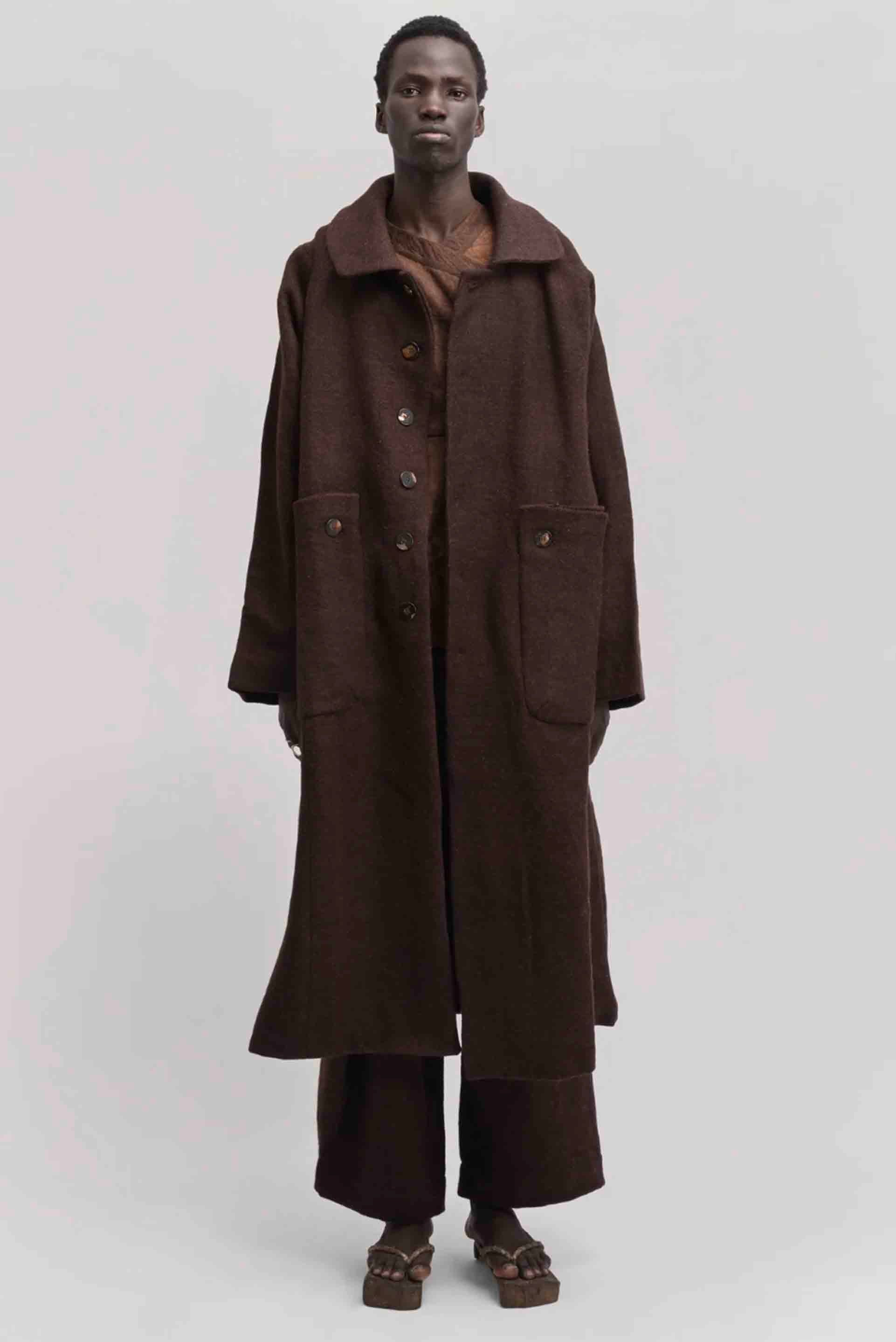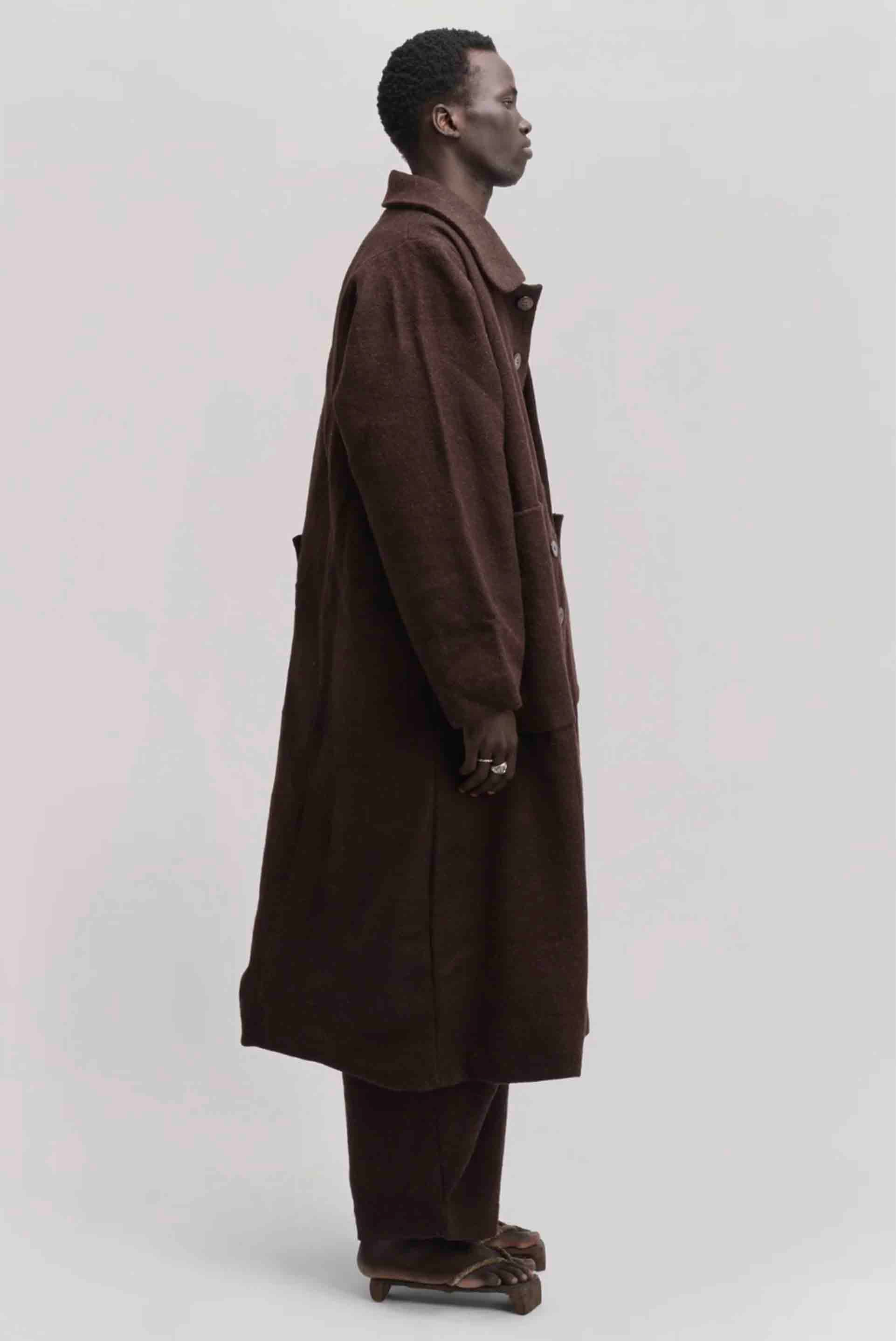 Gathering is dedicated to preserving the art of handmade textiles and tradition. Textiles are sourced across Asia and Africa, woven on traditional looms and antique machinery, grown naturally without pesticides or human intervention, and dyed using elements from the earth, ensuring they are free from any chemicals. Each piece is hand-made featuring meticulous details and natural buttons made from materials like shell and ceramic, making each item unique and rich in character. Gathering is a fresh, timeless and versatile silhouette perfect for layering as seen with the Farmer Coat Brown.