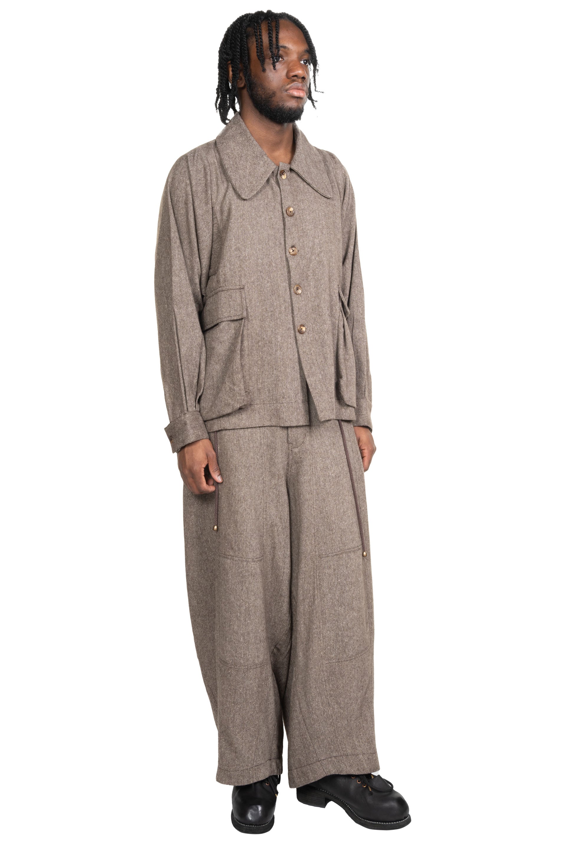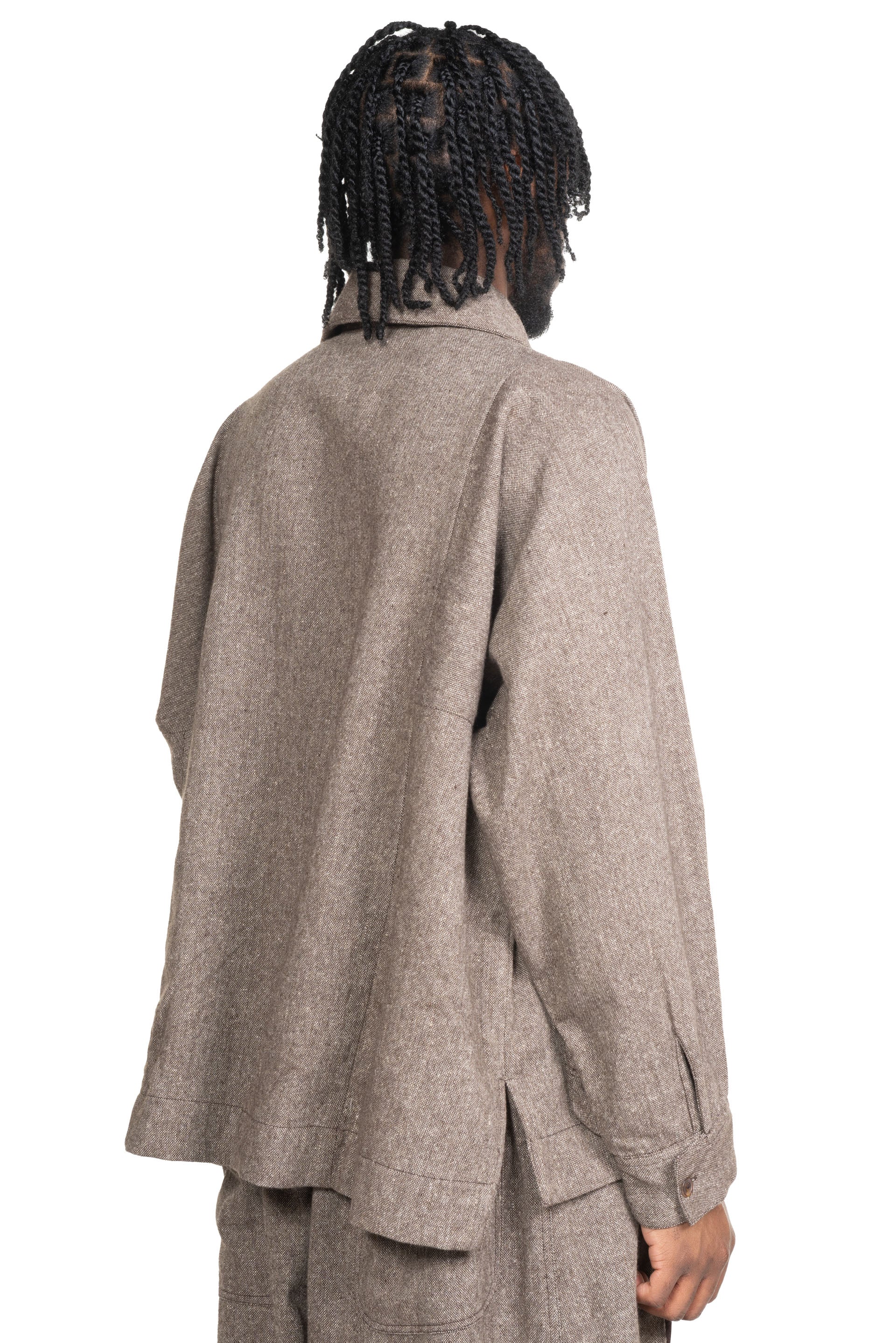 Gathering Jacket in Antique Herringbone Wool. The Farmer Jacket is based on a well-loved traditional Indian dress and takes inspirations from African djellaba. A historic elegant construction made to compliment the wearer. Signature Gathering oversized collar. Two button cuffs. Baggy pockets. Antique Japanese wool. Two baggy pockets with flaps. Boxy fit.