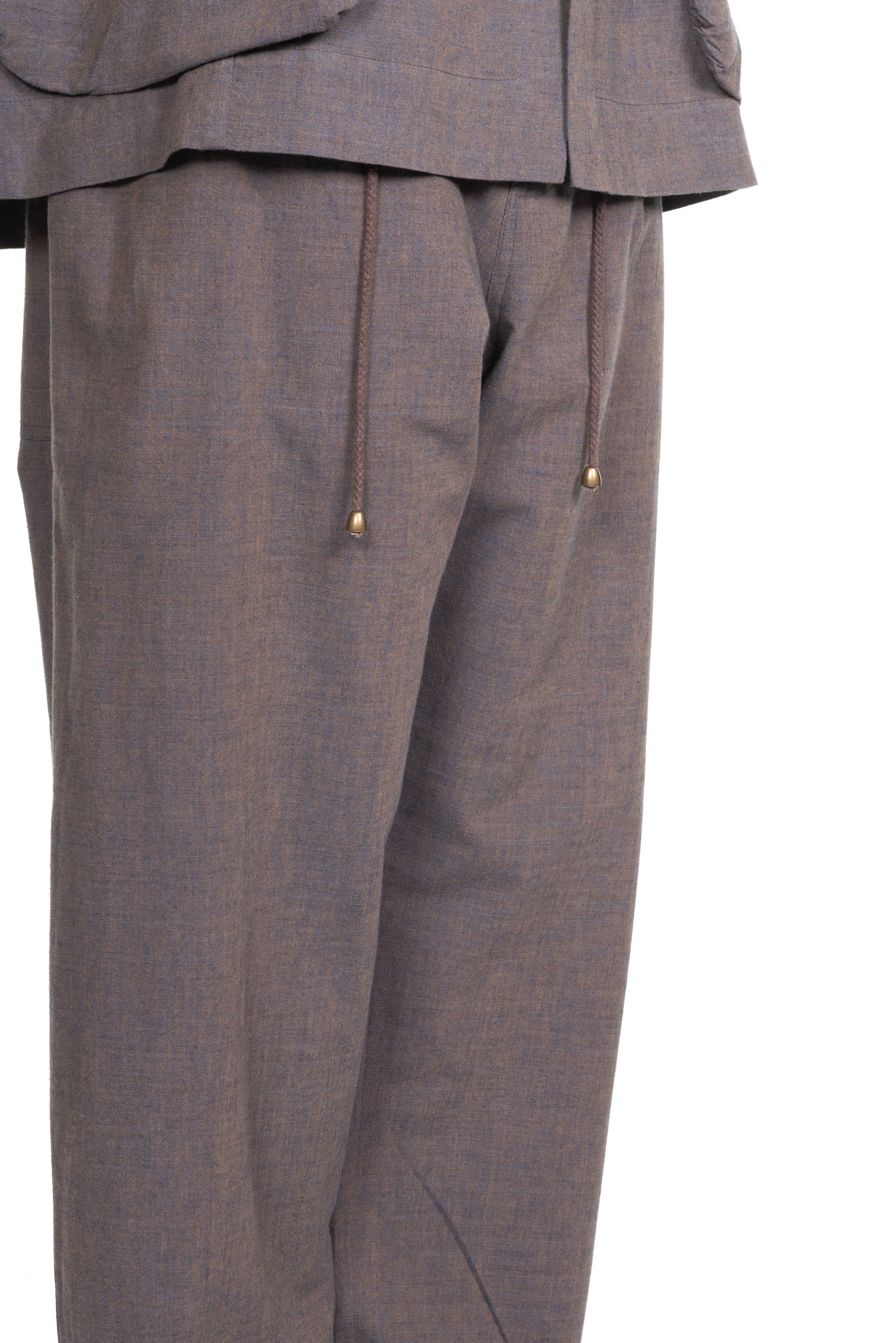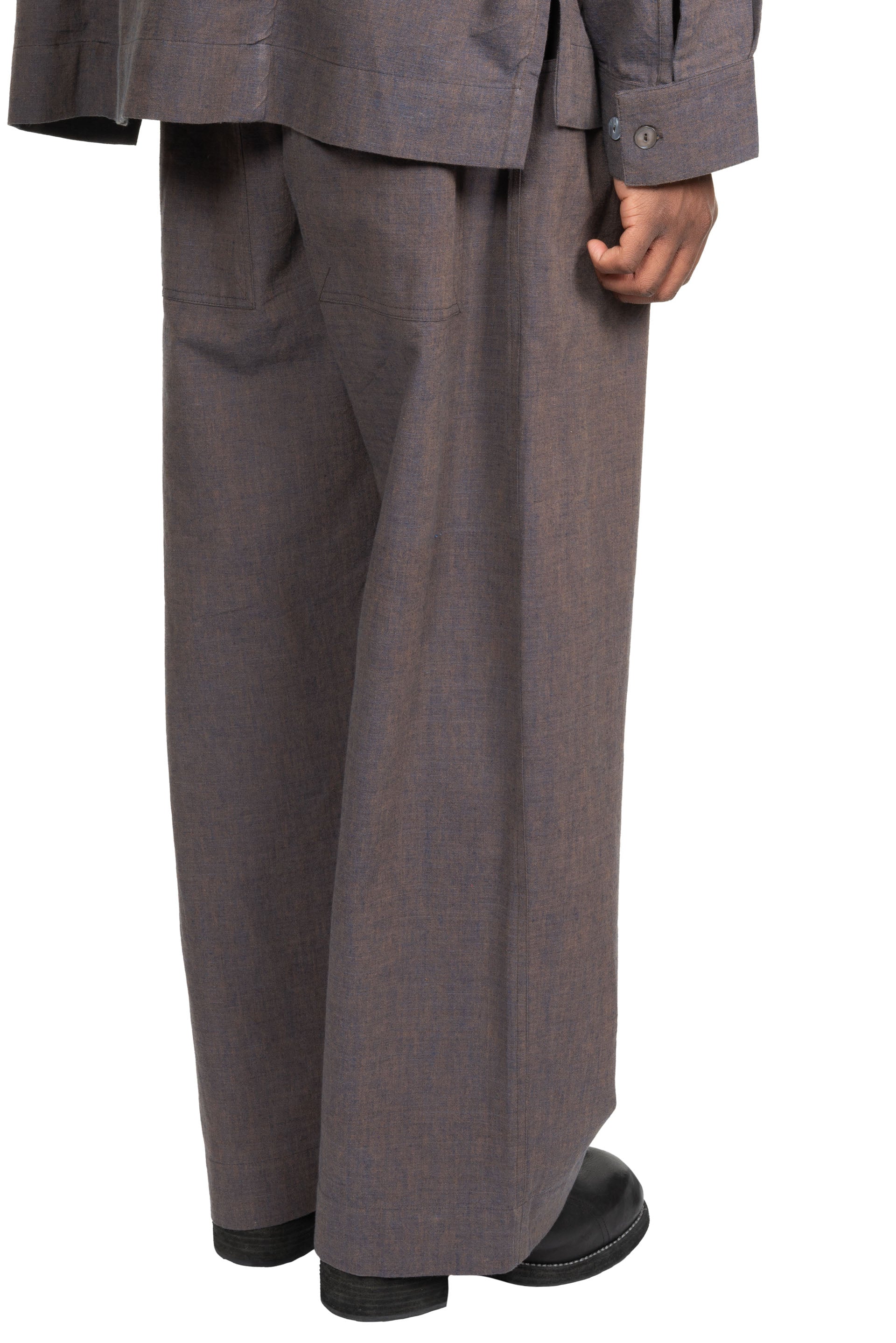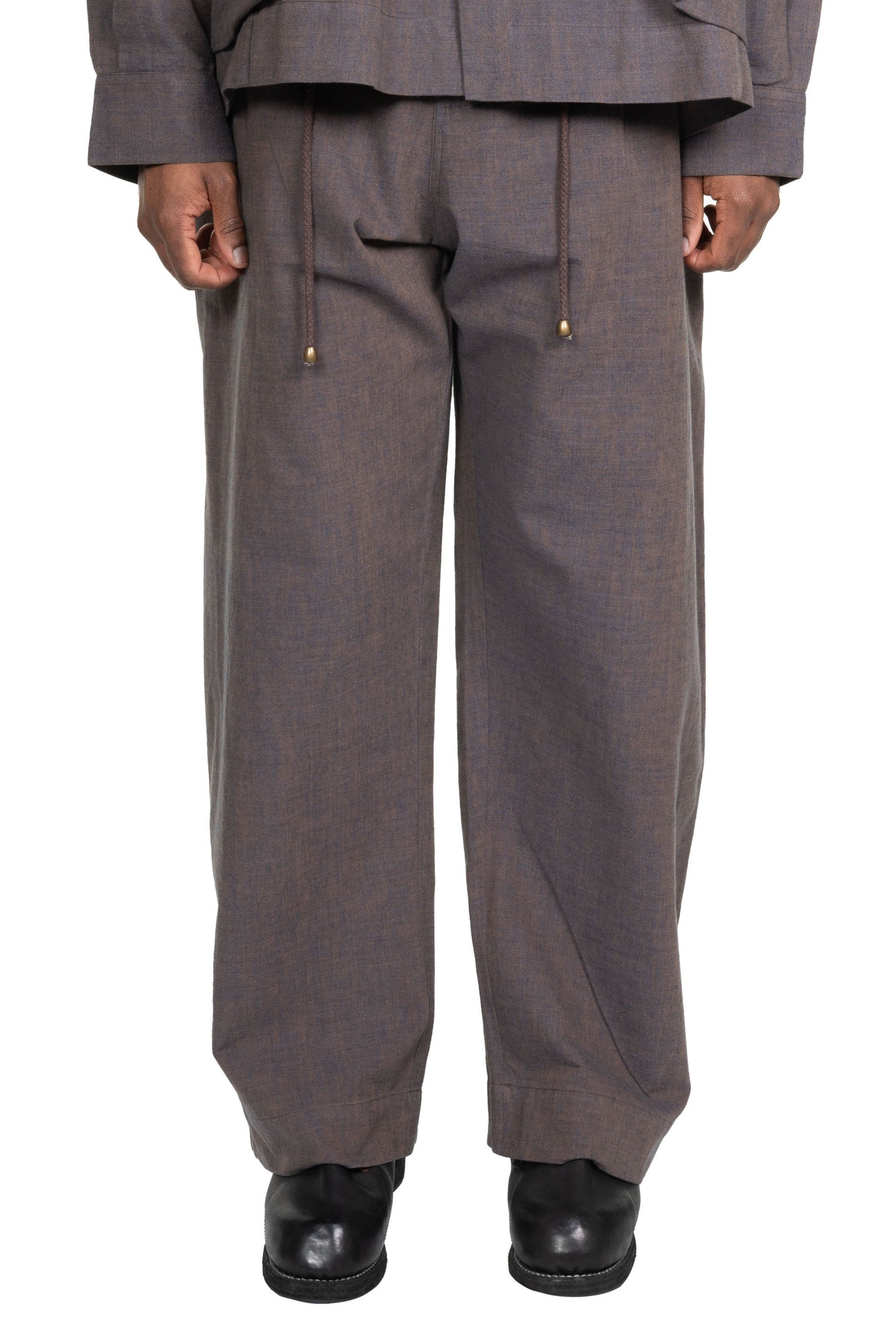 Gathering Farmer Pant in Persimmon Indigo Dyed Cotton. Button closure at waist. Drawstring at waist with toggle. Two side pockets. Two back pockets. Pleats at side. Persimmon & indigo yarn dyed cotton, made in Japan using industrial power looms.