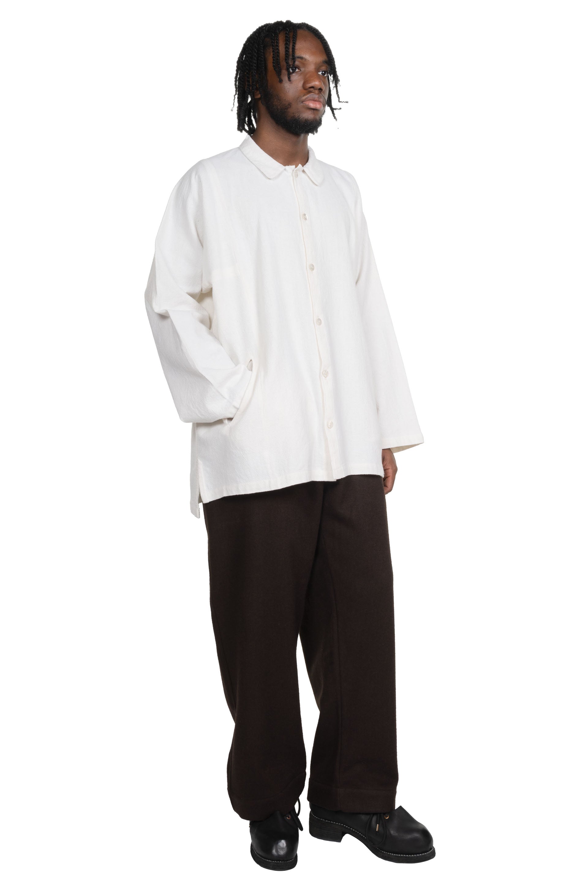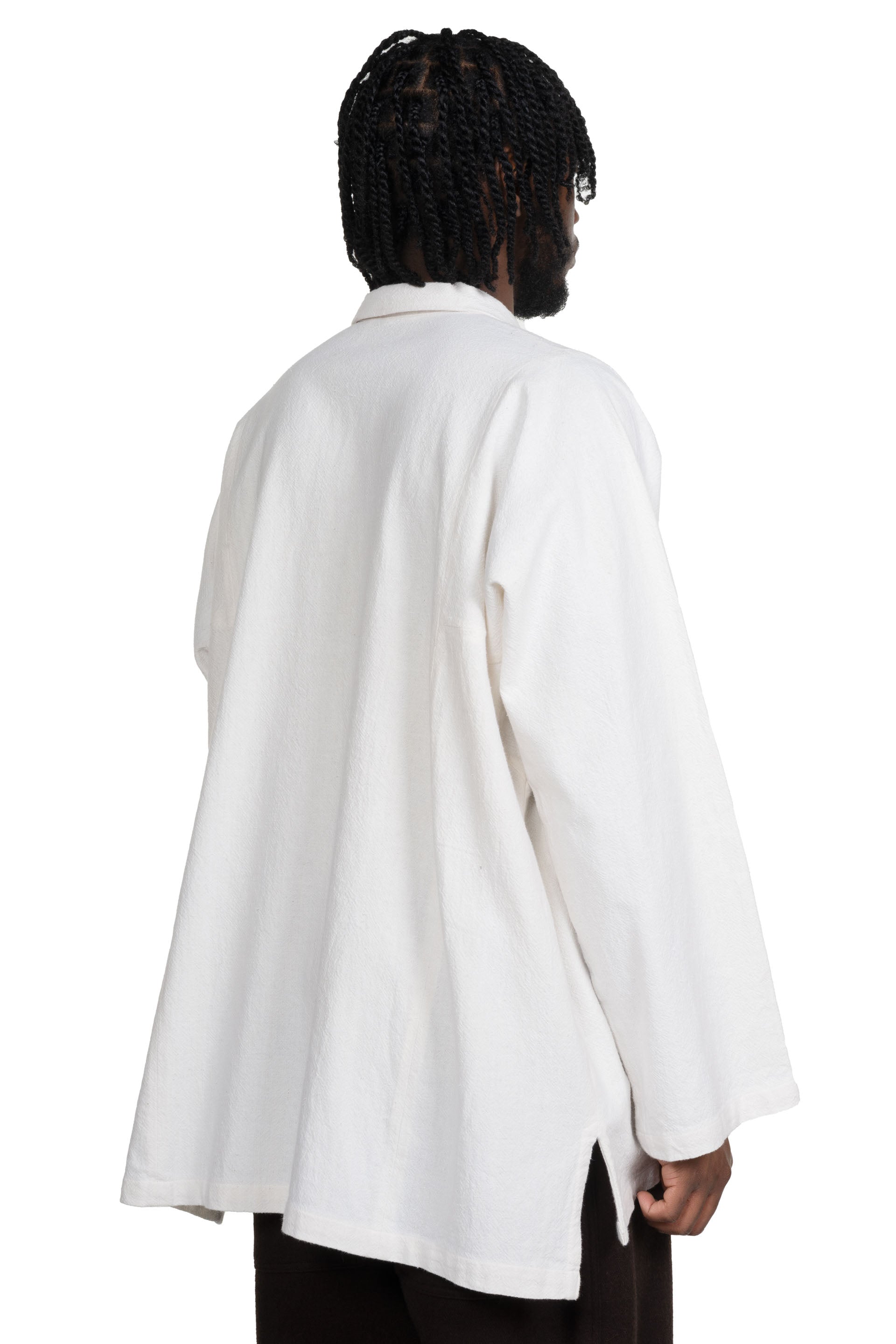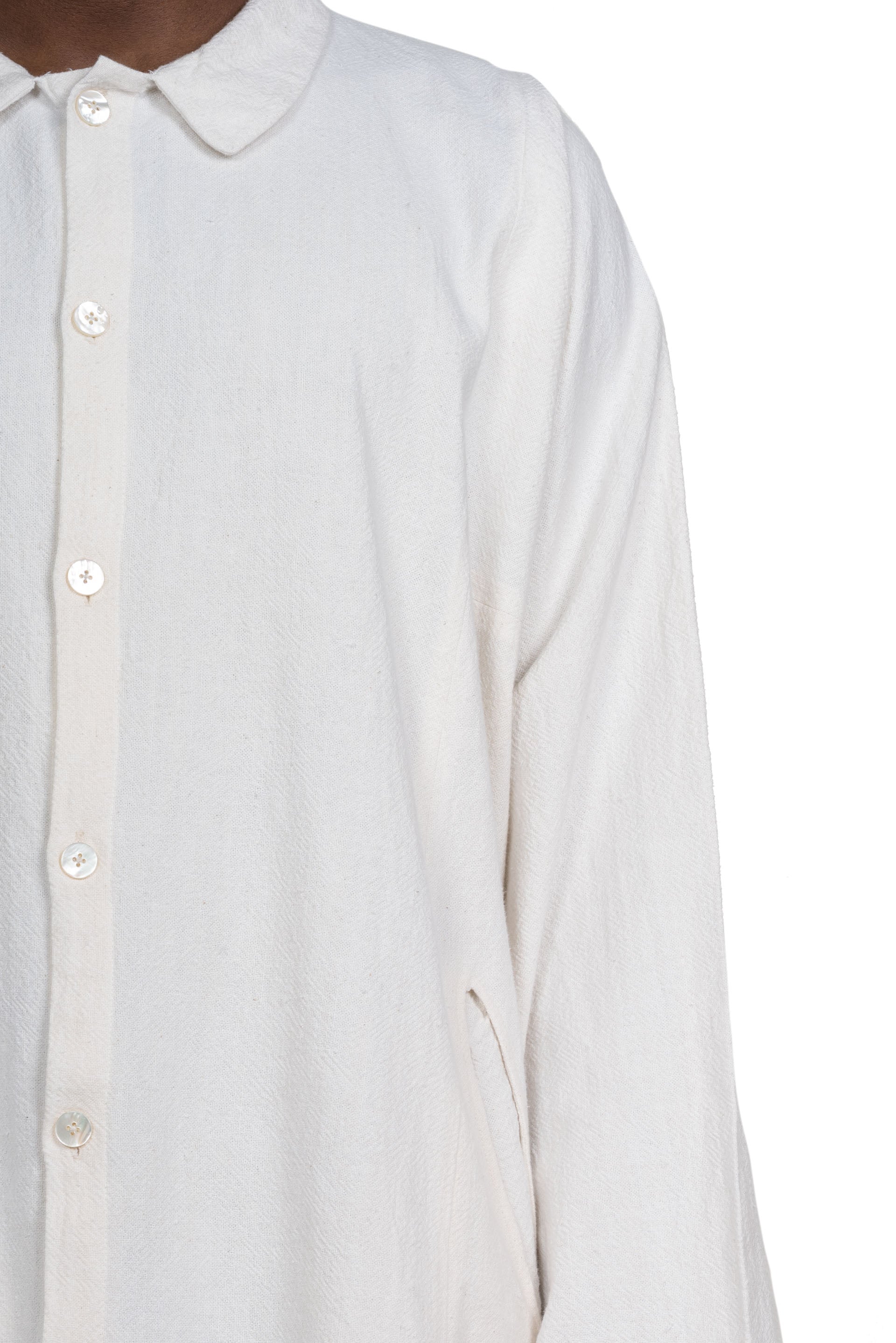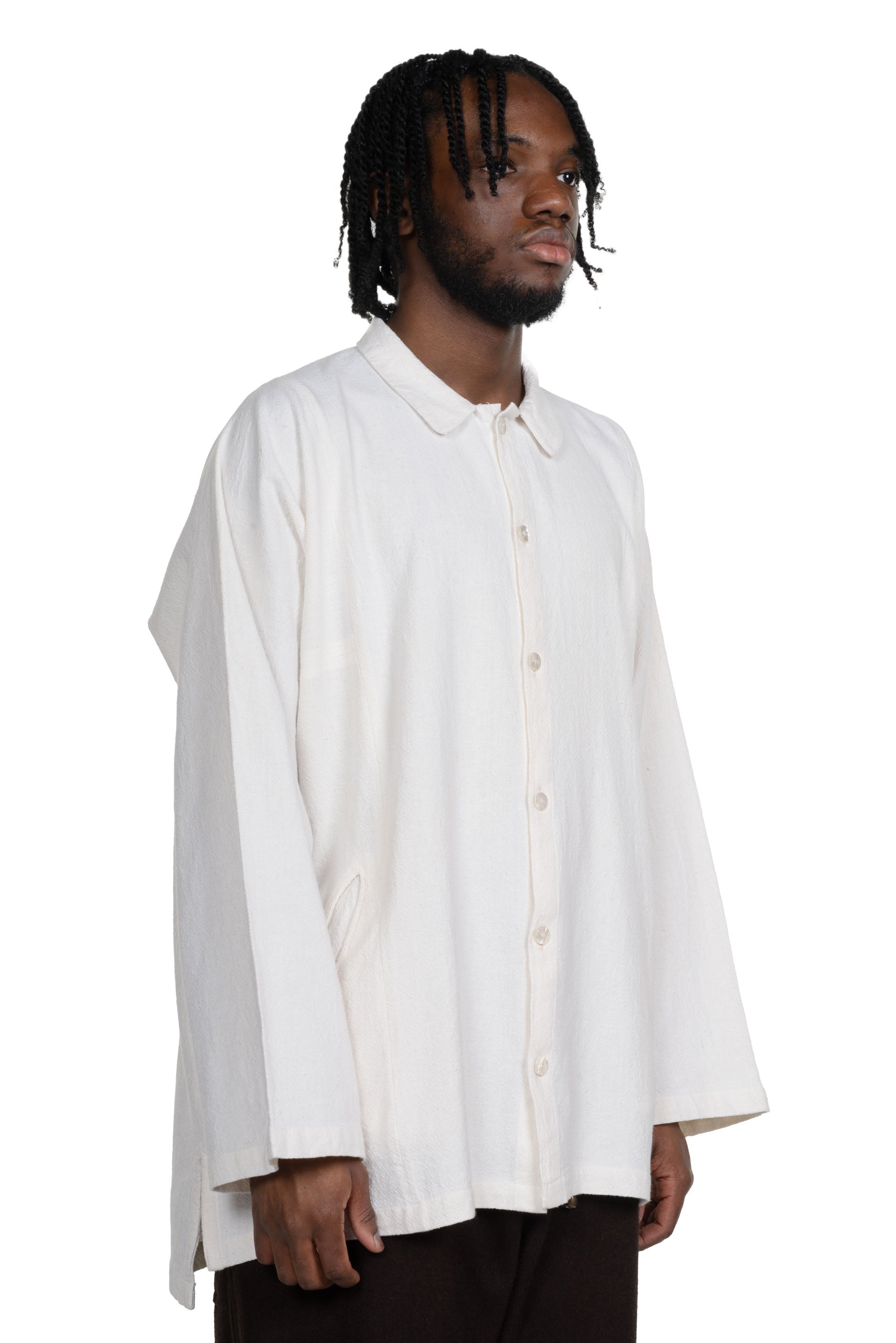 This garment is constructed in a way to compliment all body shapes. The Farmer Shirt is a buttoned-down inspired by traditional Indian shirt. Oversized Gathering collar. Mother of pearl shell buttons. Made from Japanese Fuuai cotton which is a heavy, soft, unbleached Japanese cotton fabric that's woven to make patterns stand out. Boxy Fit