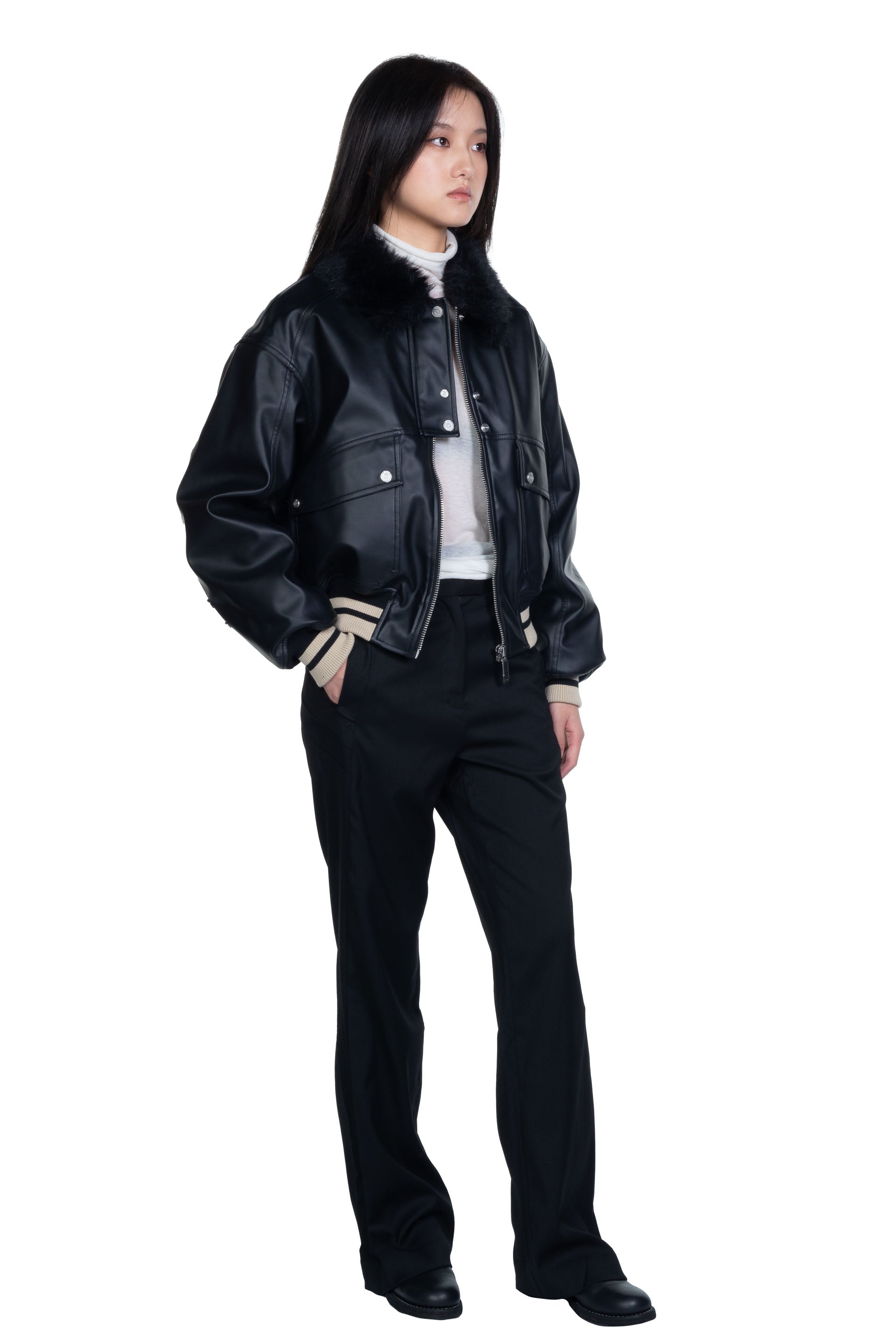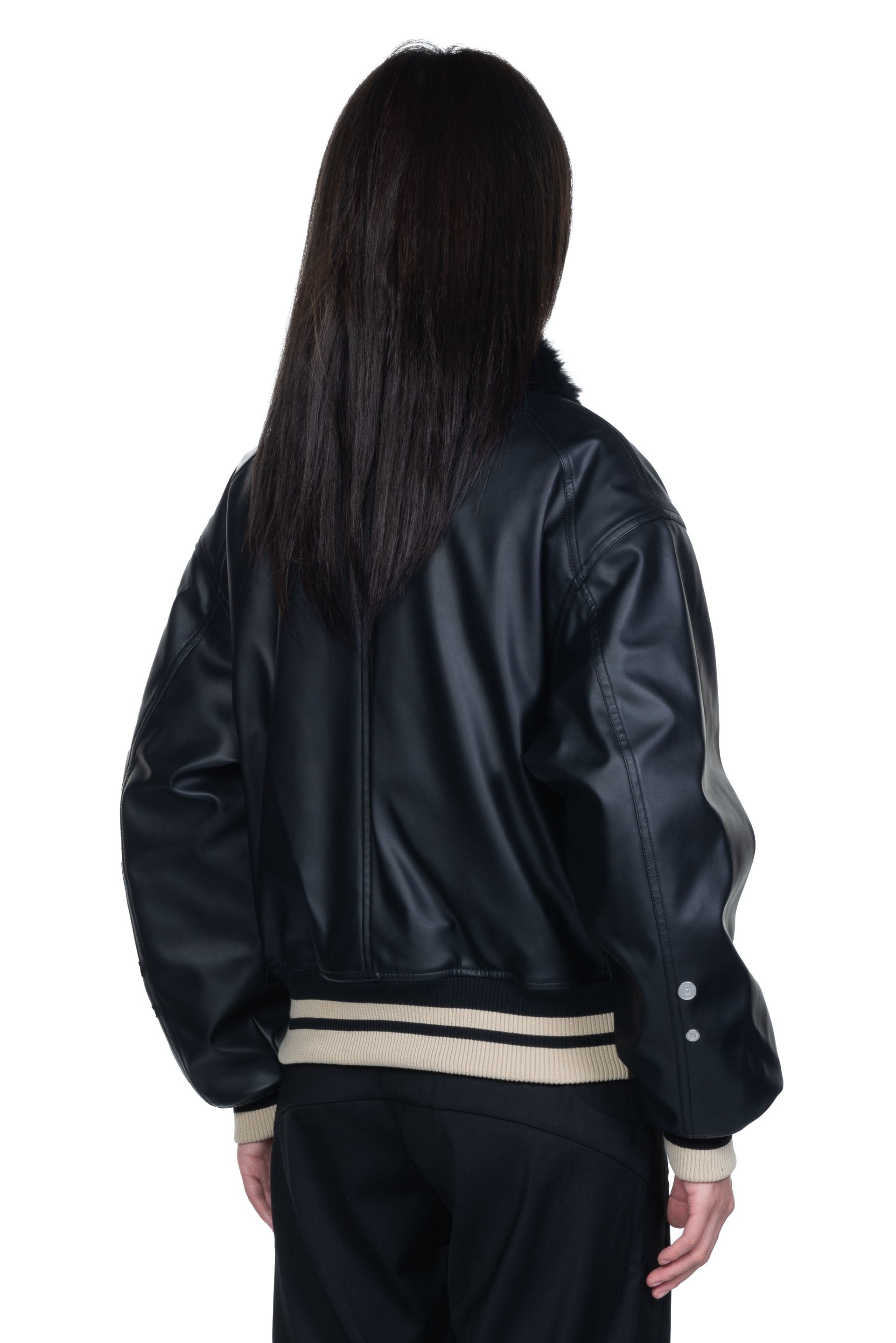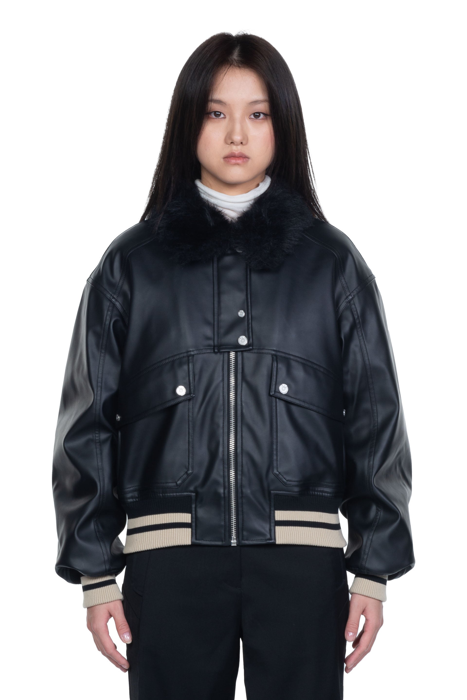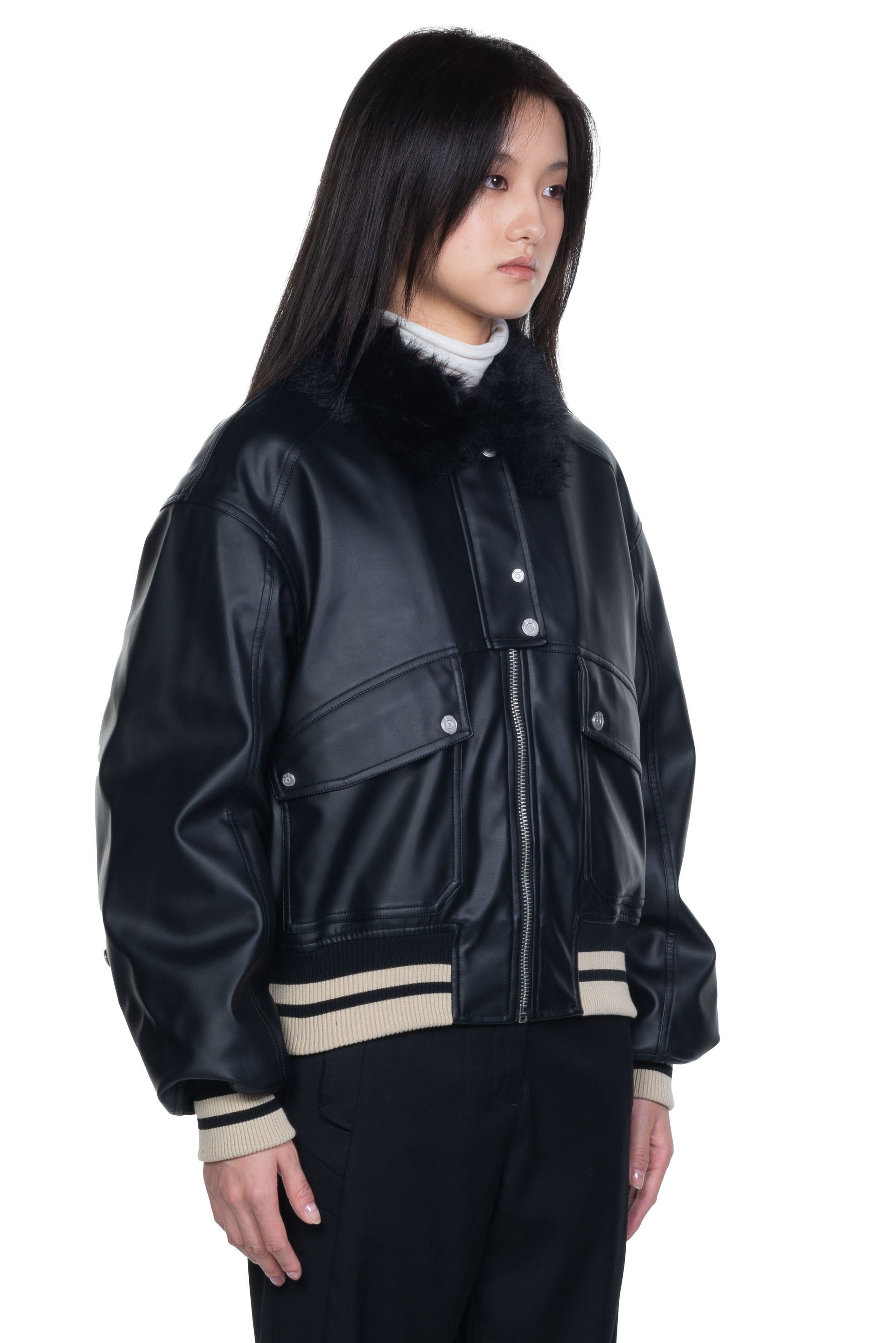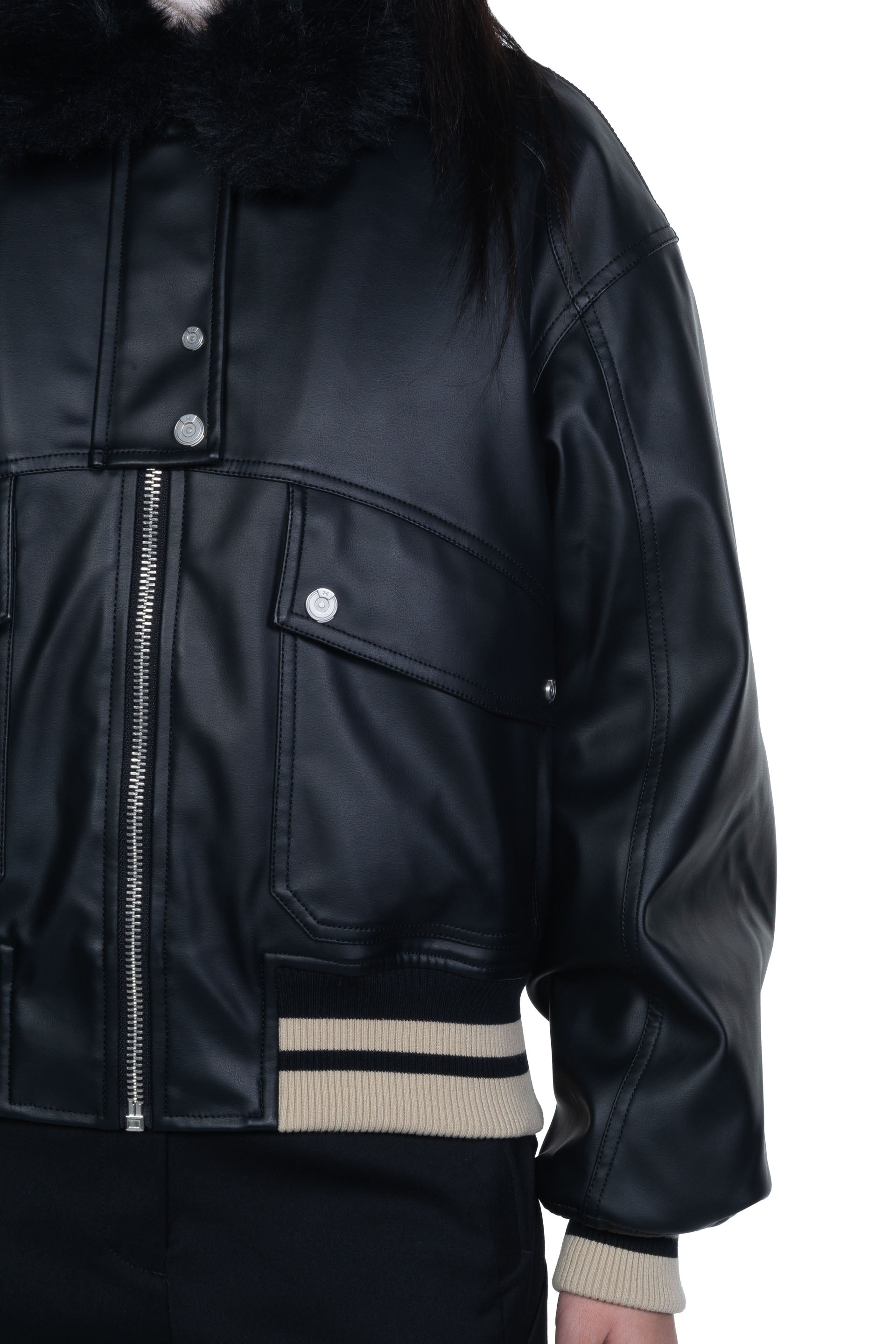 Faux Leather Bomber Jacket from C2h4. Zip closure at front. Faux fur collar. Two side pocket at side. Button details throughout.
