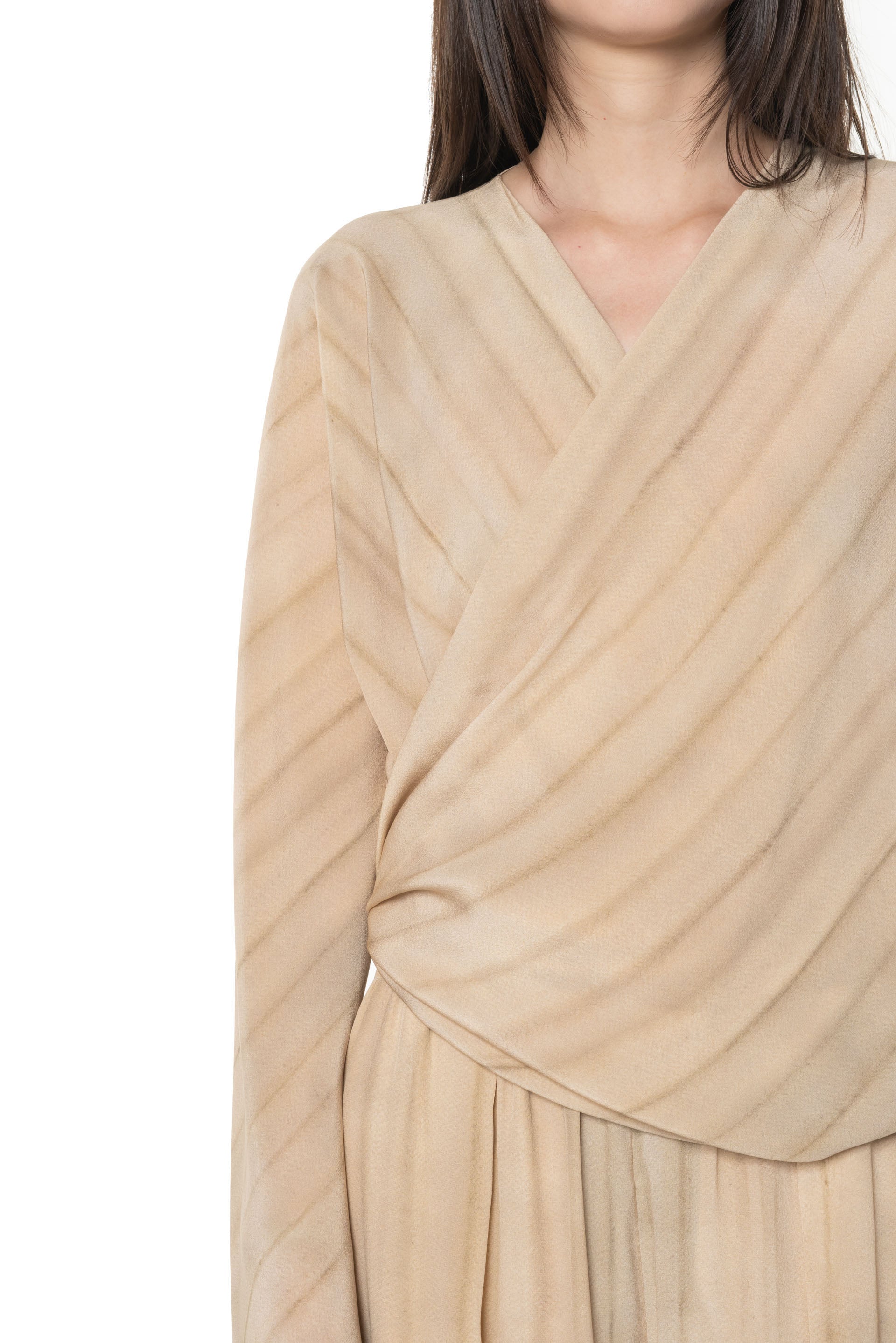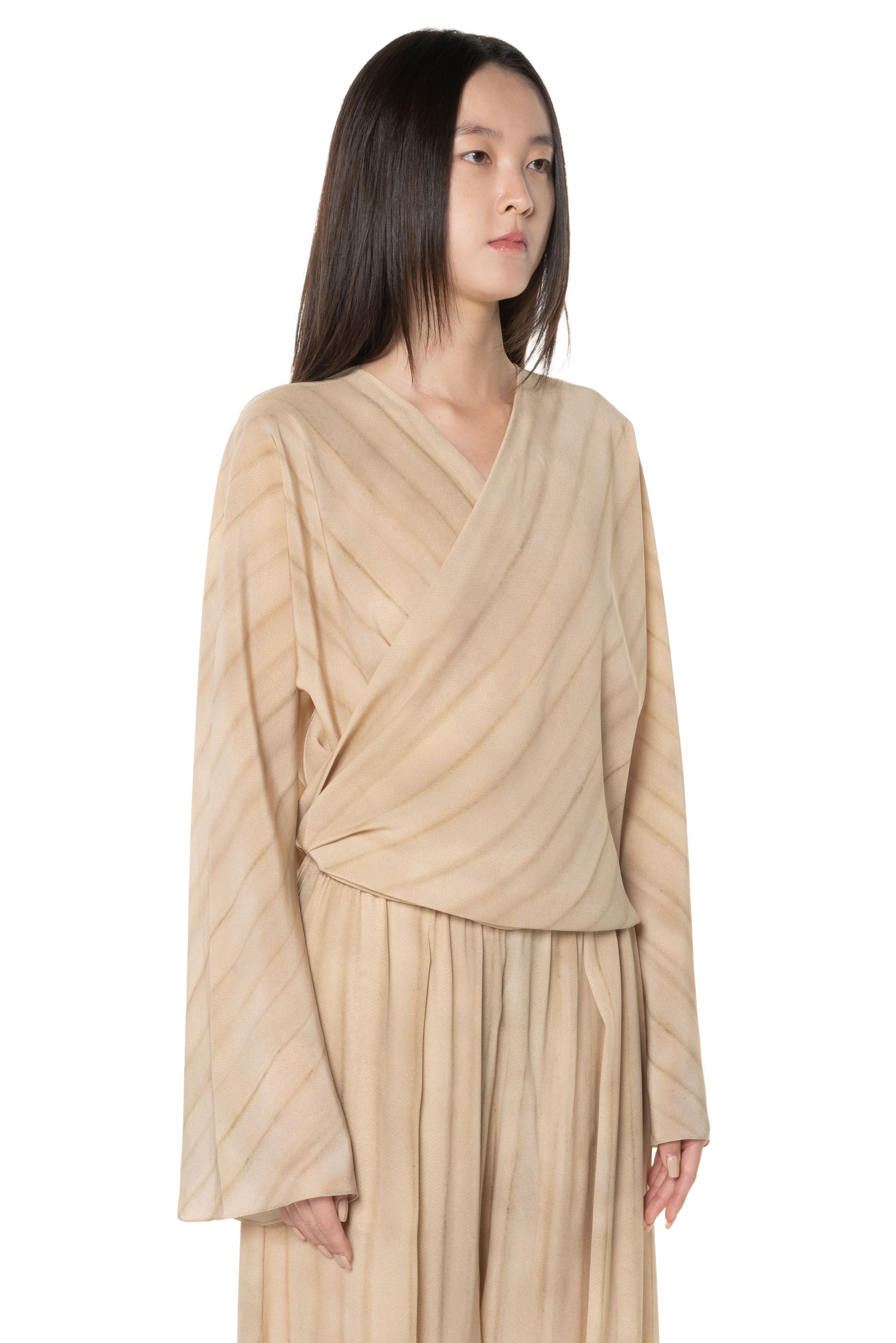 Cortana Fedra Print Shirt in Ivory. Wrap blouse with a V-neckline made of silk with an irregular striped print. The Fedra top ties in the back with two stripes of the same fabric. This exclusive print is based on a watercolour painting by Cortana's creative director. Perfect to wear with the matching Fedra pants.