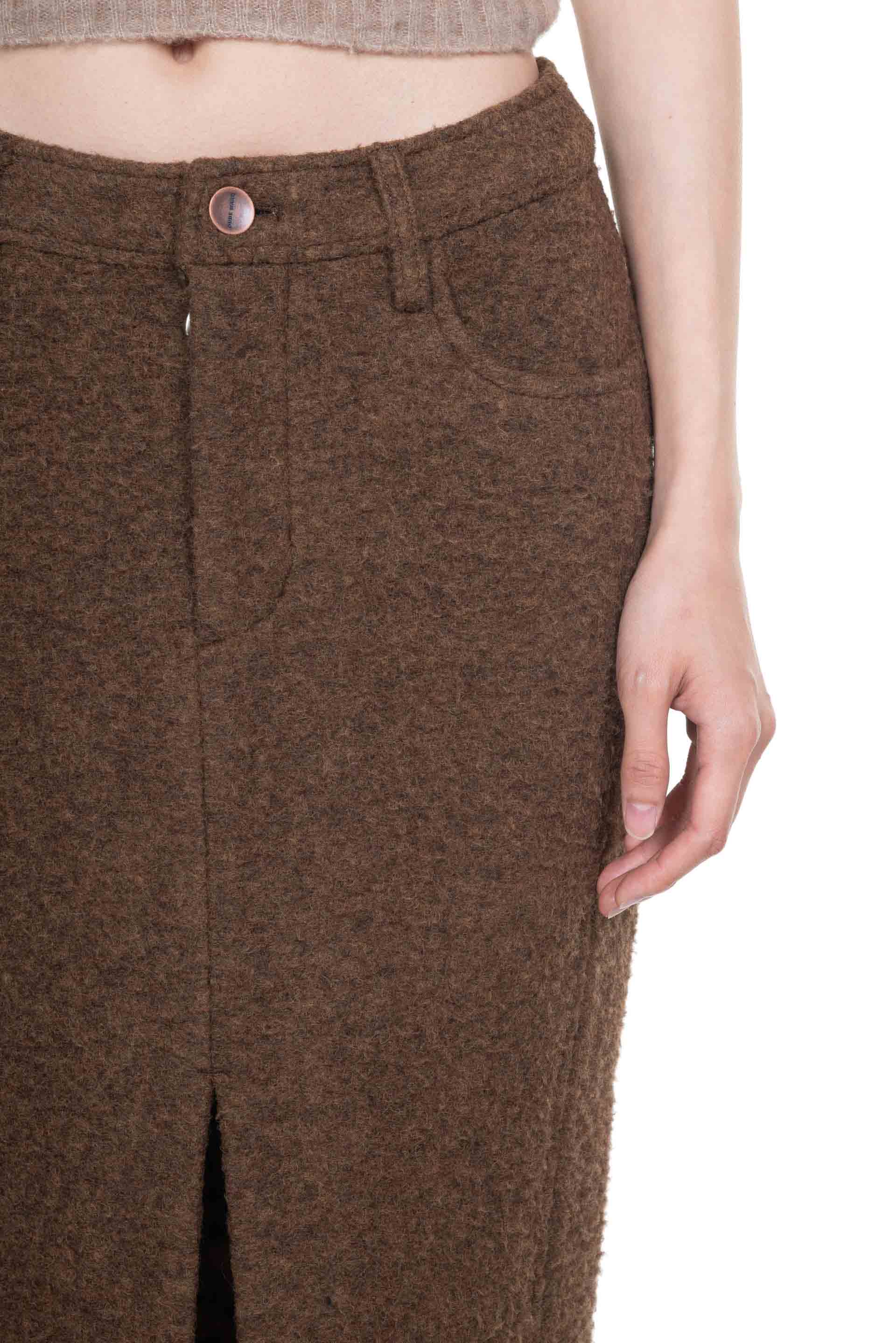 This felt midi skirt is cut from Japanese wool-blend, that is soft, structured, and stretchy. The boxy silhouette of this skirt exudes effortless sophistication and elegance. The topstitching adds a refined touch while maintaining a clean, simple aesthetic. The distinctive front slit not only enhances style but also allows for ease of movement.