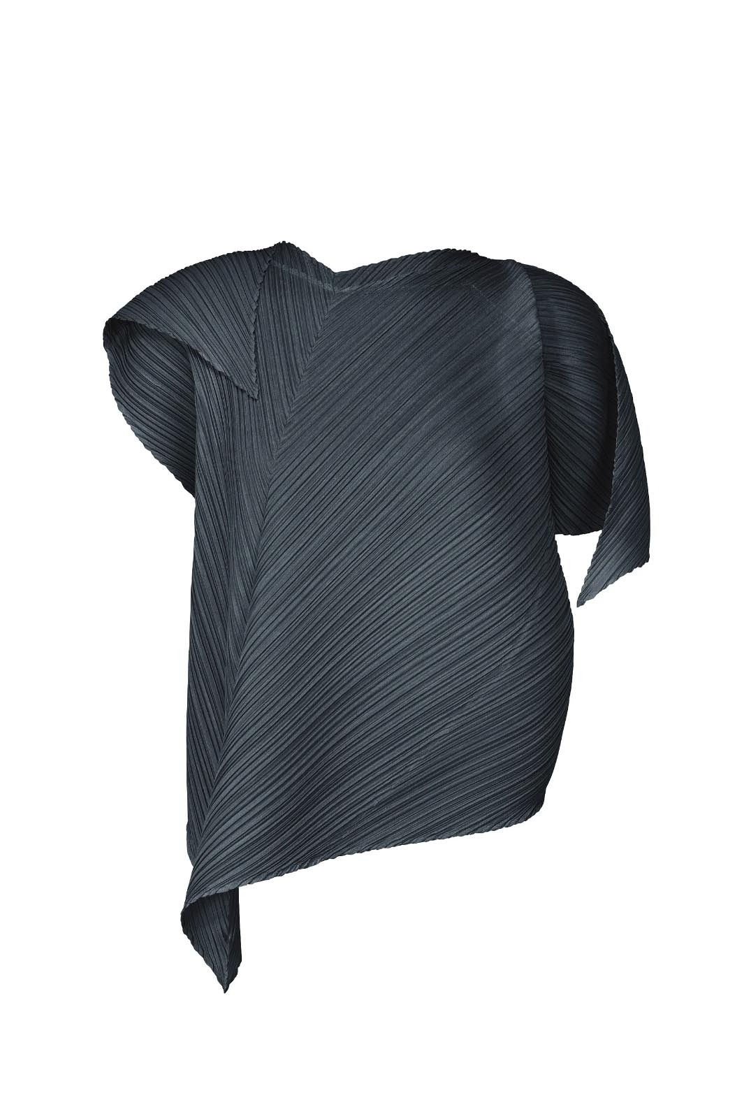 Pleats Please is crafted from a single thread, then creases are added after the clothes have been sewn into shape offering a combination of convenience, comfort and coolness. Pleats Please designs are simple with a strong silhouette as seen with the Flare Top Greyish Navy