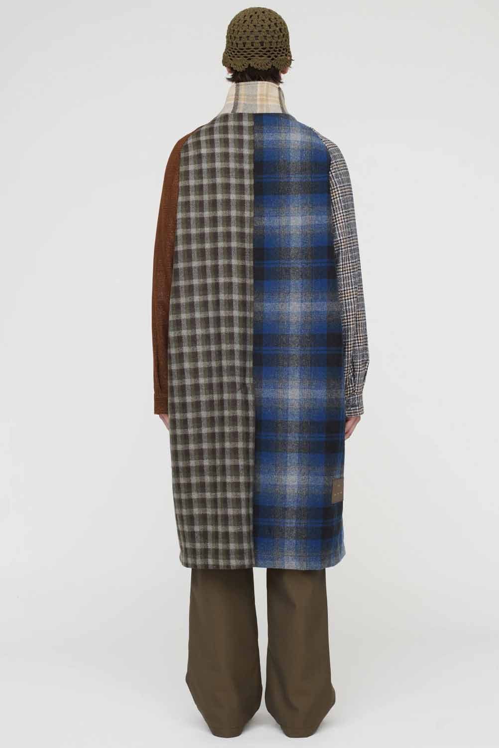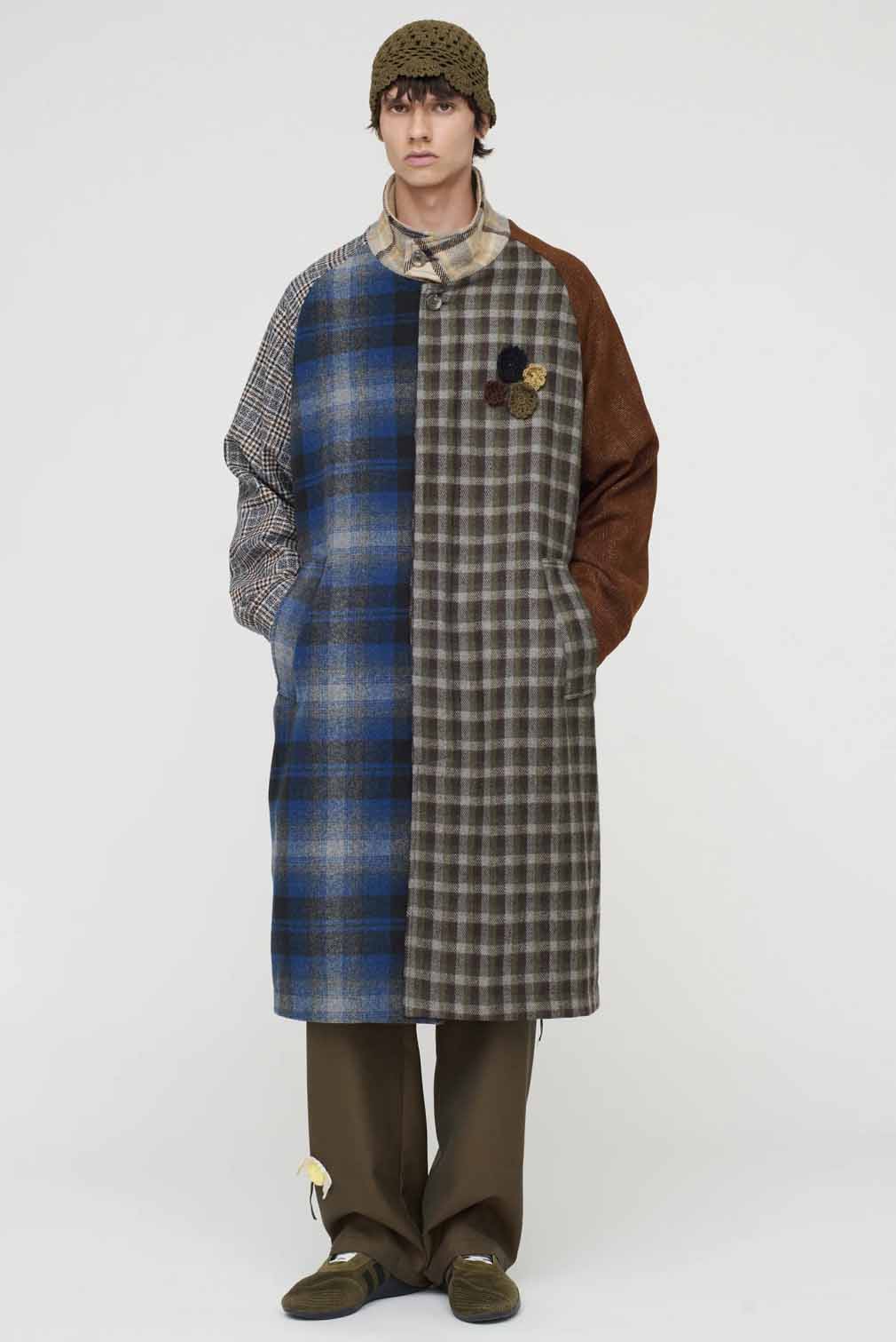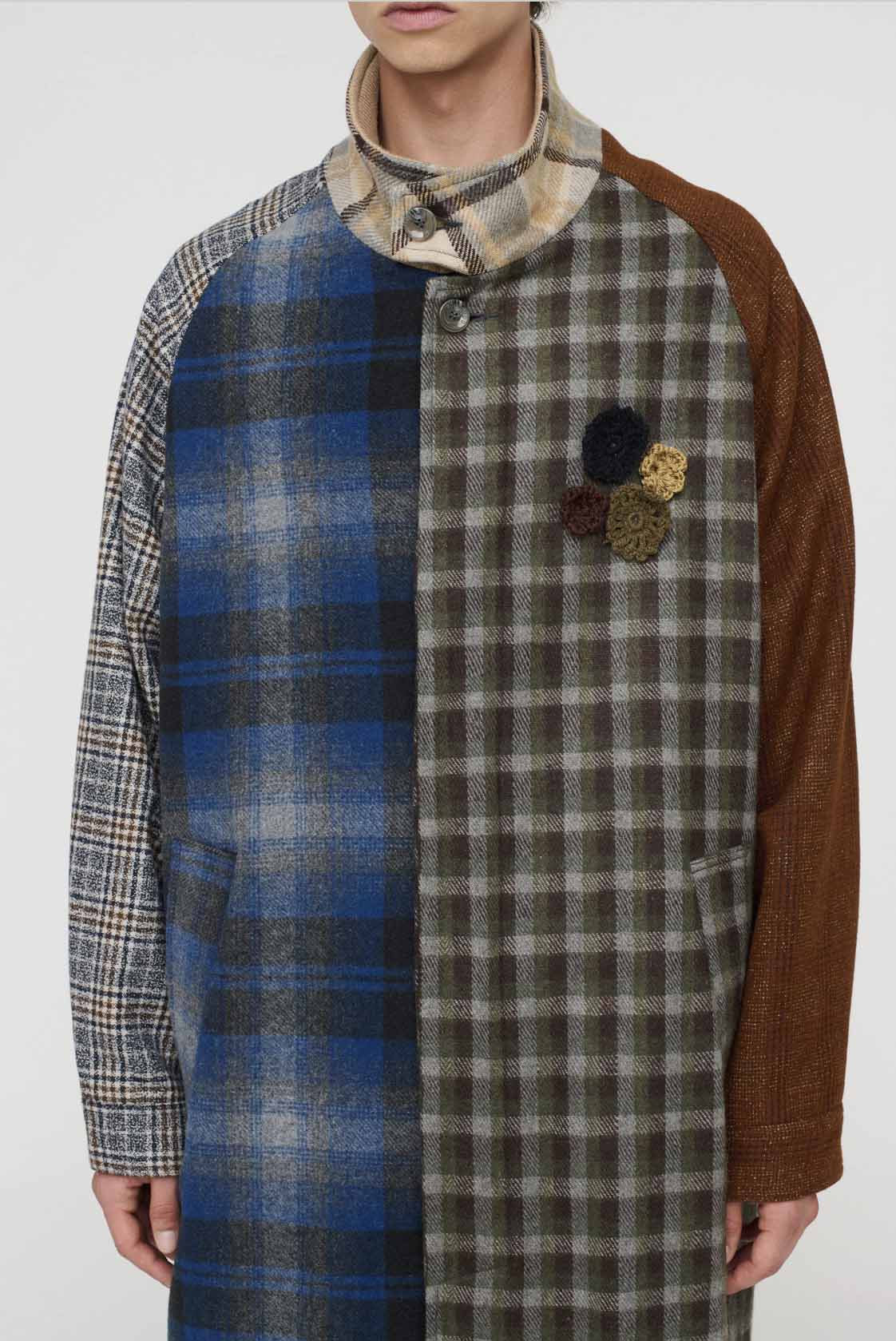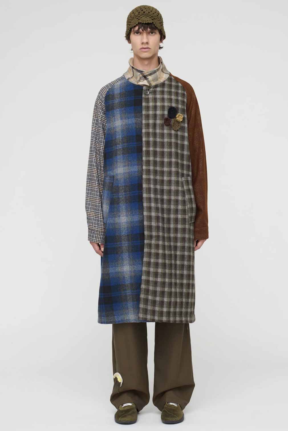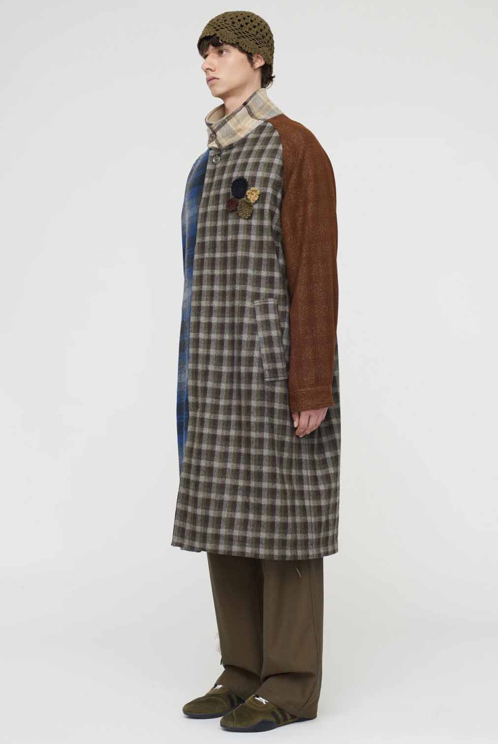 First introduced in 25.2 ‘Sunflower’, the Flight Coat is a full-length silhouette featuring a high neck with tonal ribbing along the collar. Drawing inspiration from 1940s flight jackets, known for their protective high collars and functional raglan sleeves, this piece reimagines the utilitarian classic in a contemporary, elongated form. Constructed from four contrasting wool checks in blue, beige, green, and burgundy, it offers a striking interplay of colour and pattern.