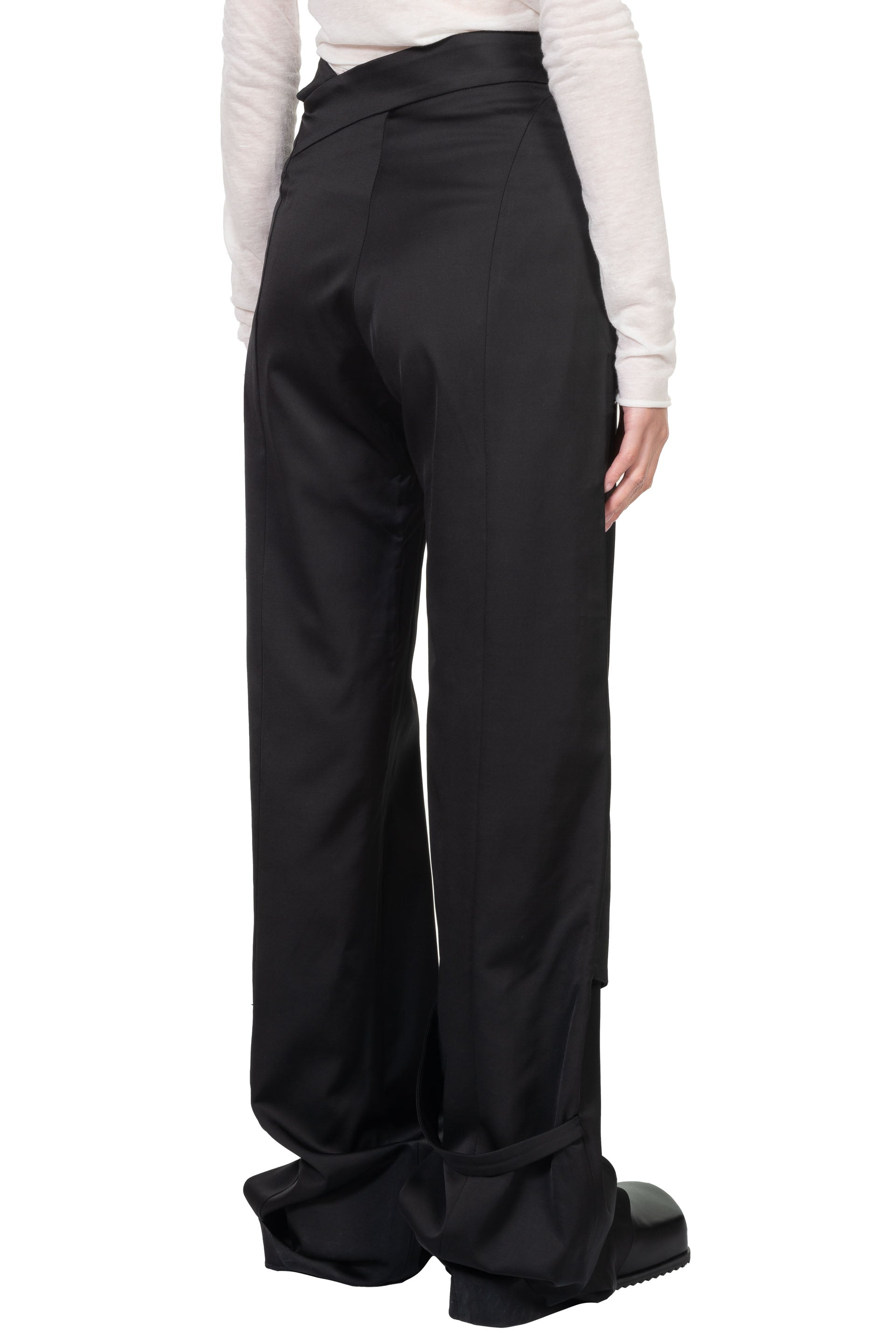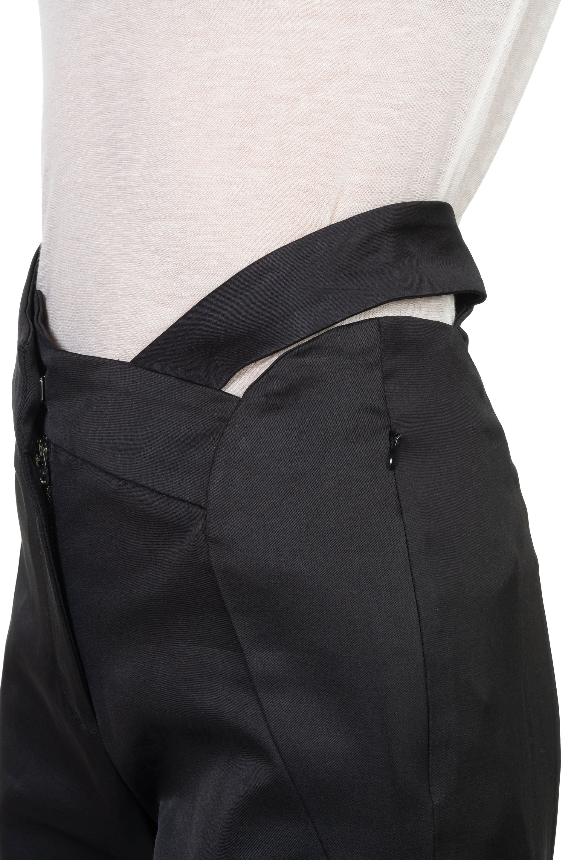 Fluid Viscose fabric. Fabric made in Italy. Wide legs with shaped seams details. Shaped waistband with cut out at front hip. Blind zips at inner leg seam. Layered panel with front slit at right leg. Layered panel with G-hook closure at left leg.