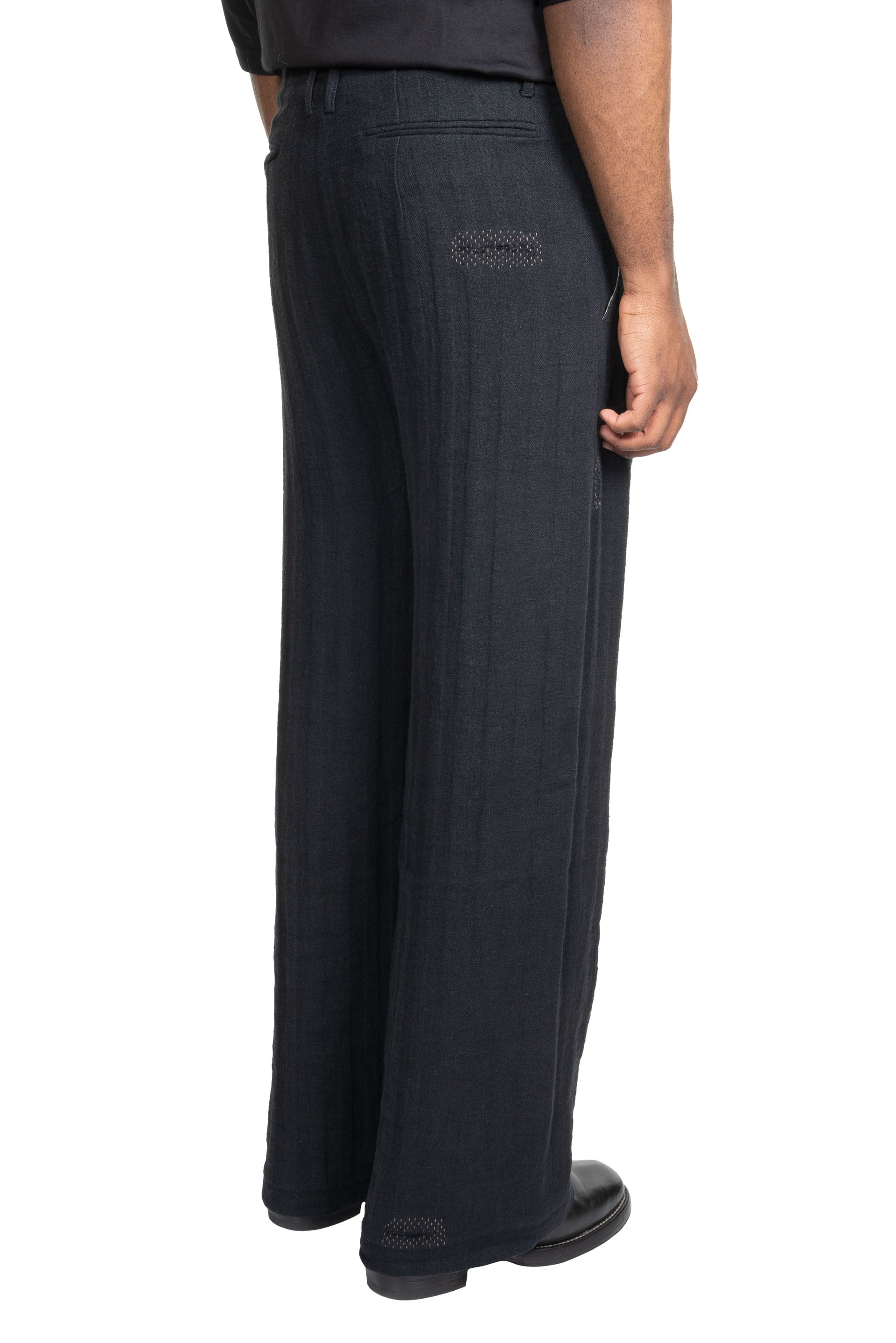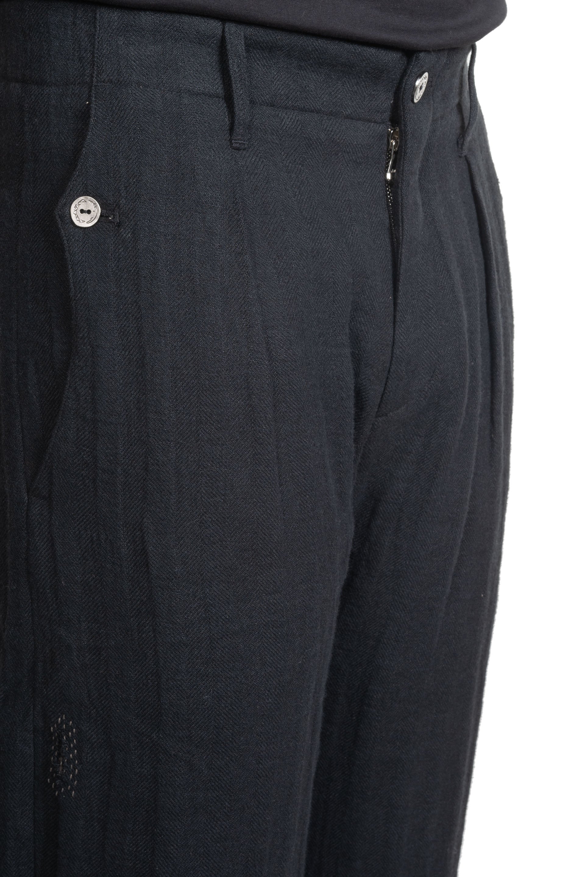 Professor E Forgotten Material Pants. Button closure at waist. Two side pockets with button closure. Two back pockets. Forgotten material metallic buttons details. Frayed details throughout. Soft and light wool fabric. Signature stitching and distressed details throughout.