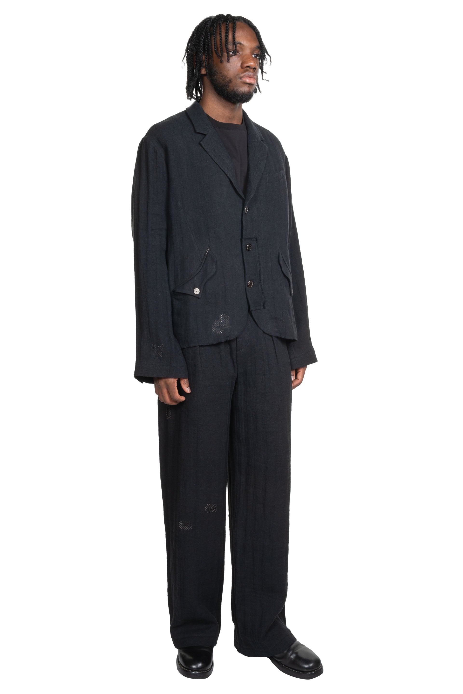 Professor. E understands the time of aesthetics from the use of cotton, hemp and wool. Fabric stitching, patching, designs without edge trimming, deconstruction, and reproduction are all Professor. E's signature elements creating classic immortal designs that can be viewed with the FM 0222 Pants Frayed Black.