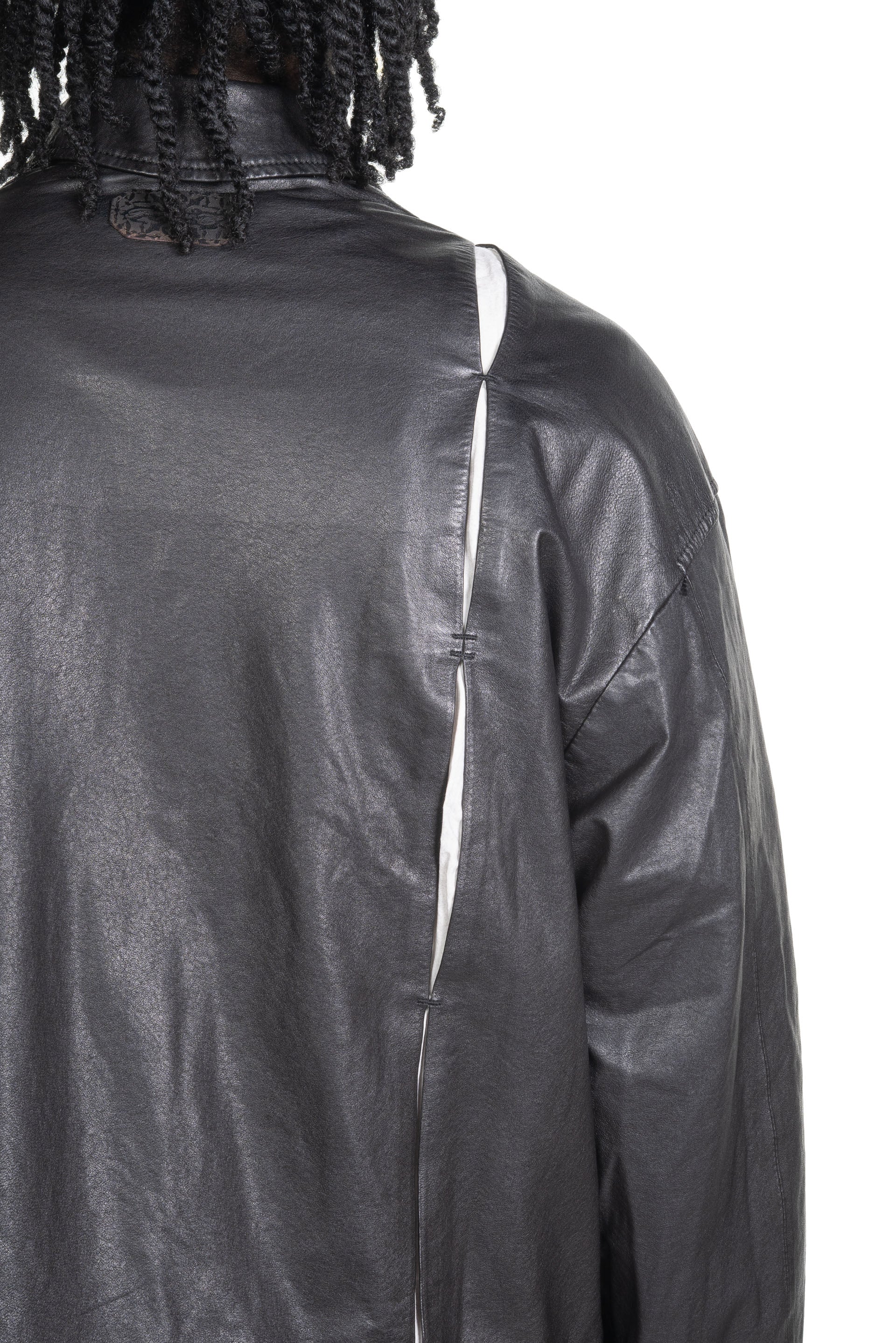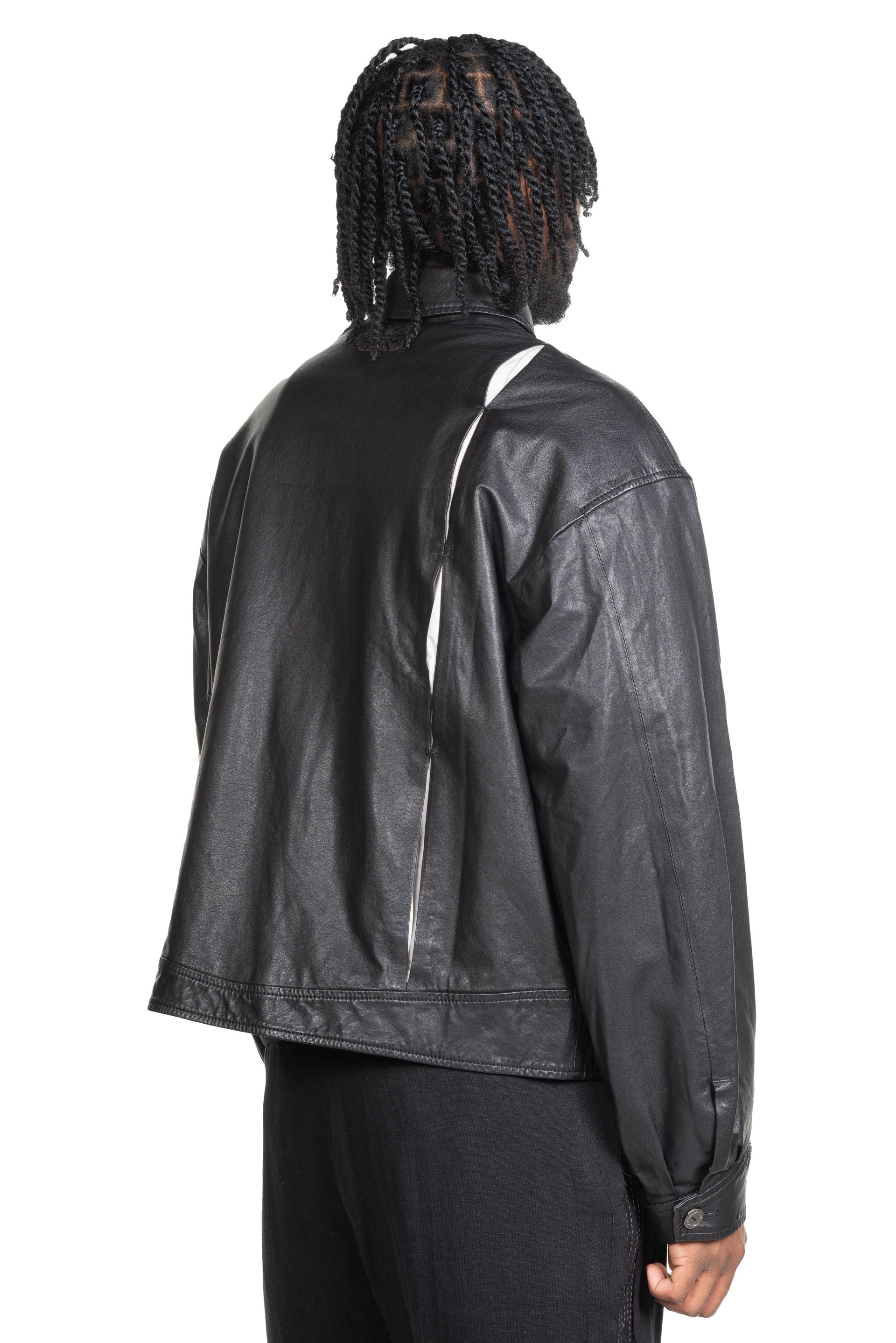 Professor E Forgotten Material leather Jacket. Button closure at front. Long sleeves. Raglan sleeves. Cropped and boxy fit. Two side pockets. Signature slit details at back. Lined with signature linen lining. Forgotten material metal button.