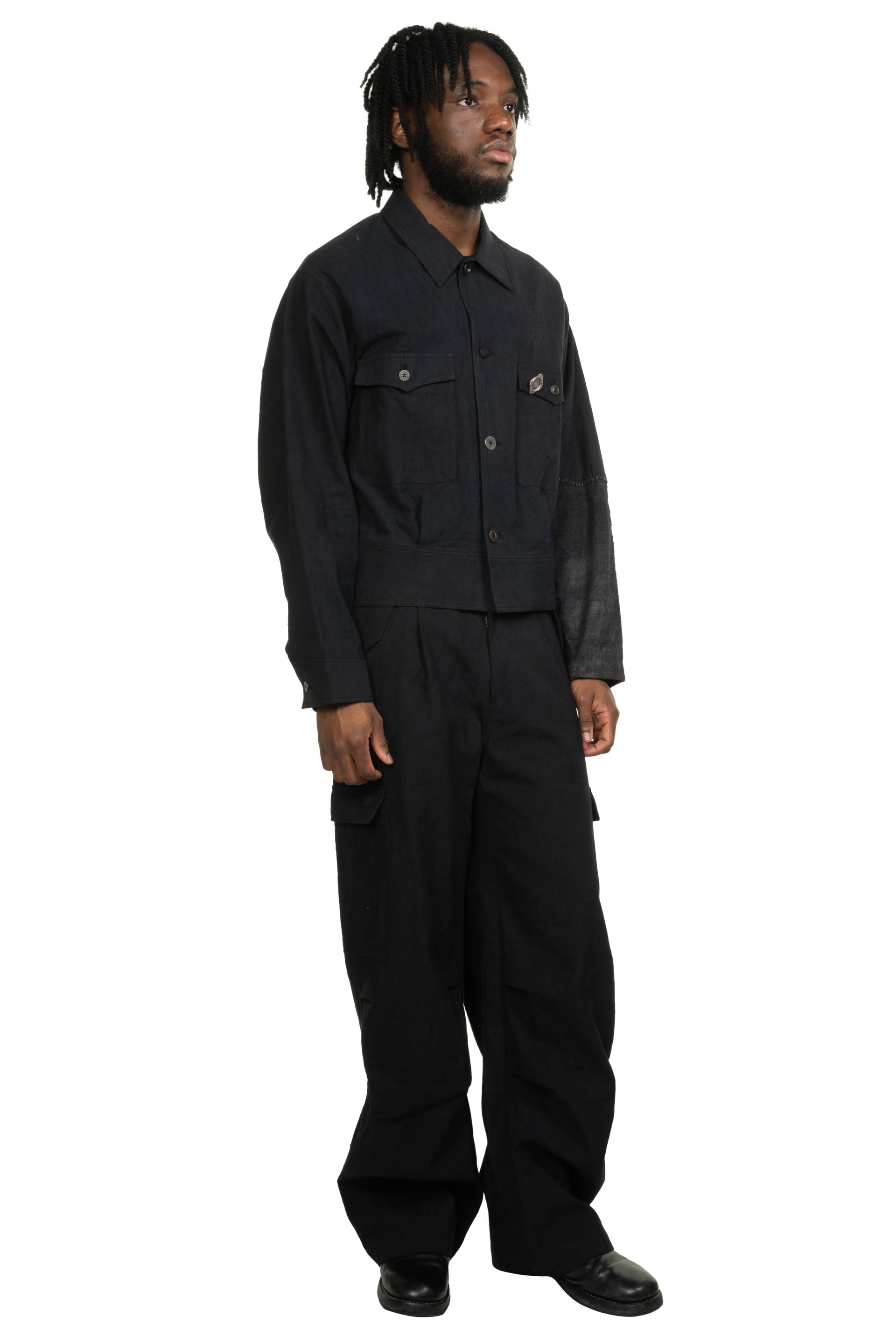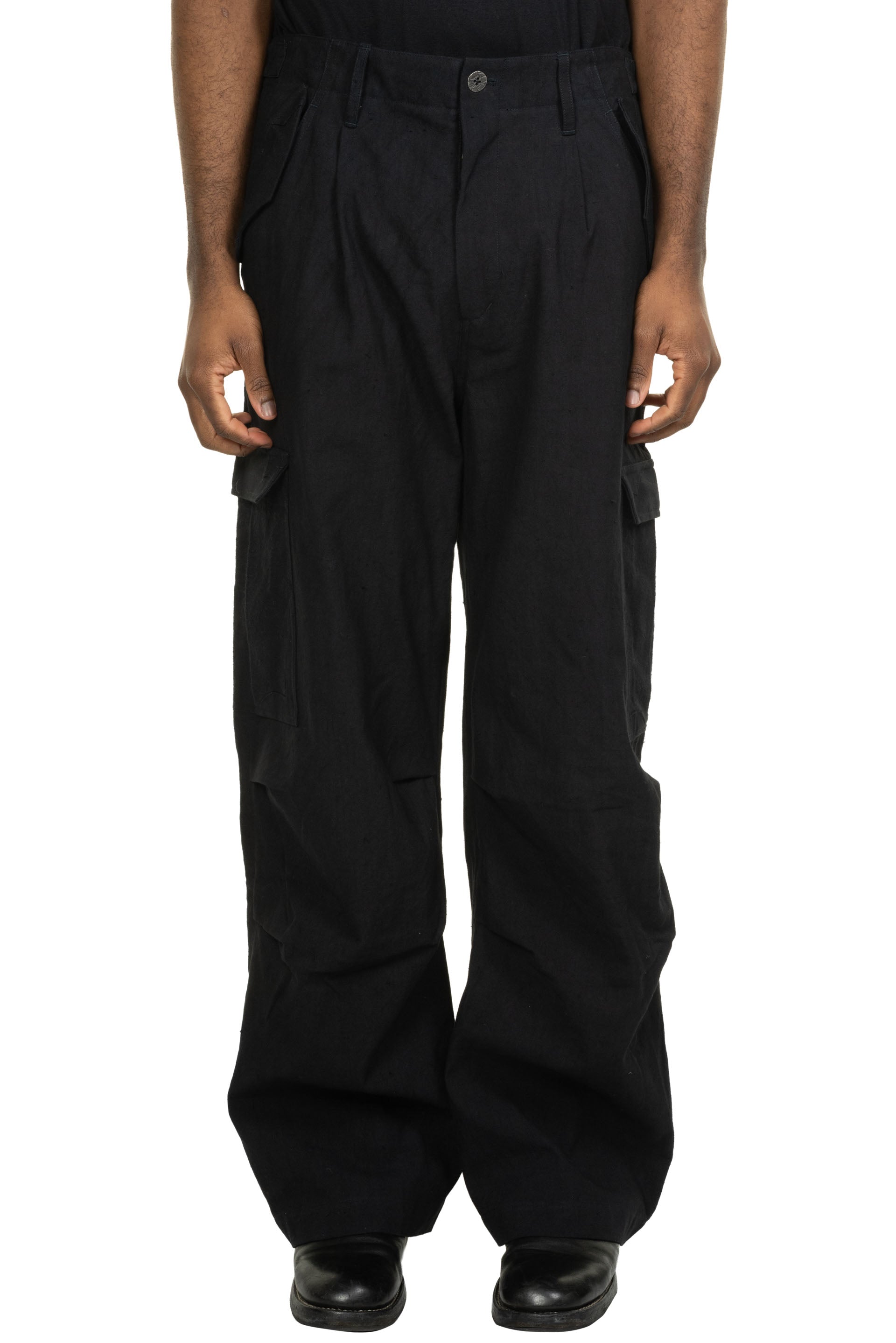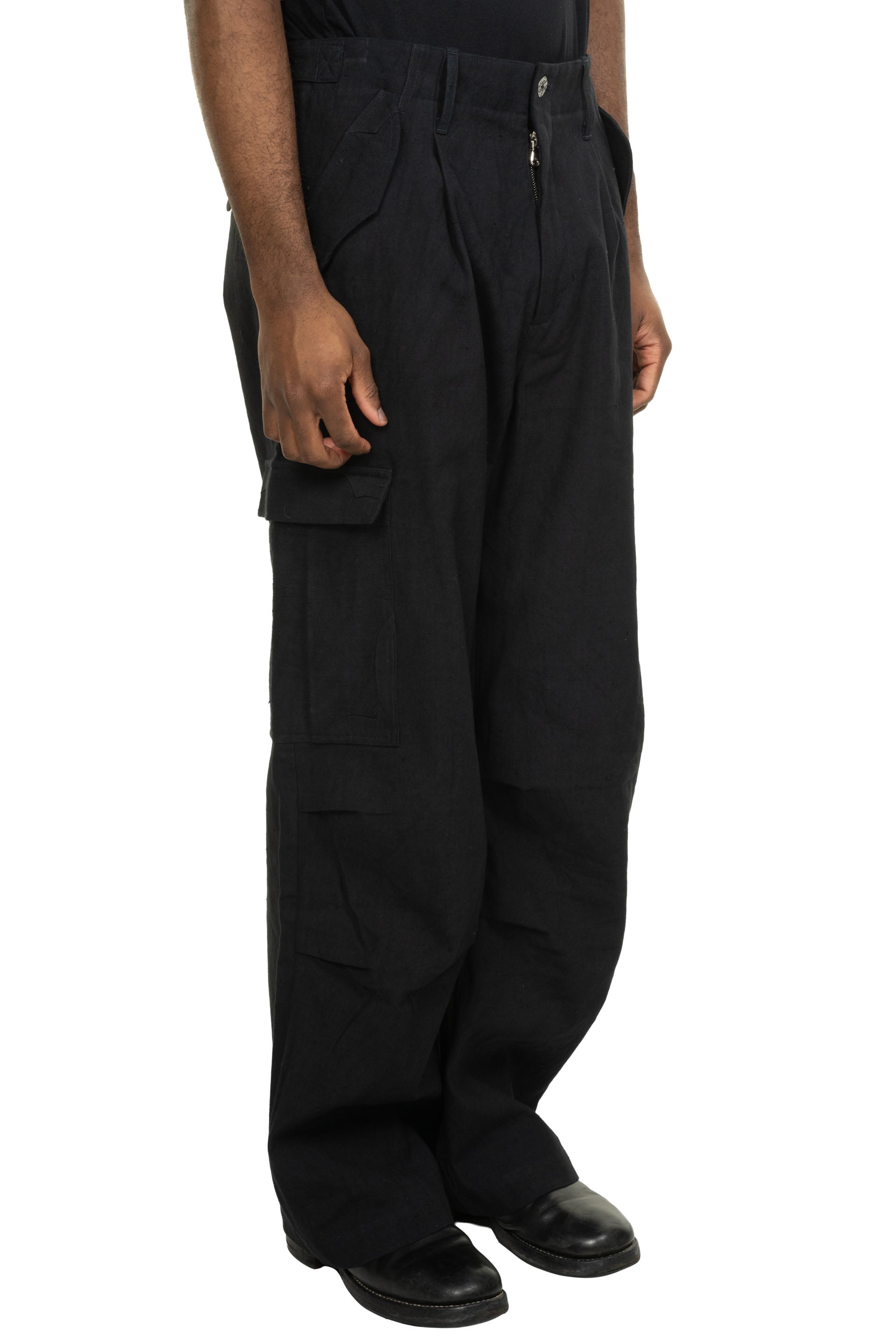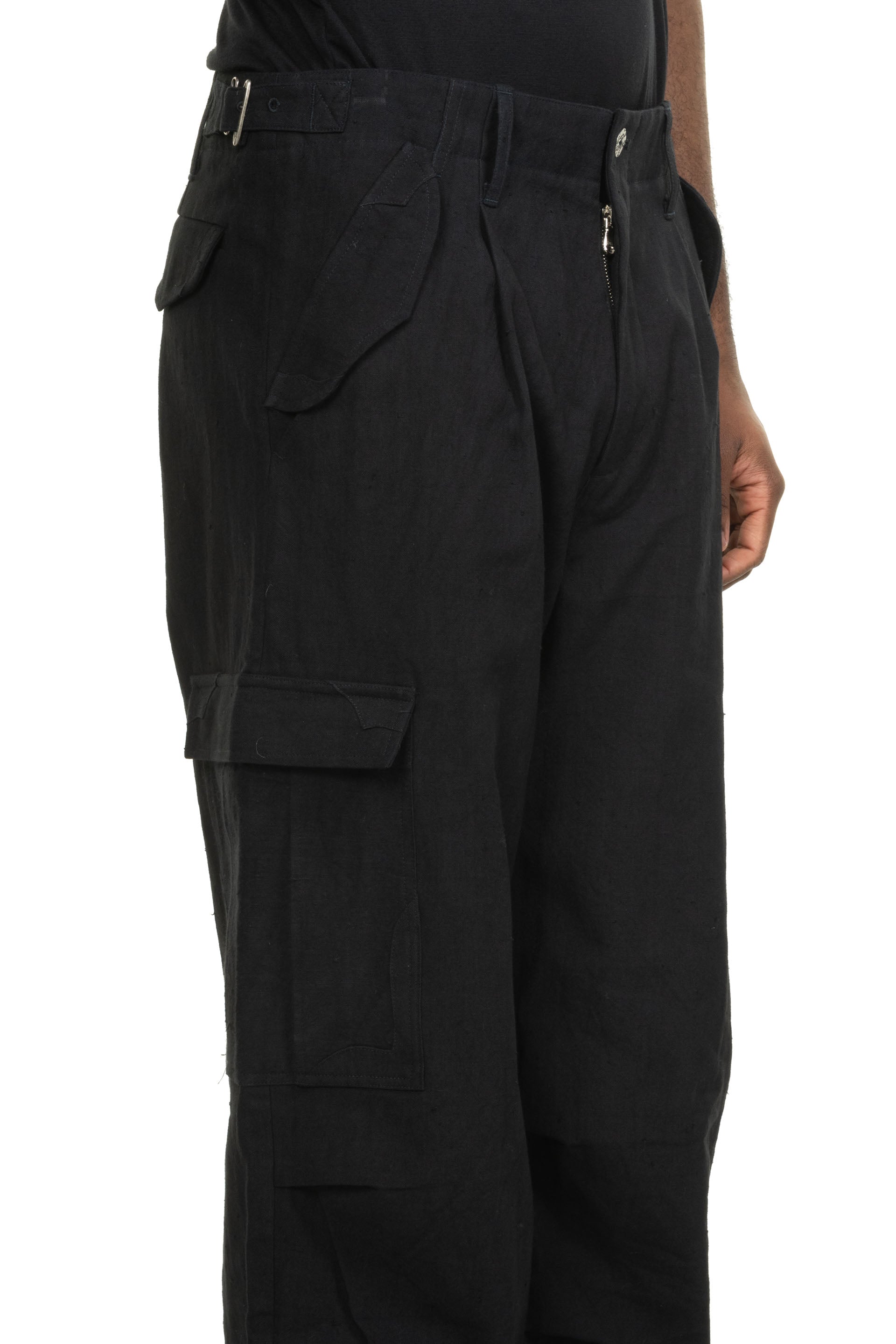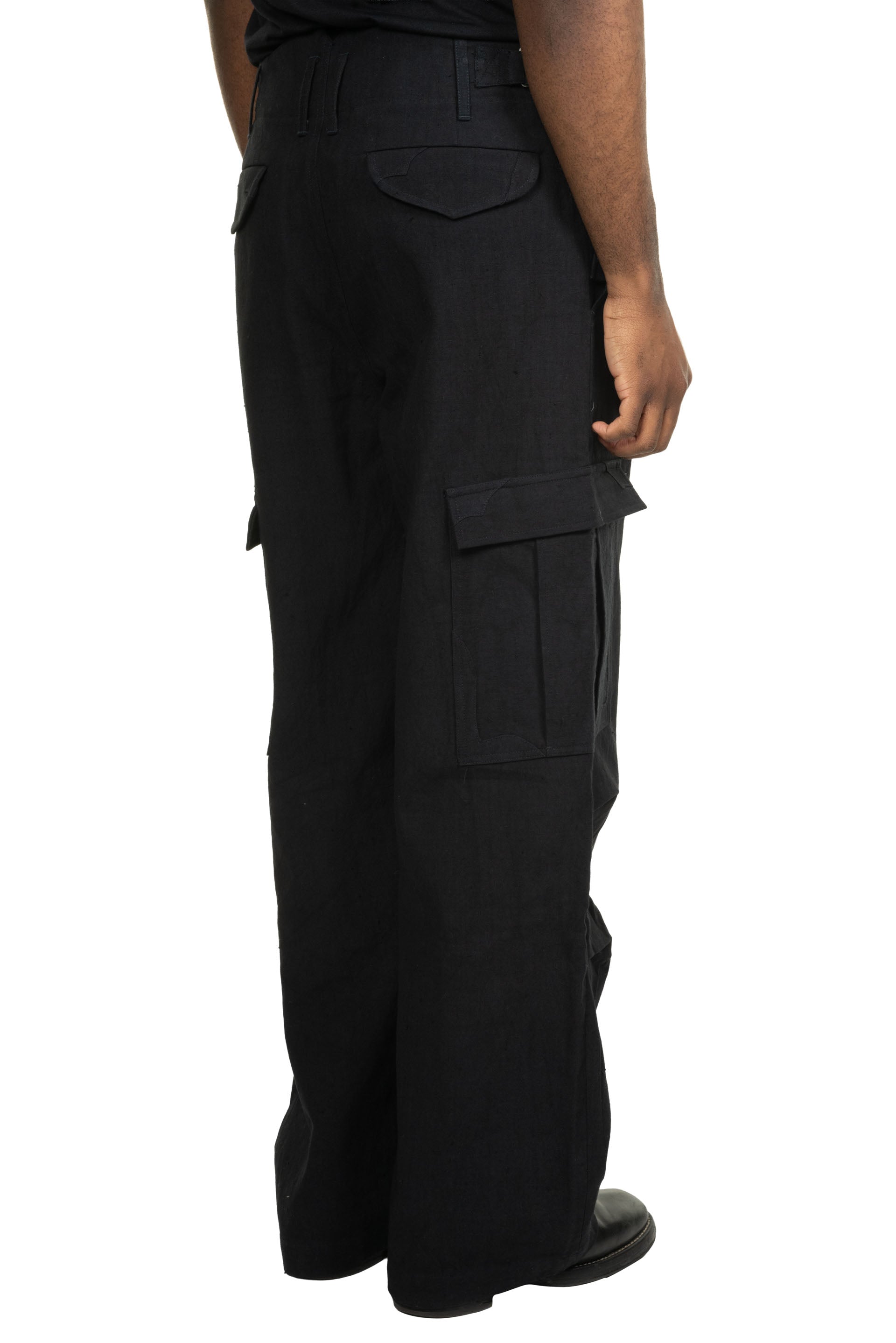 A refined take on the iconic M-51 Cargo Pants, this piece seamlessly integrates the distinct design language of "E" into a new, elevated context. Constructed from purely handwoven cotton and naturally dyed to a profound blue tone, it highlights an artisanal approach to utility wear. The pants are finished with custom-developed metal hardware and a signature adjuster buckle.