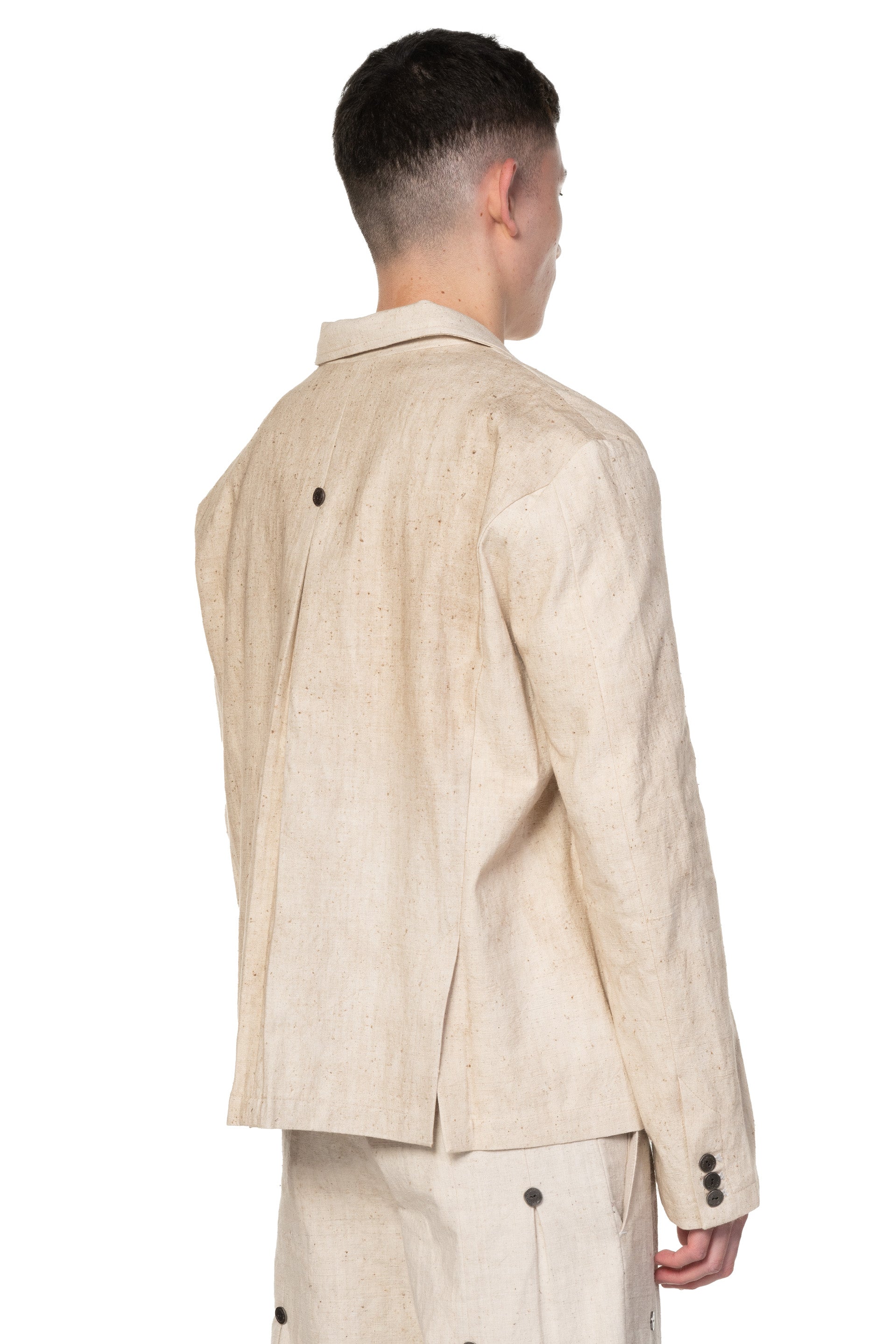 Professor. E Forgotten Materials E Jacket. Linen blazer. Two button closure at front. Forgotten material metallic buttons details throughout. Pleats details at front and back. Two front pockets. Lined with signature lining. Boxy fit.