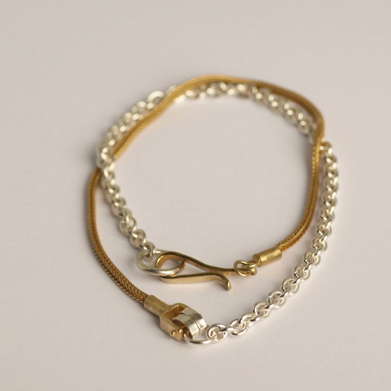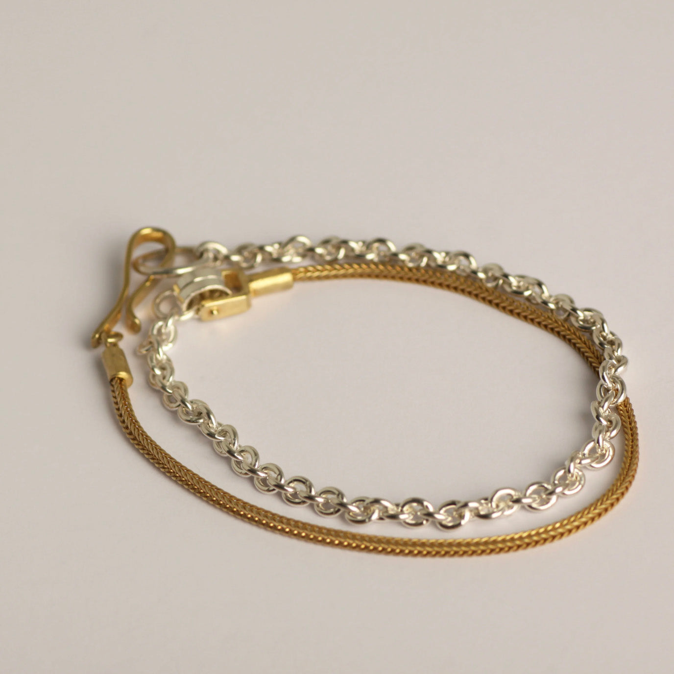 The iolom Foxtail Chain Bracelet merges traditional metalworking with modern sculptural design. Crafted from silver and gold, its interlinked foxtail pattern creates a subtle rhythm of texture and light, celebrating material integrity and refined craftsmanship.