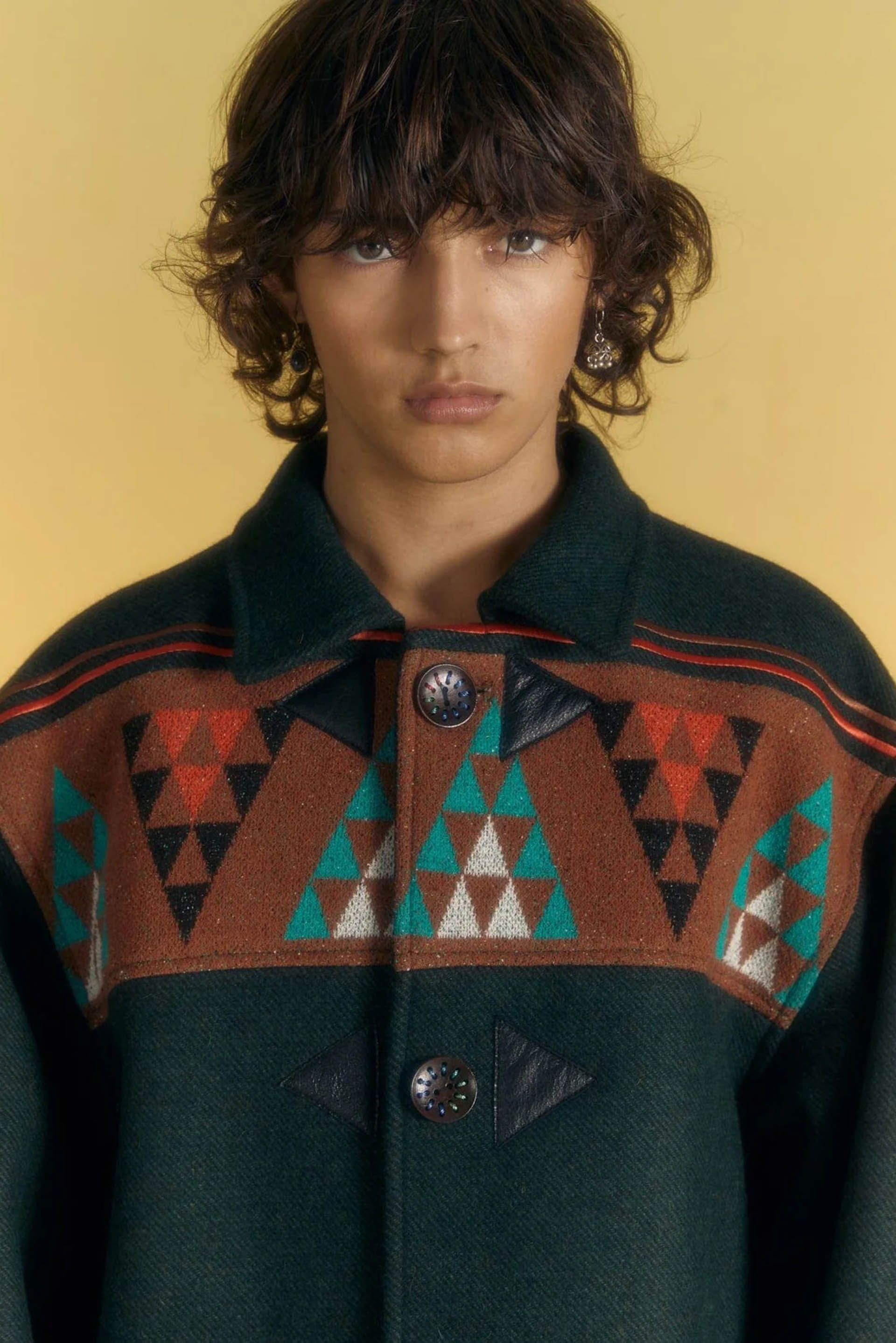 Long Sleeves. Oversized silhouette. Wool blended knitted fabric. Embroidery stripe at front. Knitted fabric.  Cow Leather patched. Patch pocket. Embroidery stitch detail button
