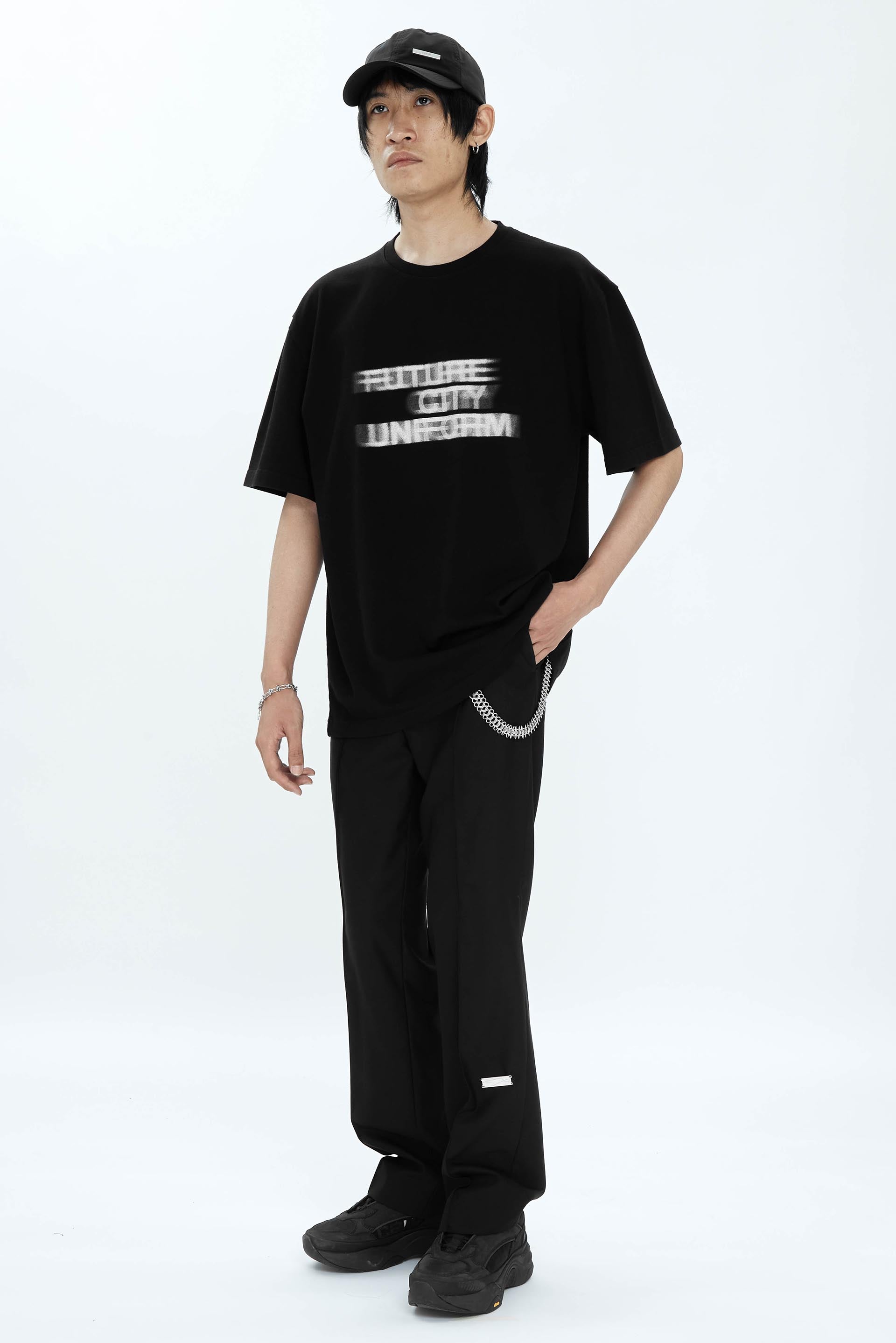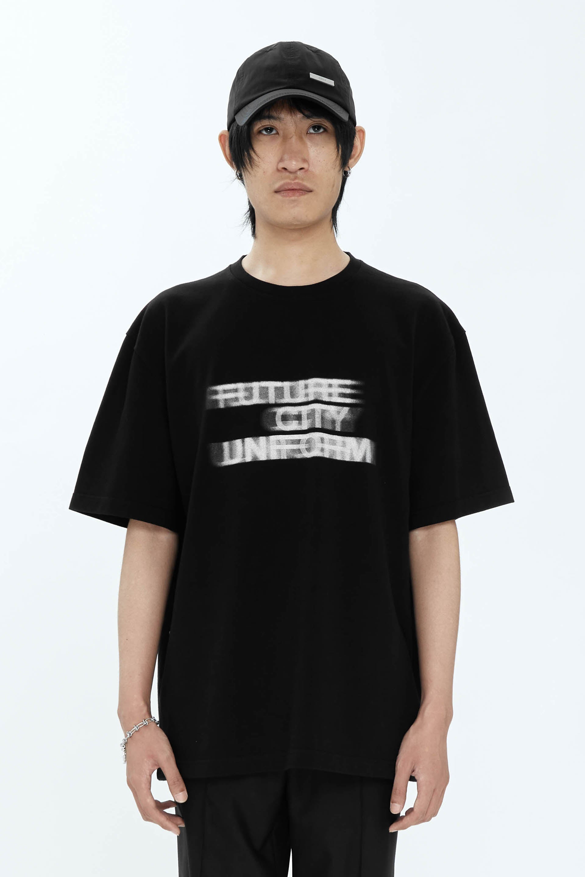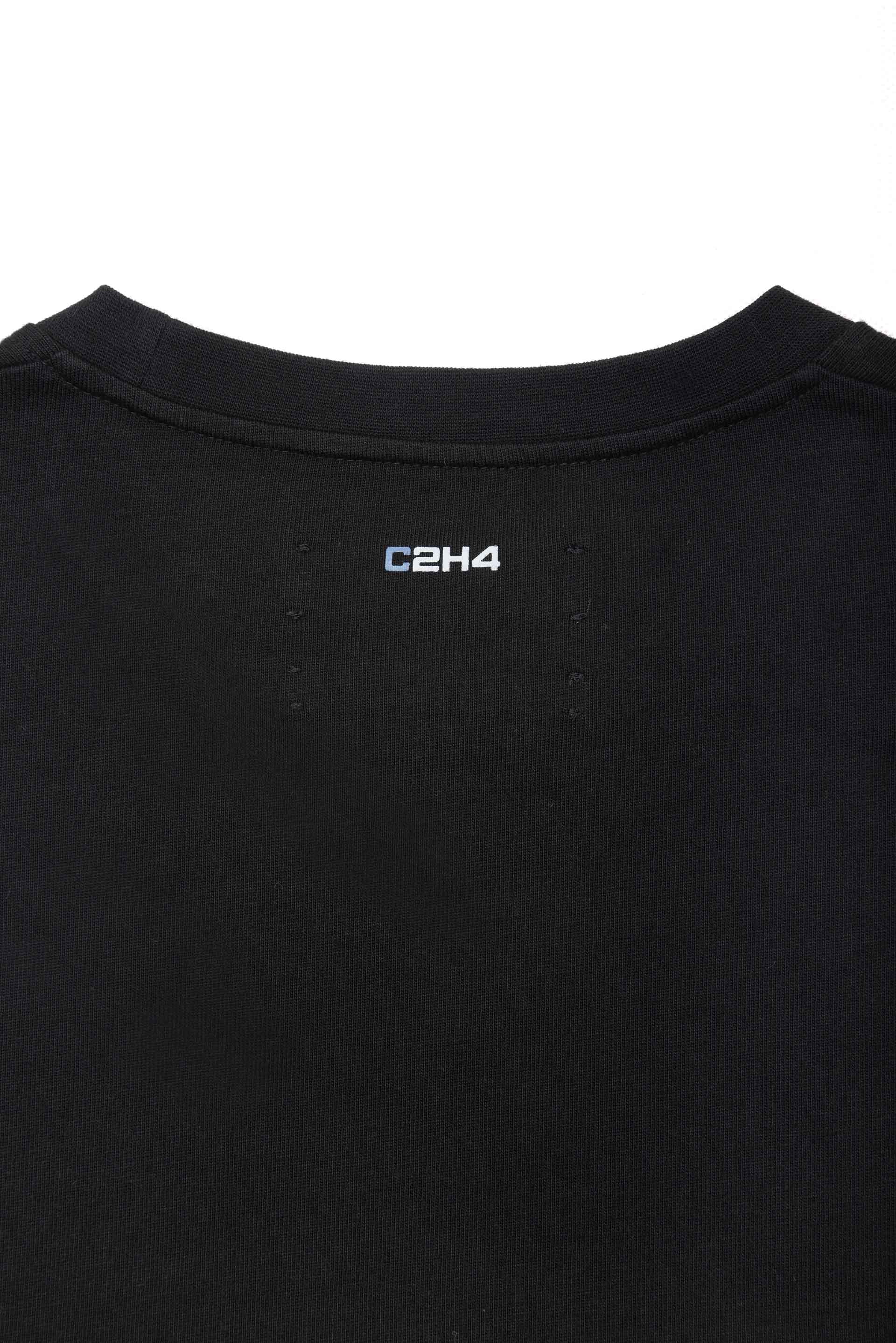 Round neck T-shirt from C2h4. Future City Uniform Blurry print at front. C2h4 Logo printed at back.
