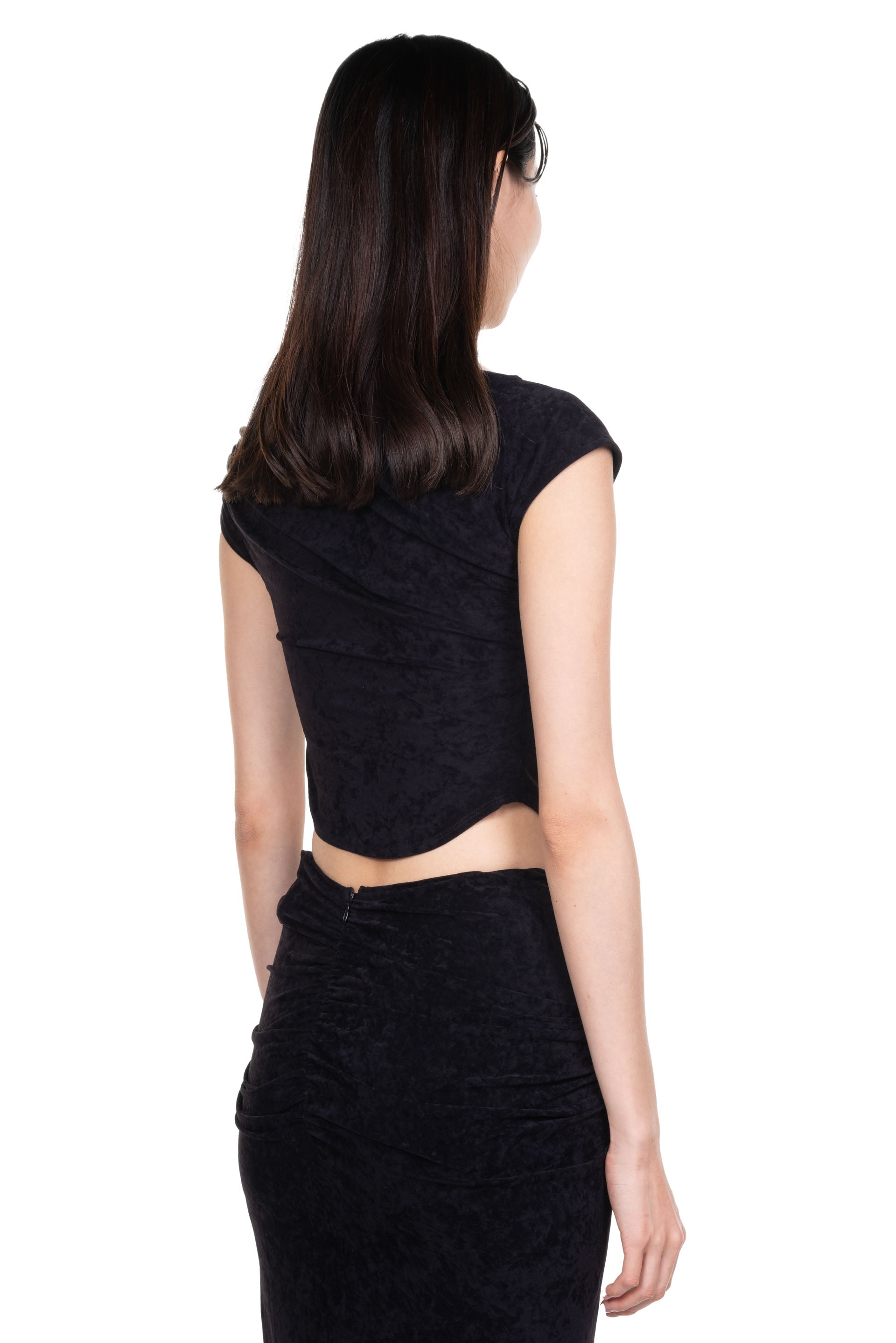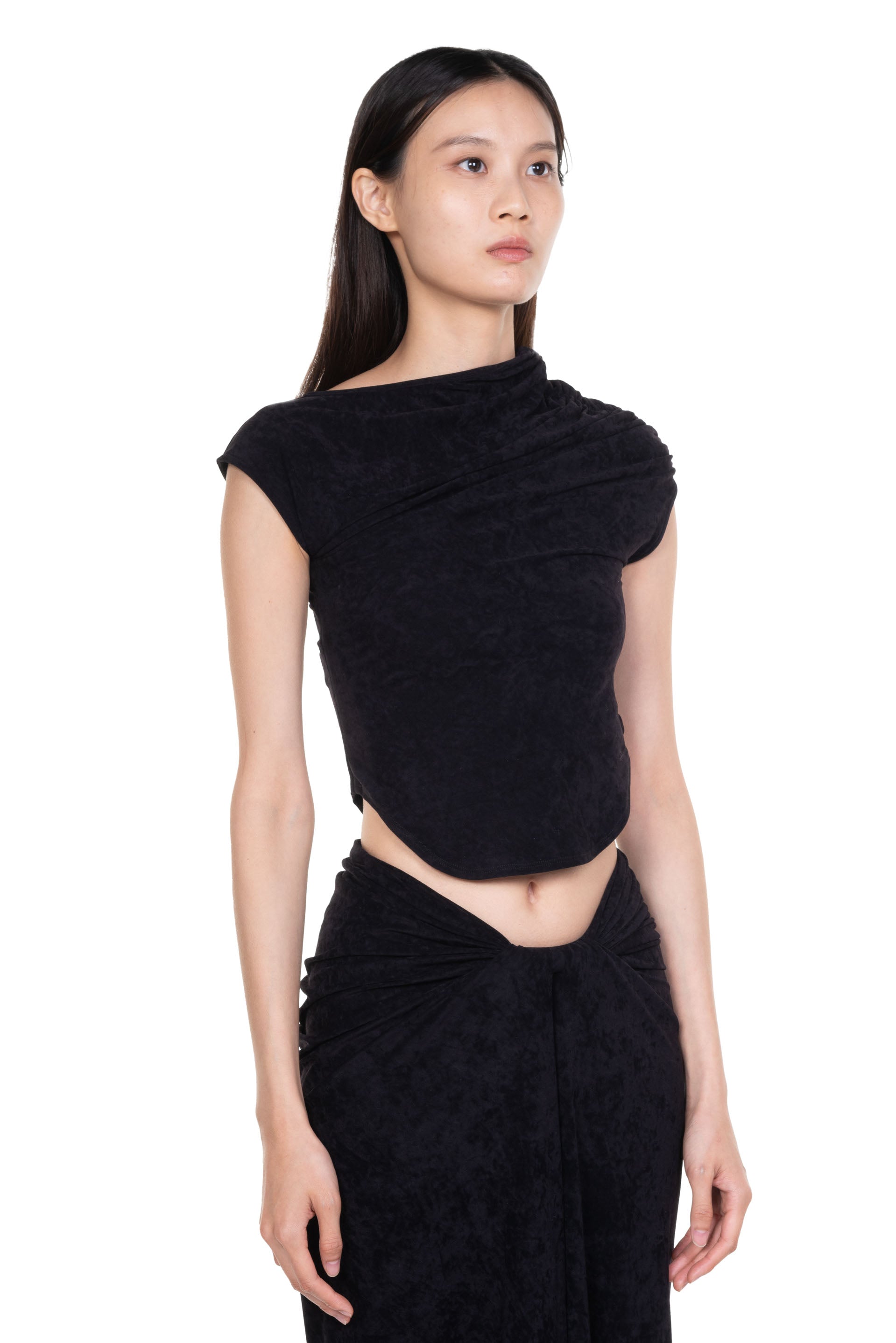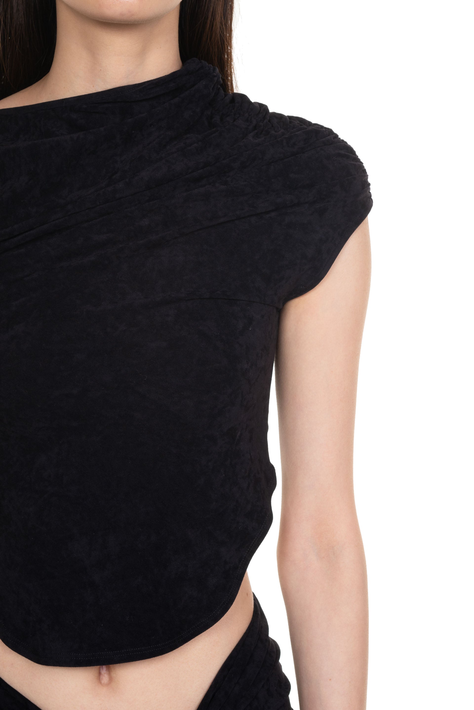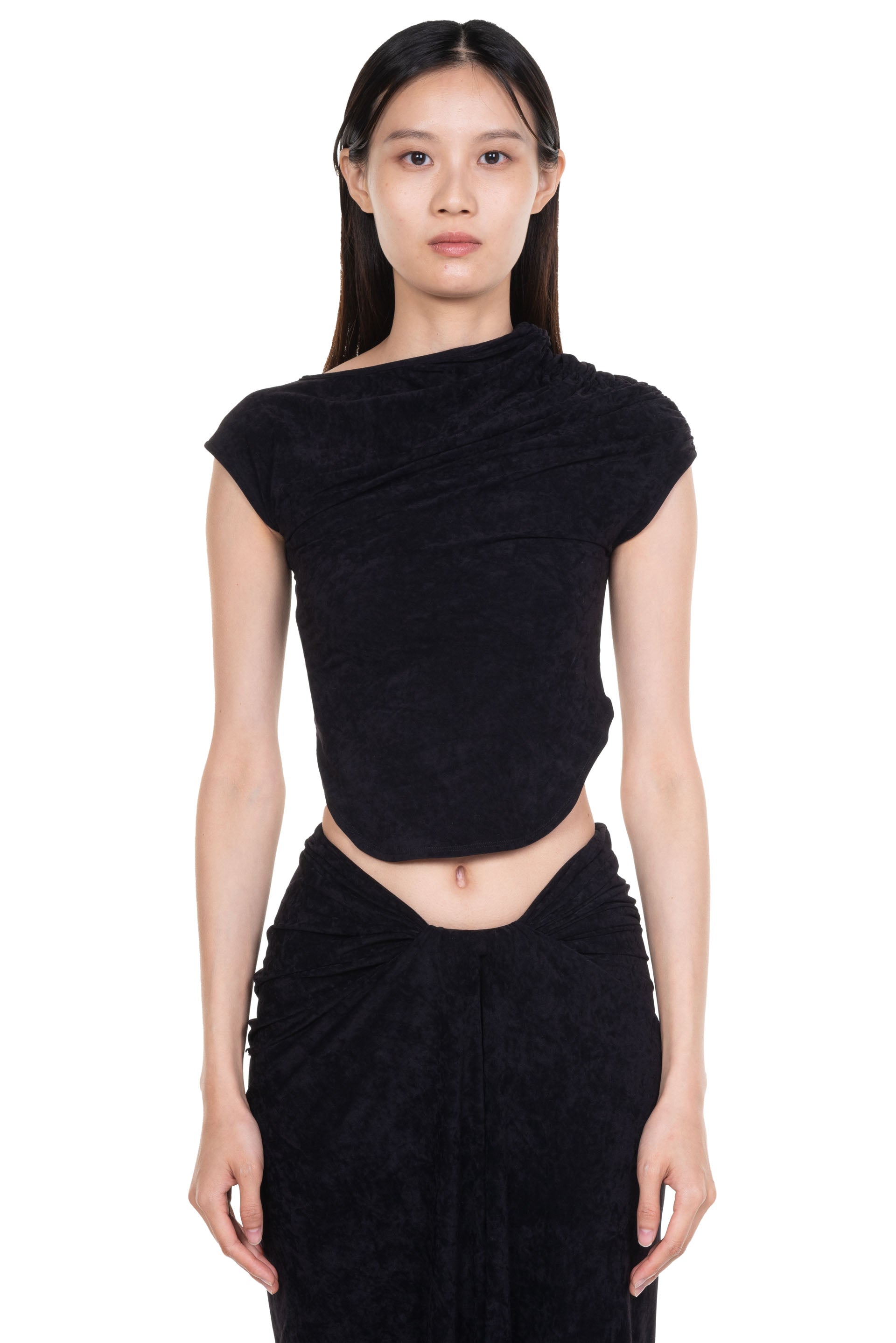OUDE WAAG strikes a balance between Asian aesthetics and Western cutting. It is at the heart of designer’s philosophy: celebrating the power of women, yet simultaneously critiquing the ongoing objectification and idealisation of the body as you can see in the Oude Waag "Burn" collection with the Gathered Velvet Jersey Top Black.